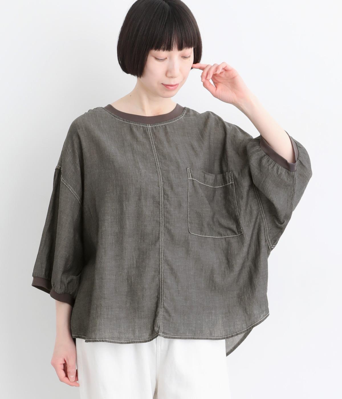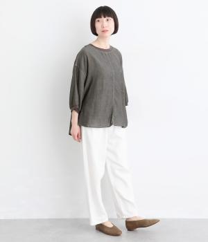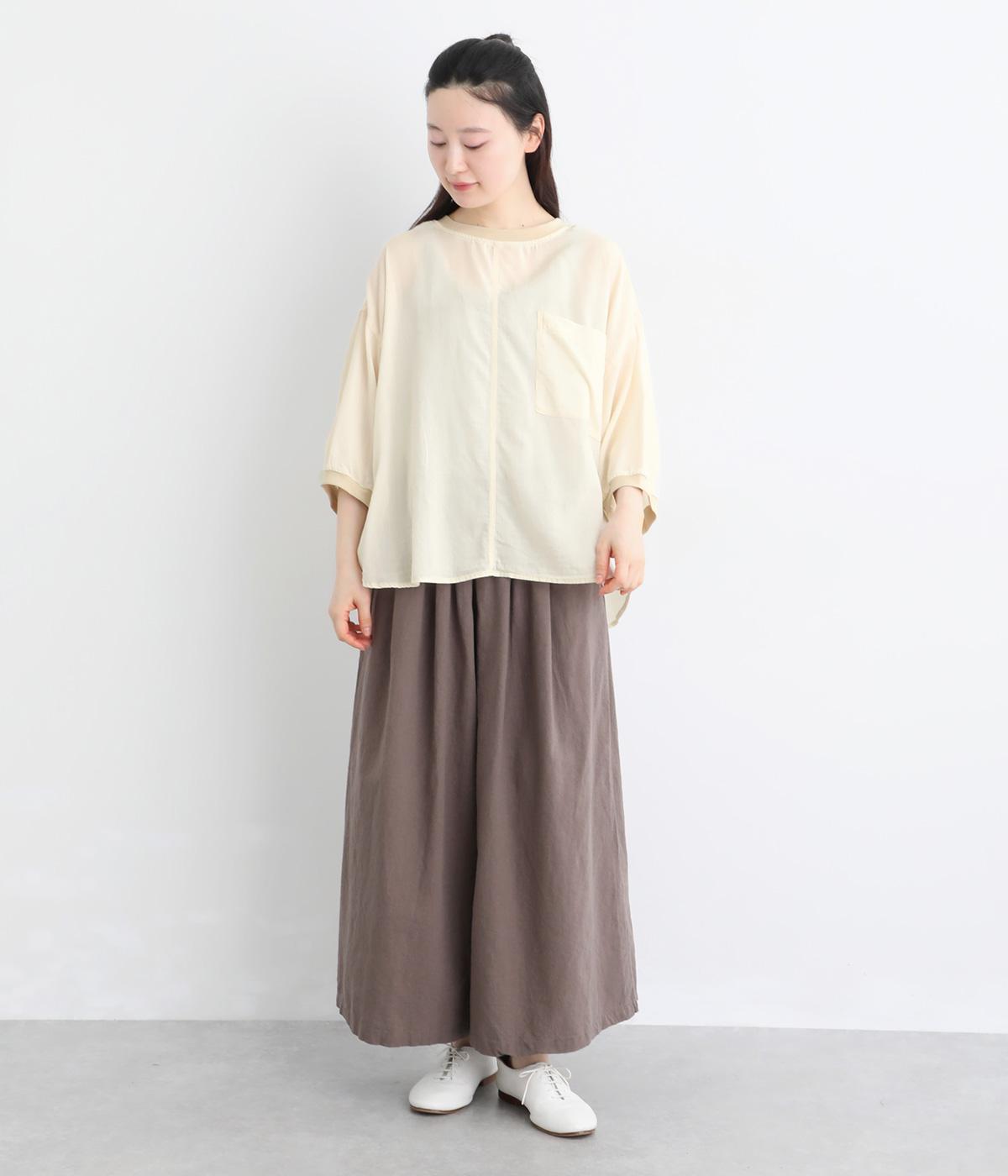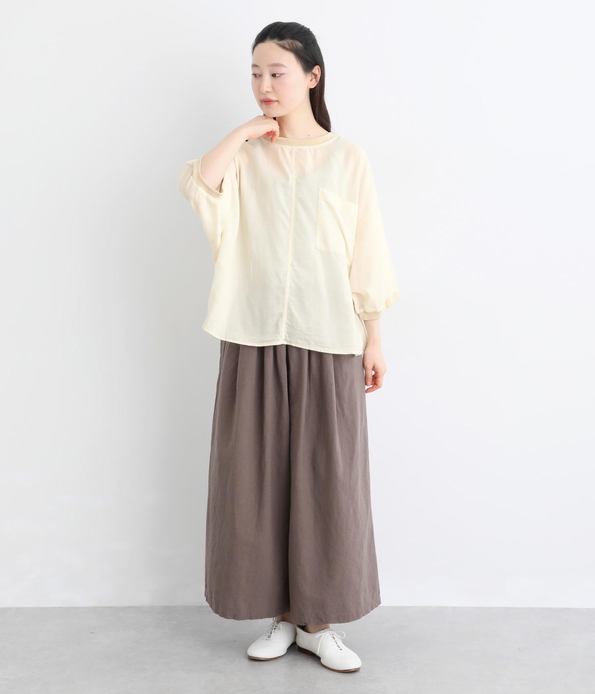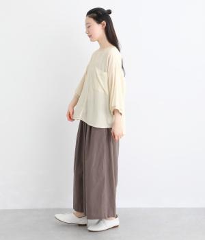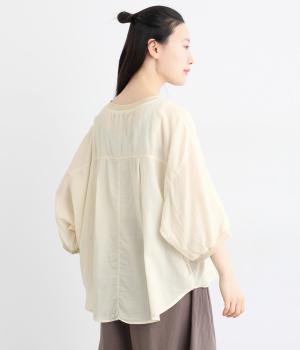 丸みのあるドルマンシルエットが、やさしい印象をつくるプルオーバーです。リラックス感がありながら、前後差のある裾で軽やかなバランスに。襟ぐりと袖口にあしらったリブが、さりげないアクセントを添えます。生地の透け感をいかしたレイヤードスタイルもたのしめる一枚です。
