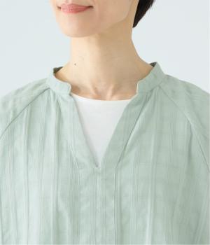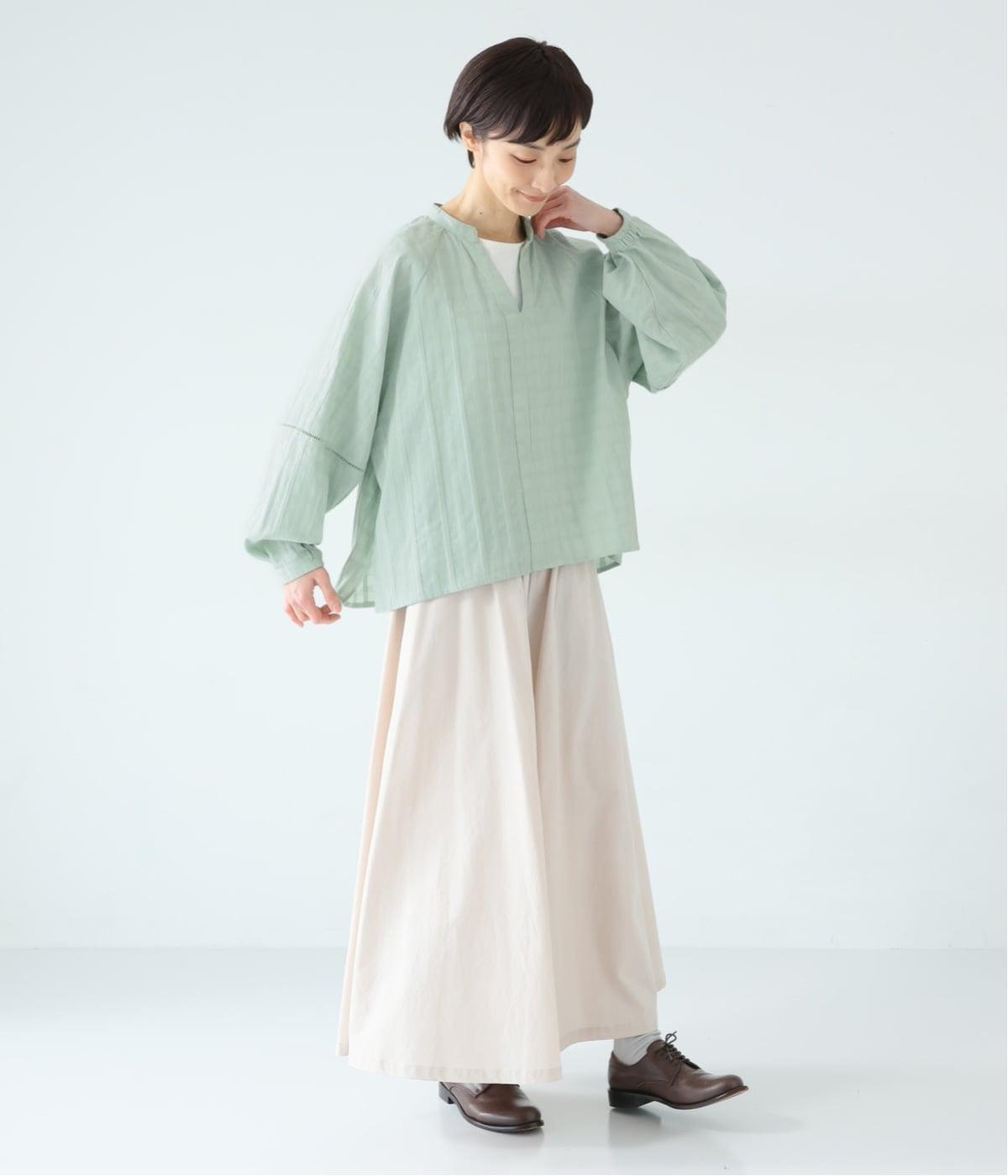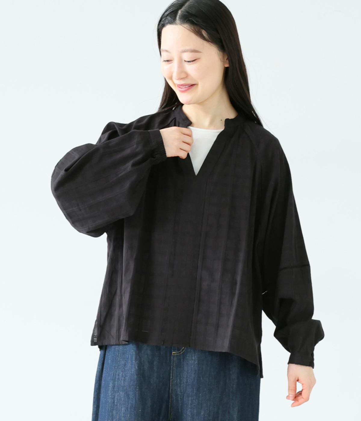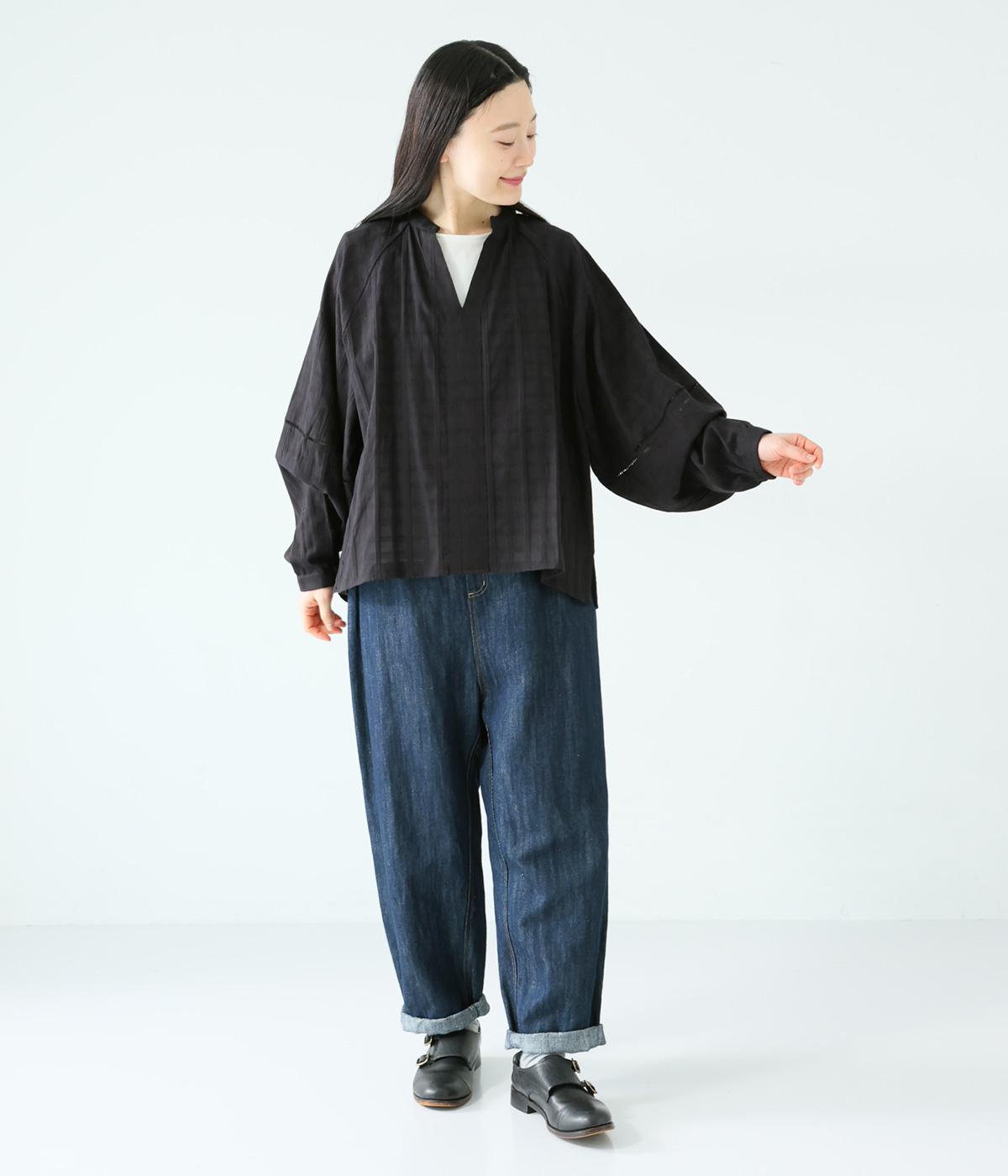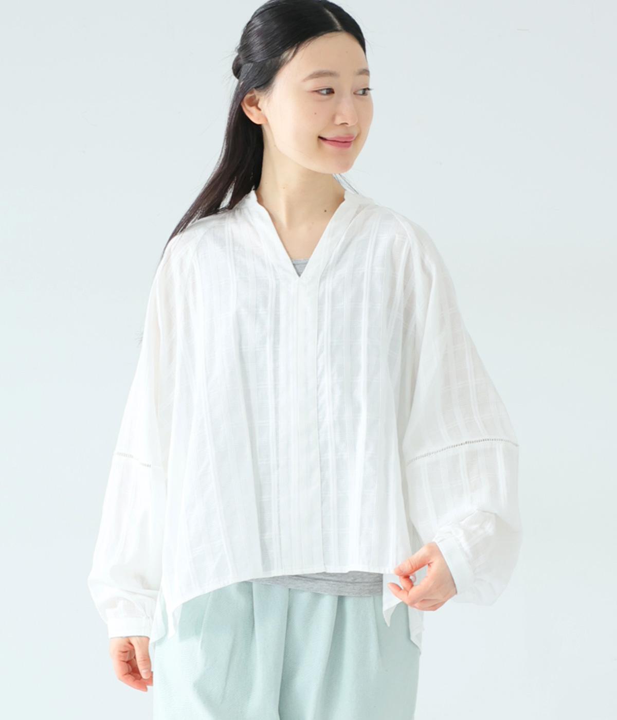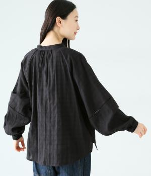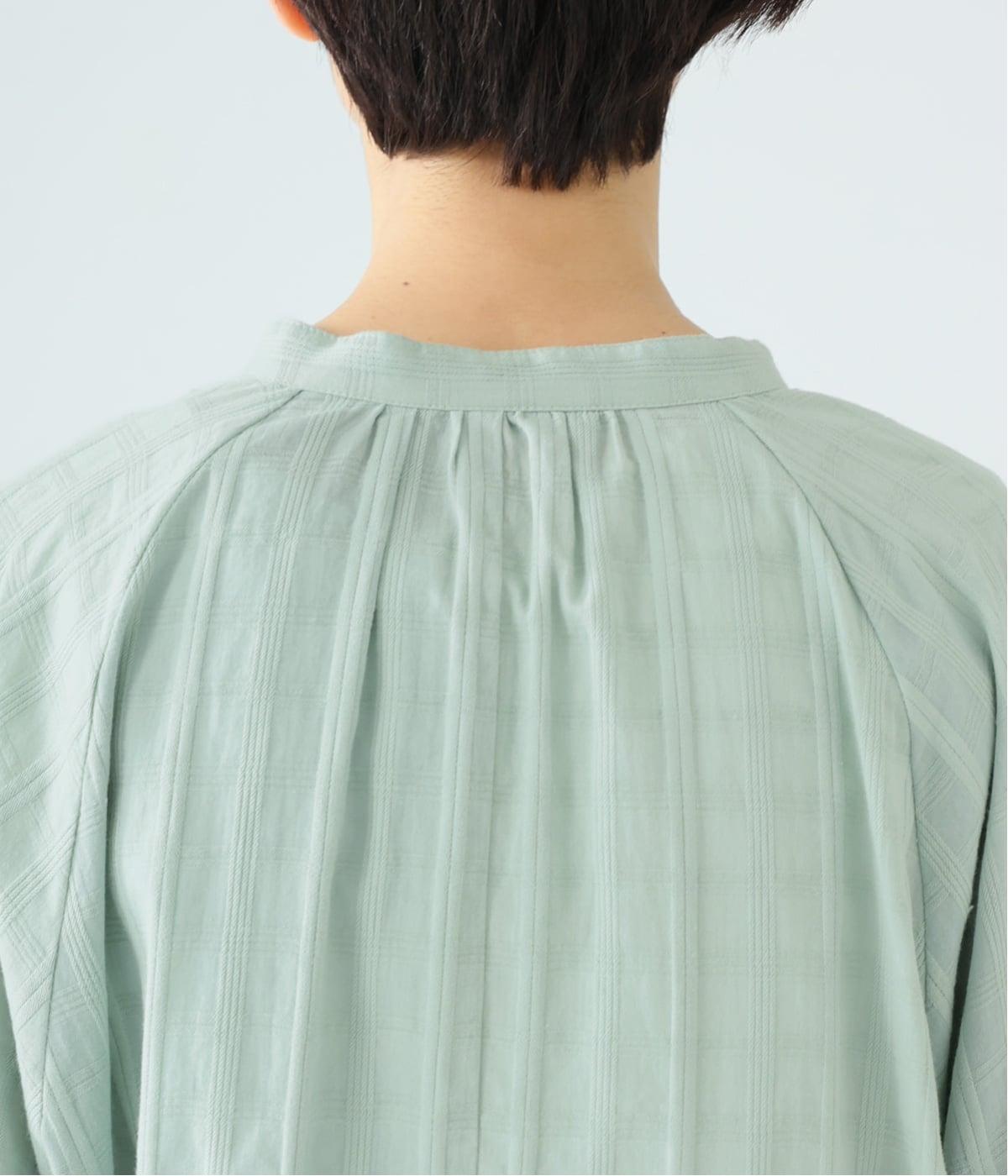 ふんわりとやわらかな肌ざわりのボイル生地を使用しています。透け感があり、軽やかな着心地です。織りで表現したチェック柄が表情に奥行きを添えるナチュラルな素材感です。