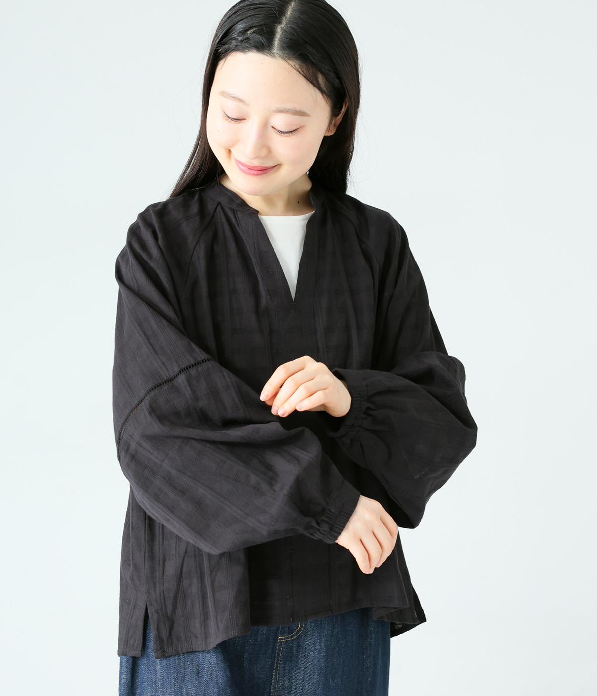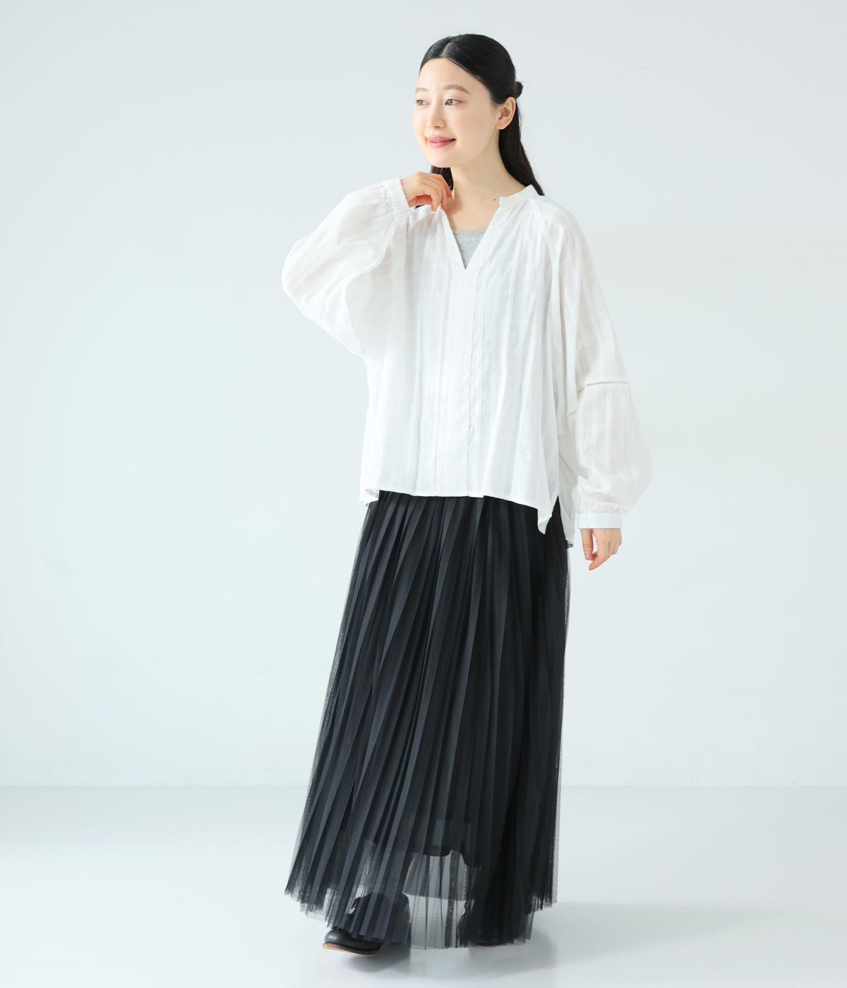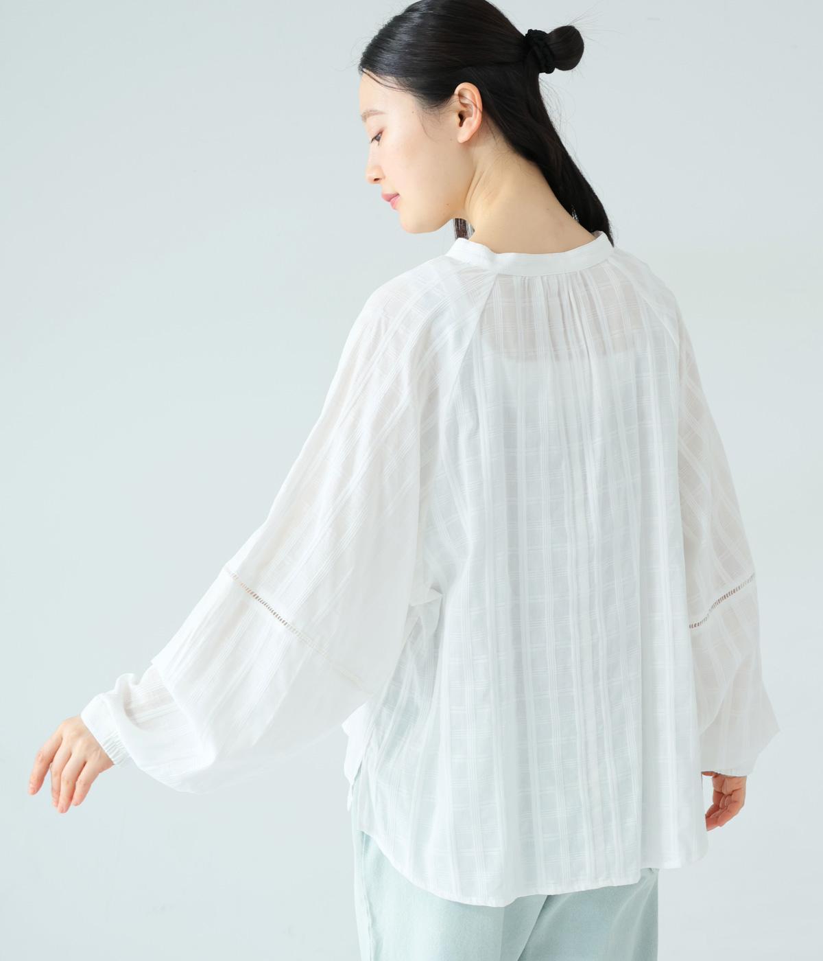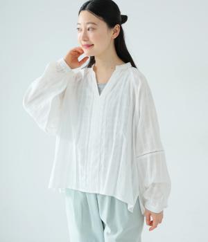 シンプルなフロントが素材の魅力を引き立て、ふんわりとした袖のシルエットが女性らしいやわらかな雰囲気を演出します。袖のはしごレースが抜け感を添え、ほどよい着丈でさまざまなボトムスに合わせやすく仕上げました。