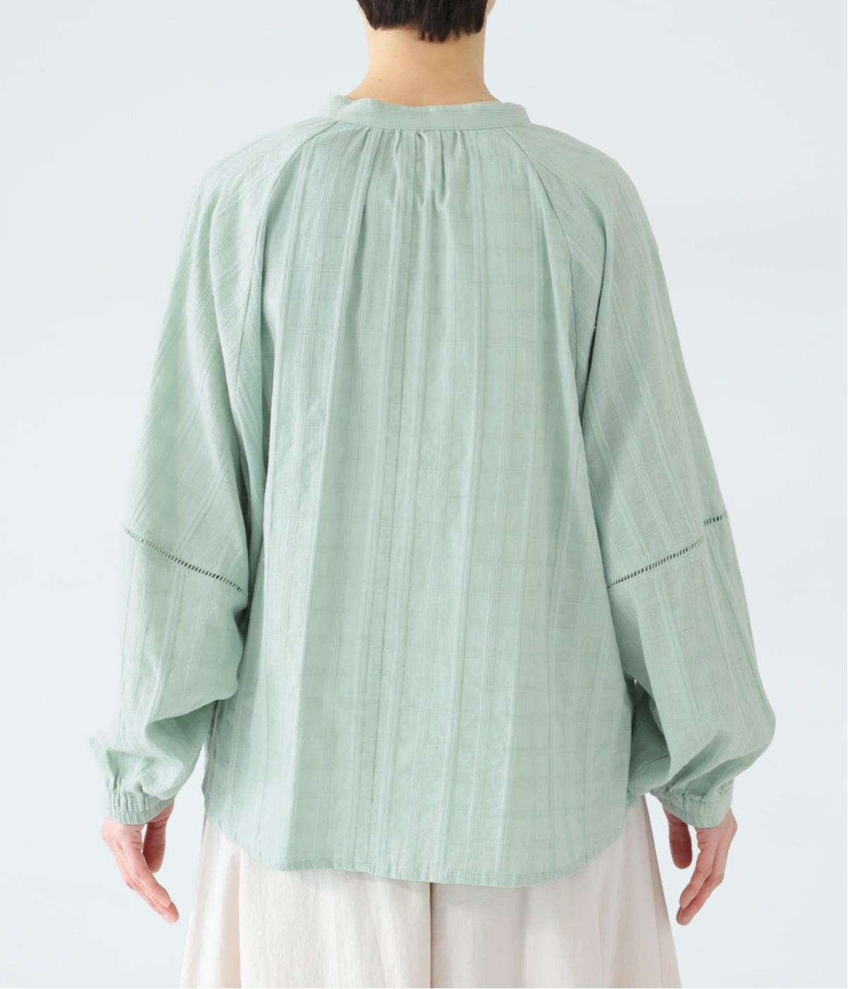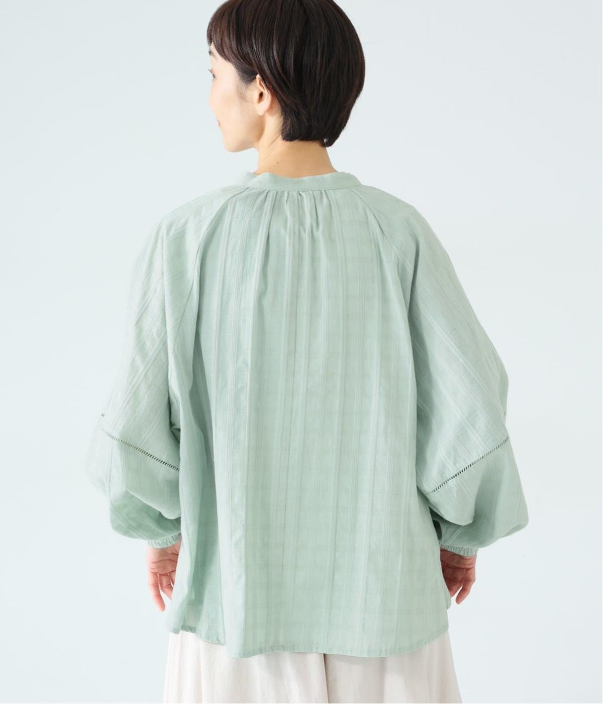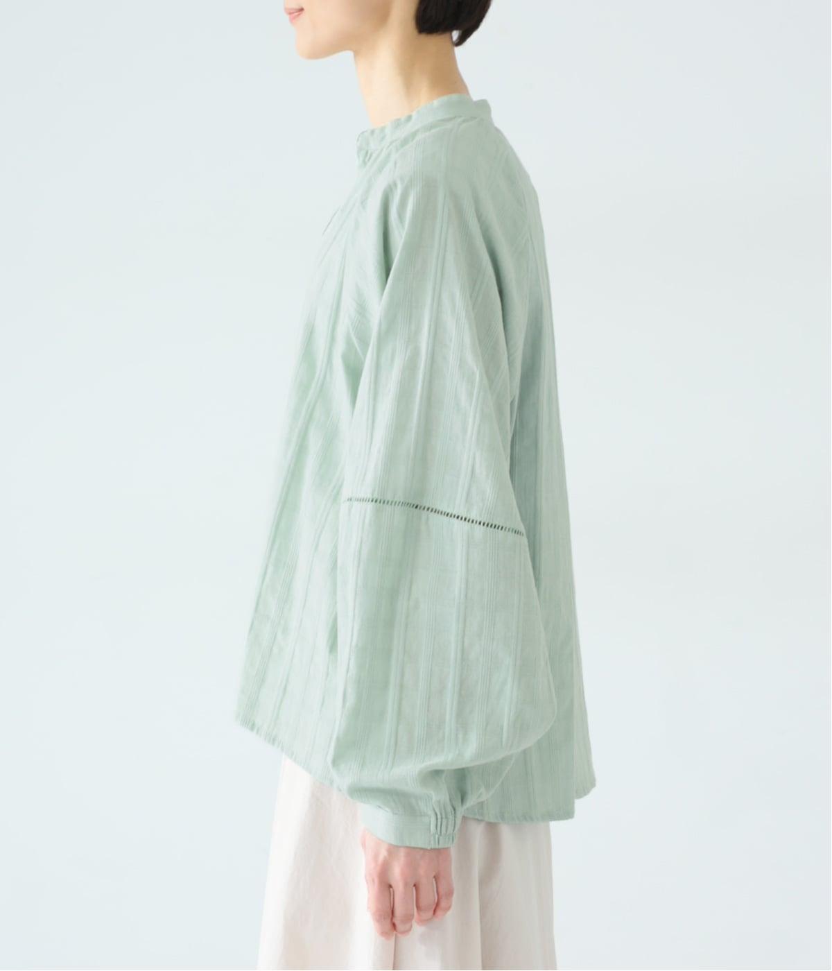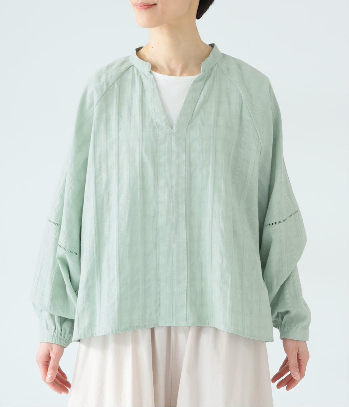 シンプルなフロントが素材の魅力を引き立て、ふんわりとした袖のシルエットが女性らしいやわらかな雰囲気を演出します。袖のはしごレースが抜け感を添え、ほどよい着丈でさまざまなボトムスに合わせやすく仕上げました。