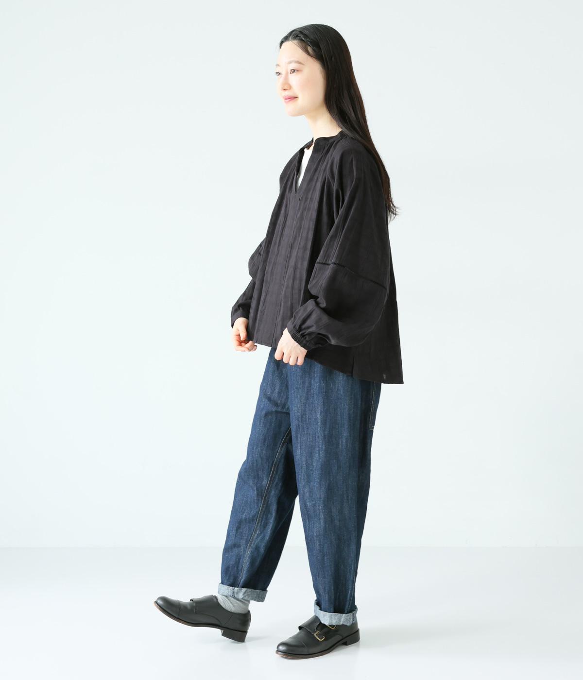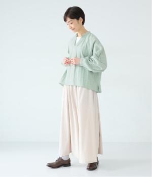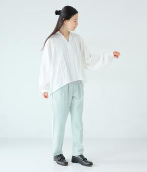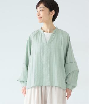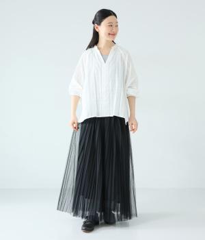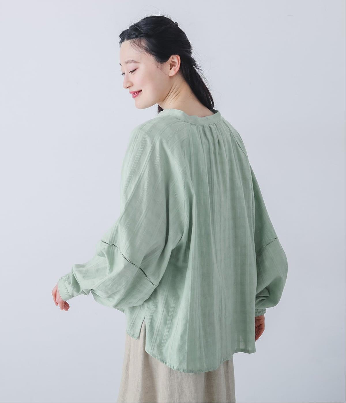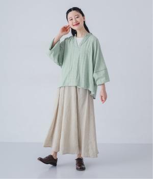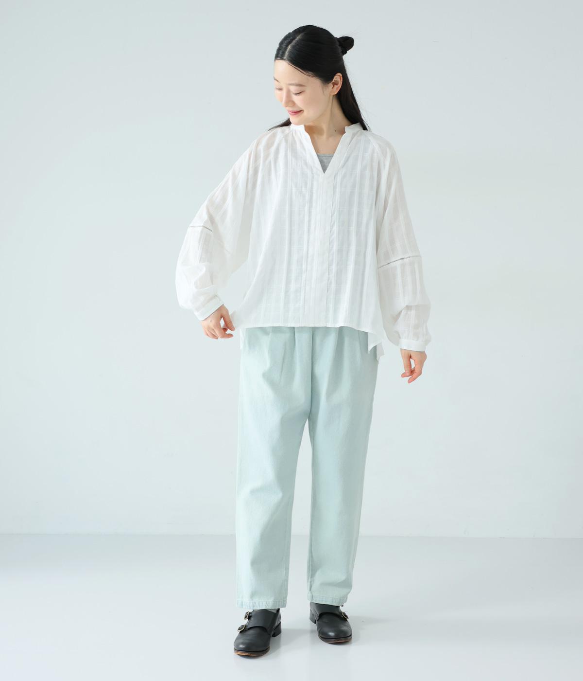 シンプルなフロントが素材の魅力を引き立て、ふんわりとした袖のシルエットが女性らしいやわらかな雰囲気を演出します。袖のはしごレースが抜け感を添え、ほどよい着丈でさまざまなボトムスに合わせやすく仕上げました。