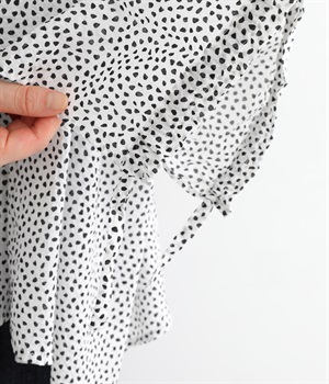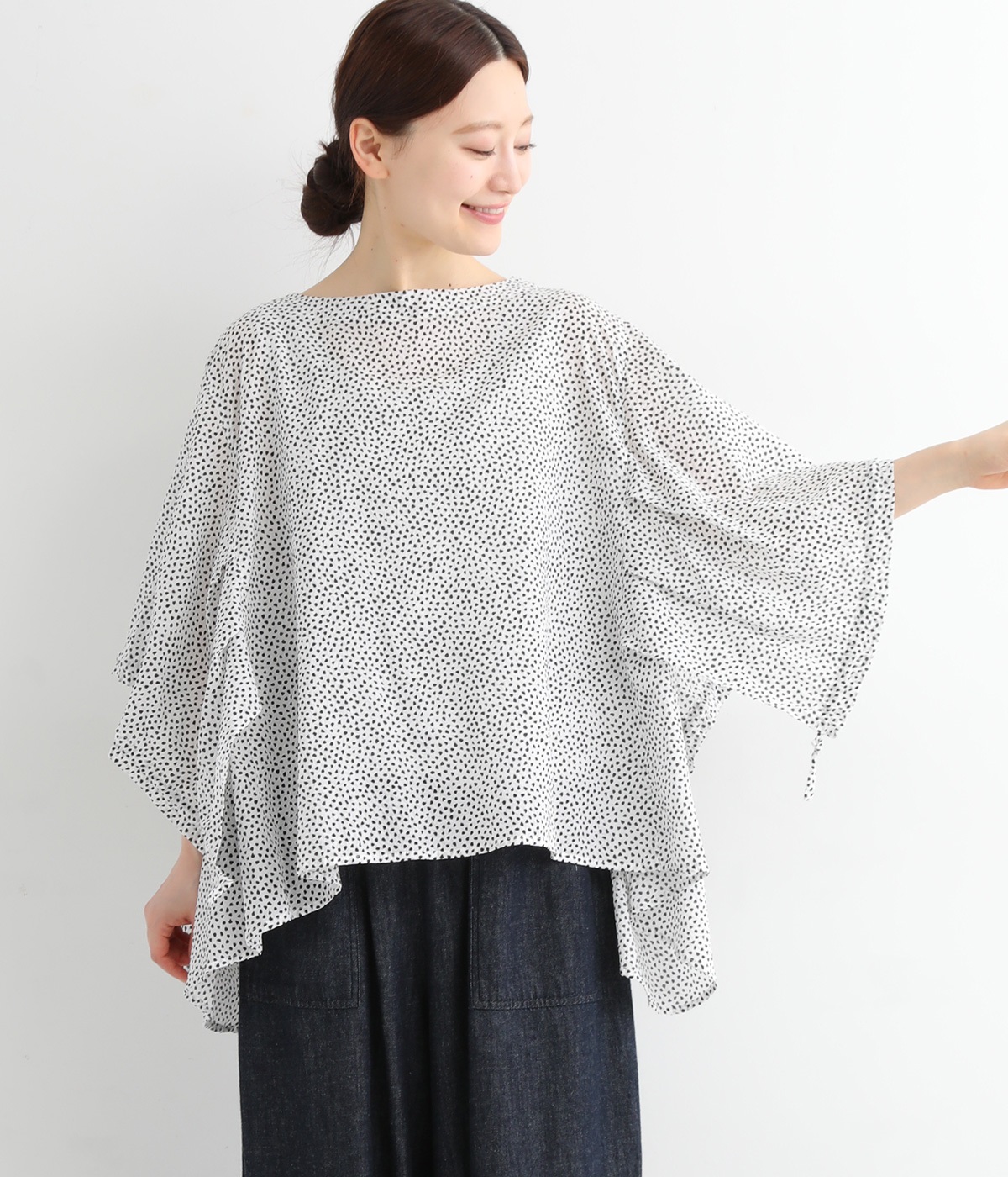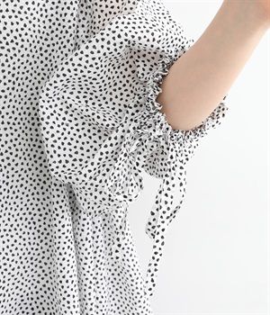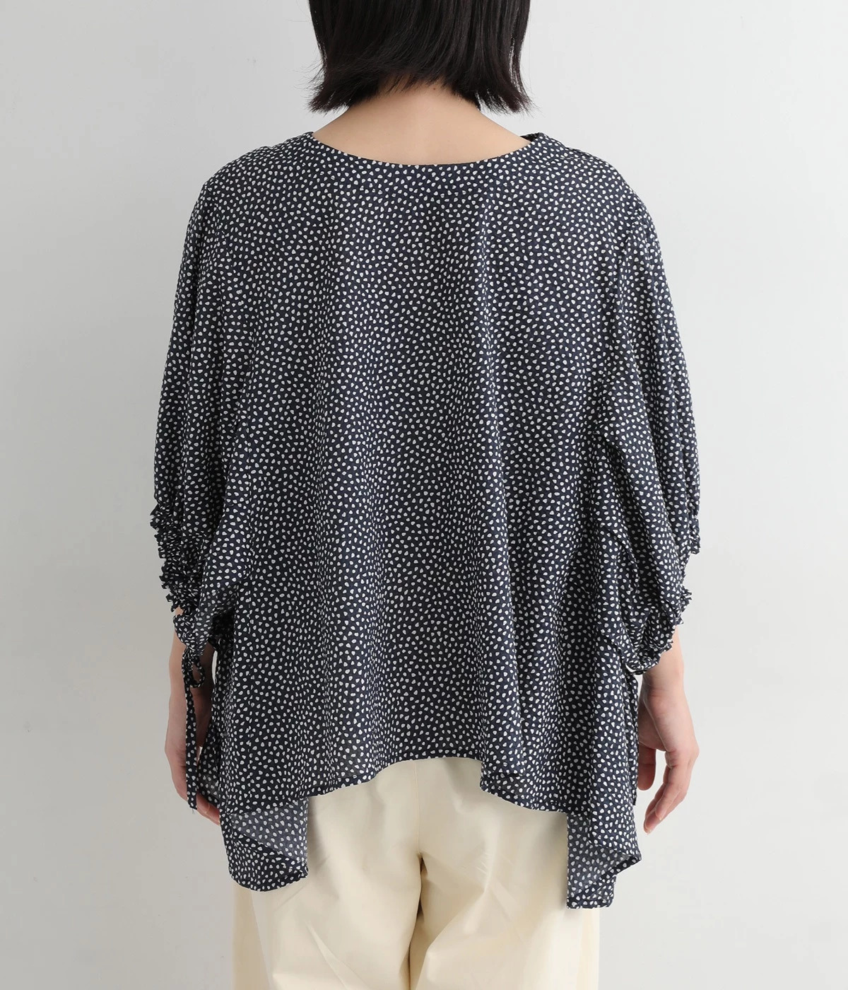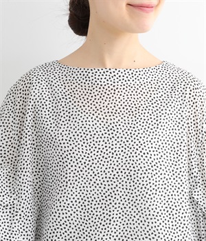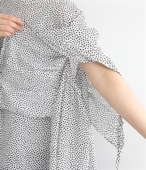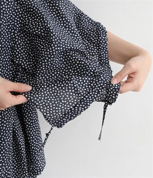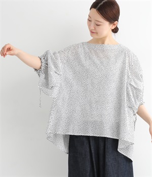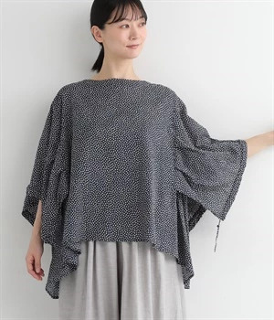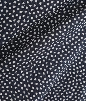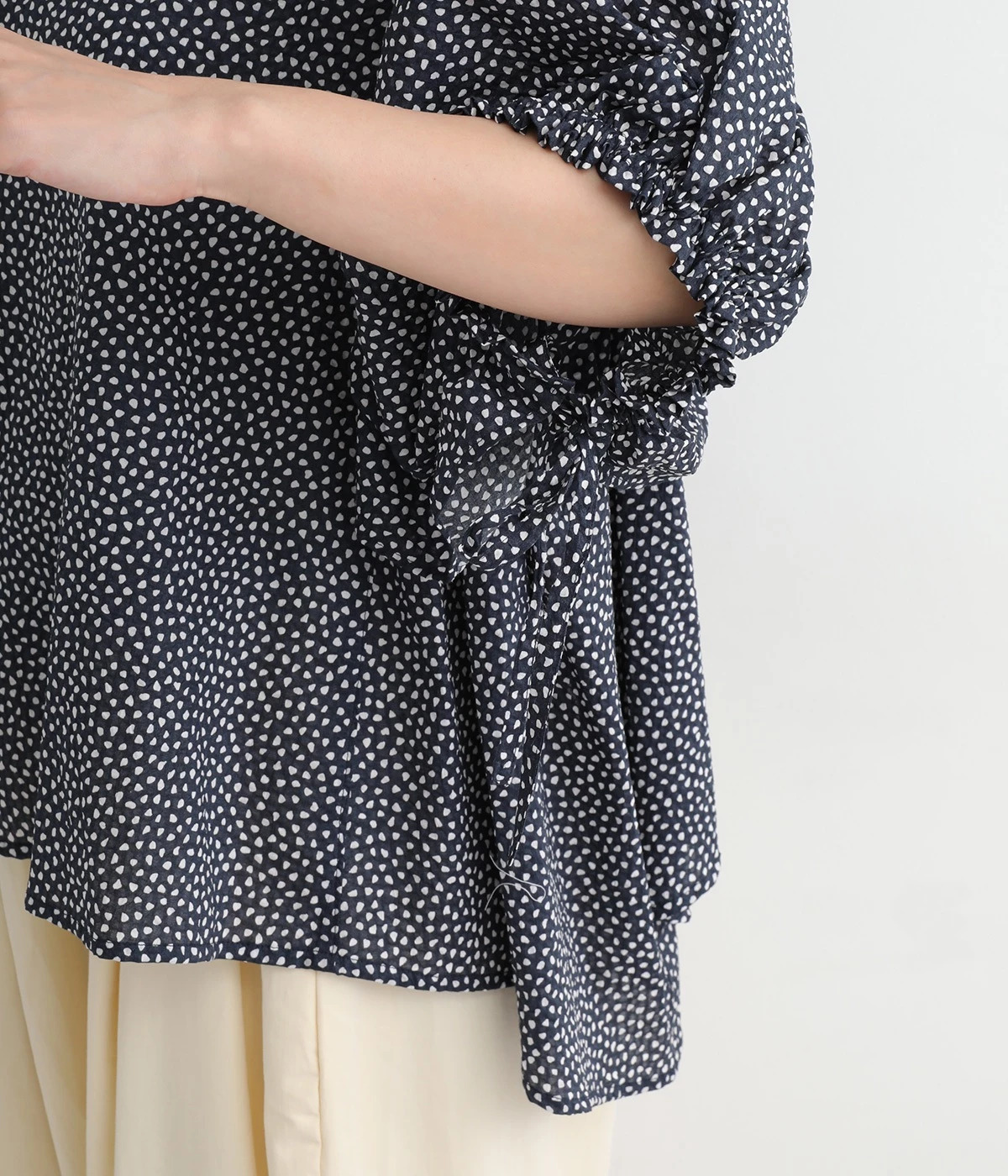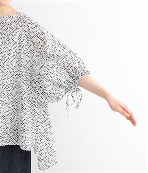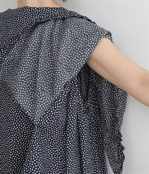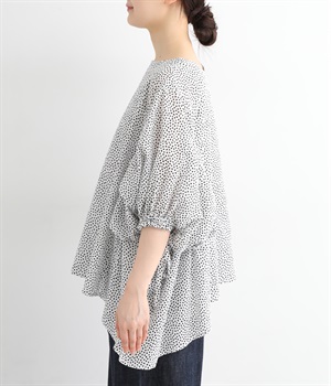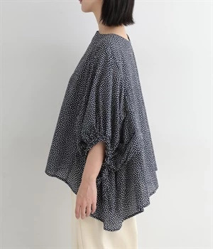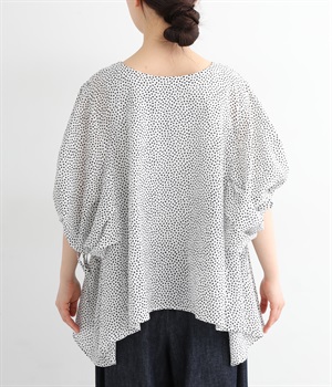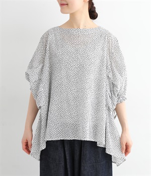 ぽこぽことした肌触りが特徴的なちりめん風の生地を使用しています。歪なドット柄もユニークで、薄手の素材感も相まって涼し気な印象です。