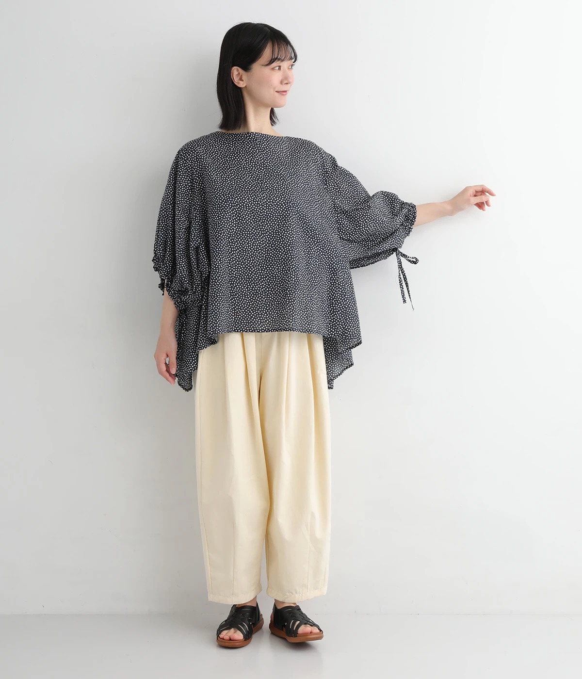 自然とサイドが垂れるヘムラインと、くしゅっとしたボリュームのある袖が目を惹くワイドプルオーバーです。袖の紐をほどけばフレアスリーブのようになり、シルエットのアレンジがたのしめます。肌に触れにくく快適な着用感ながら着映え力も備えた一枚です。