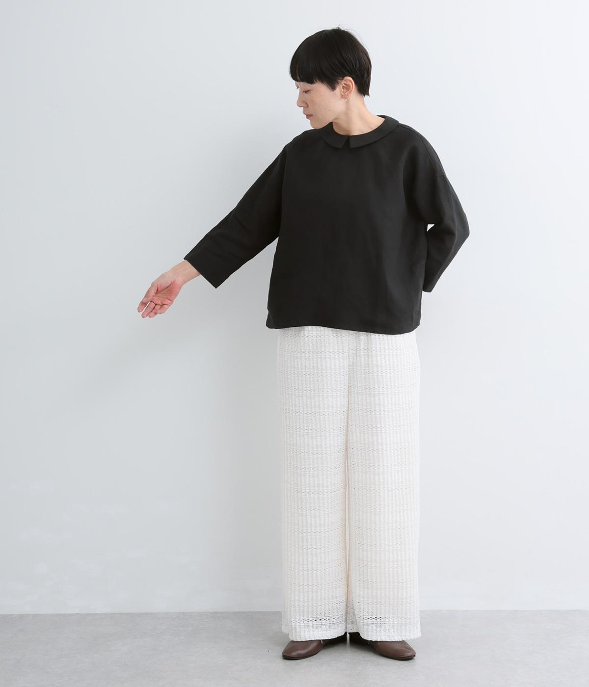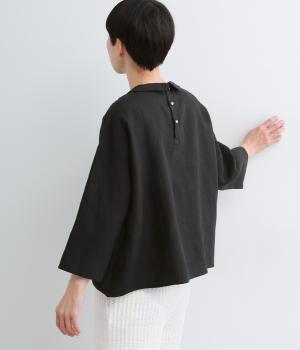 ゆったりフレアな身頃にフラットカラーがガーリーテイストで品のいいブラウス。シンプルながらも素材感のよさが引き立ち、コーディネートをぐっと格上げ。後ろボタンは脱ぎ着をアシストするだけでなく、配色がワンポイントになっています。