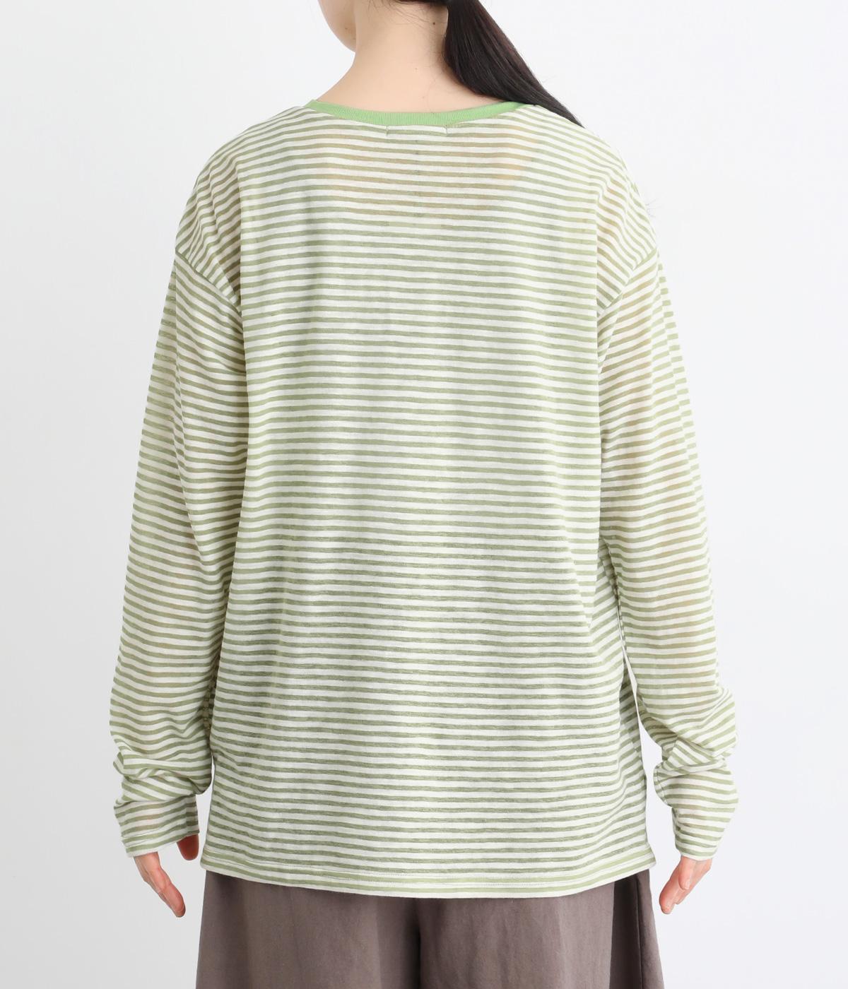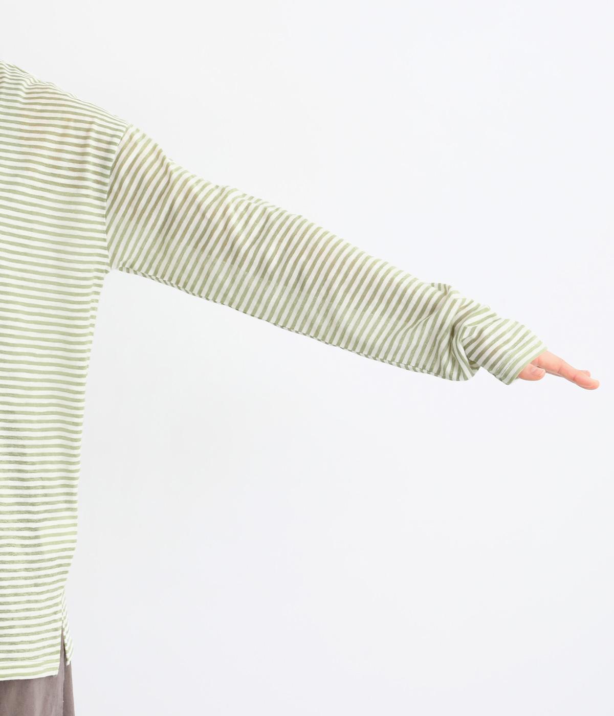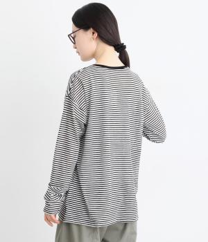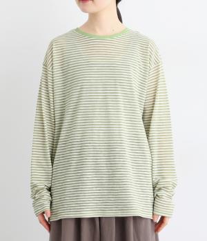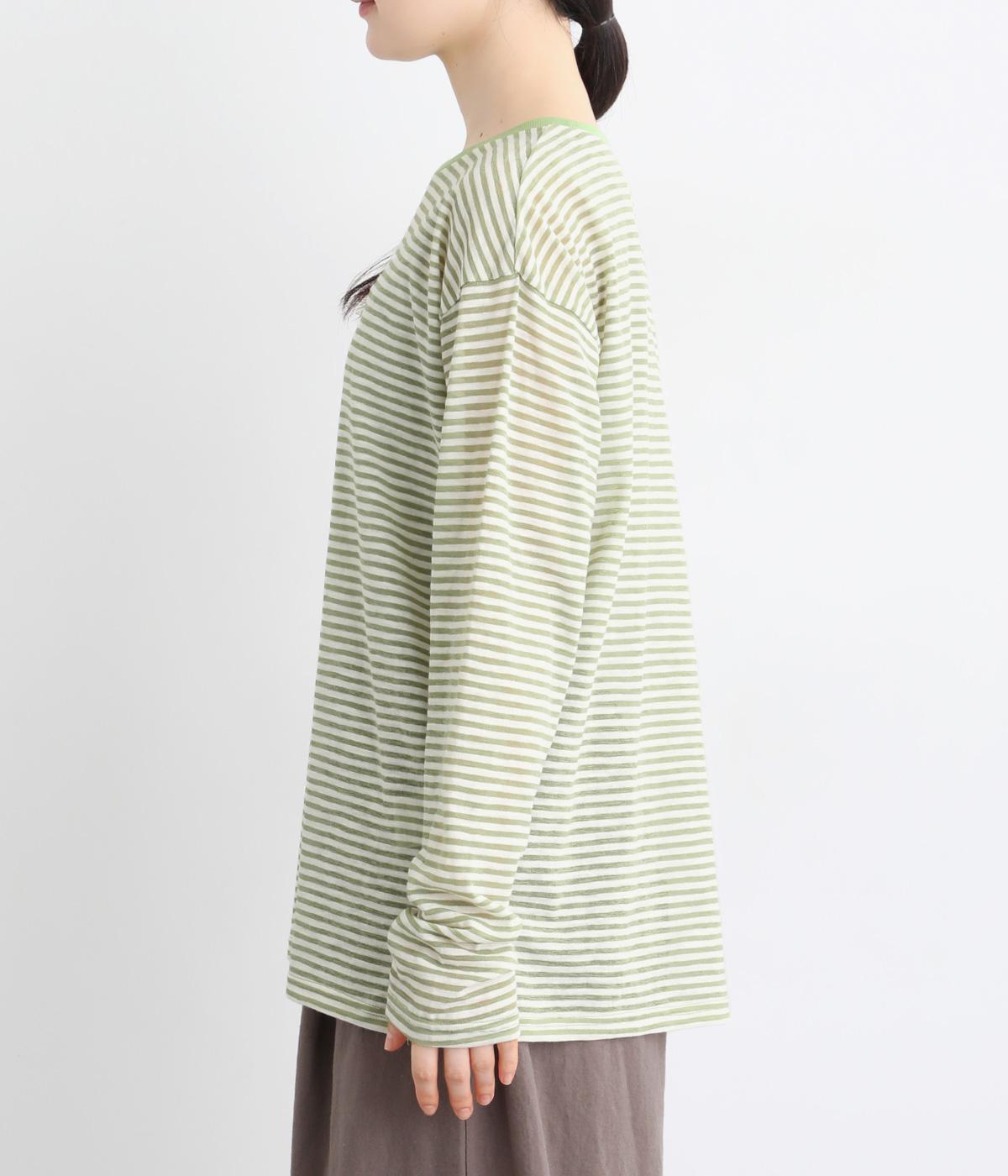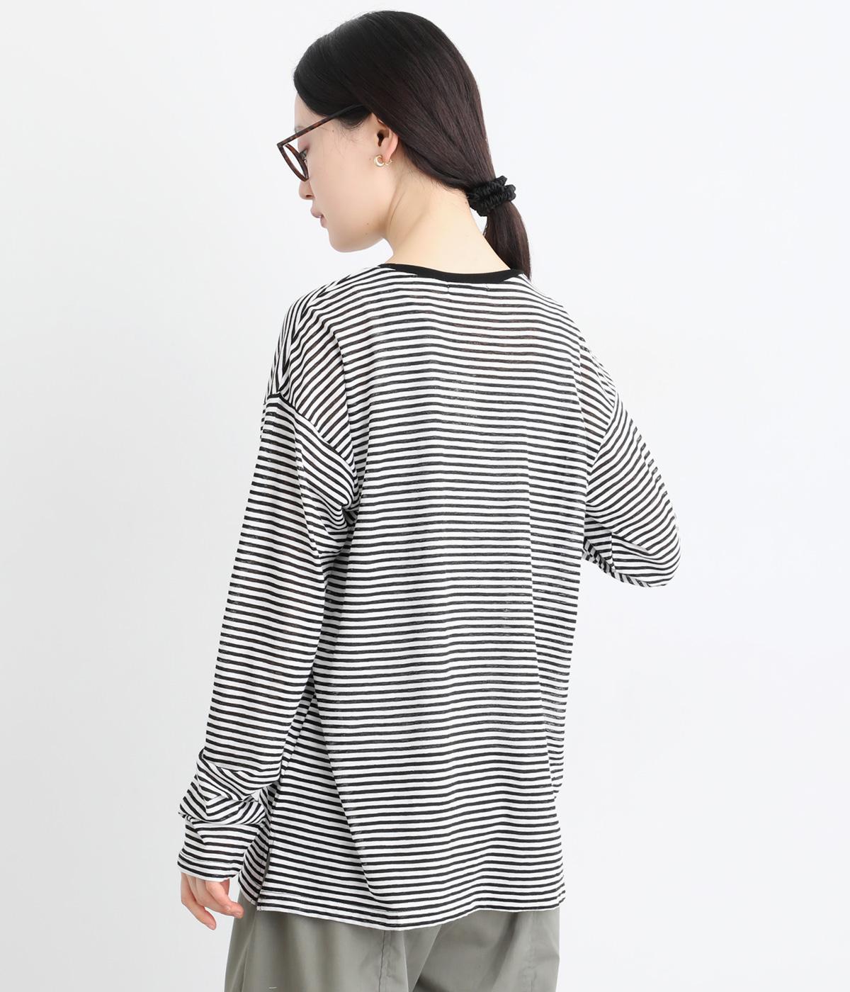 細かなピッチのボーダーが、軽やかで洗練された印象をつくるロングTシャツです。生地のほどよいシアー感が奥行きを添え、ゆとりのあるシルエットがリラックスした雰囲気を引き立てます。インナーとしてジャケットやカーディガンの下からのぞかせれば、軽やかな装いが完成。着まわしに活躍する一着です。