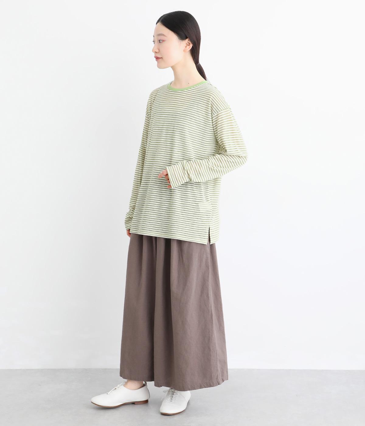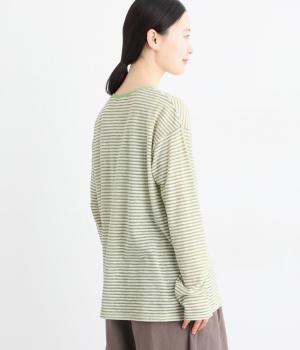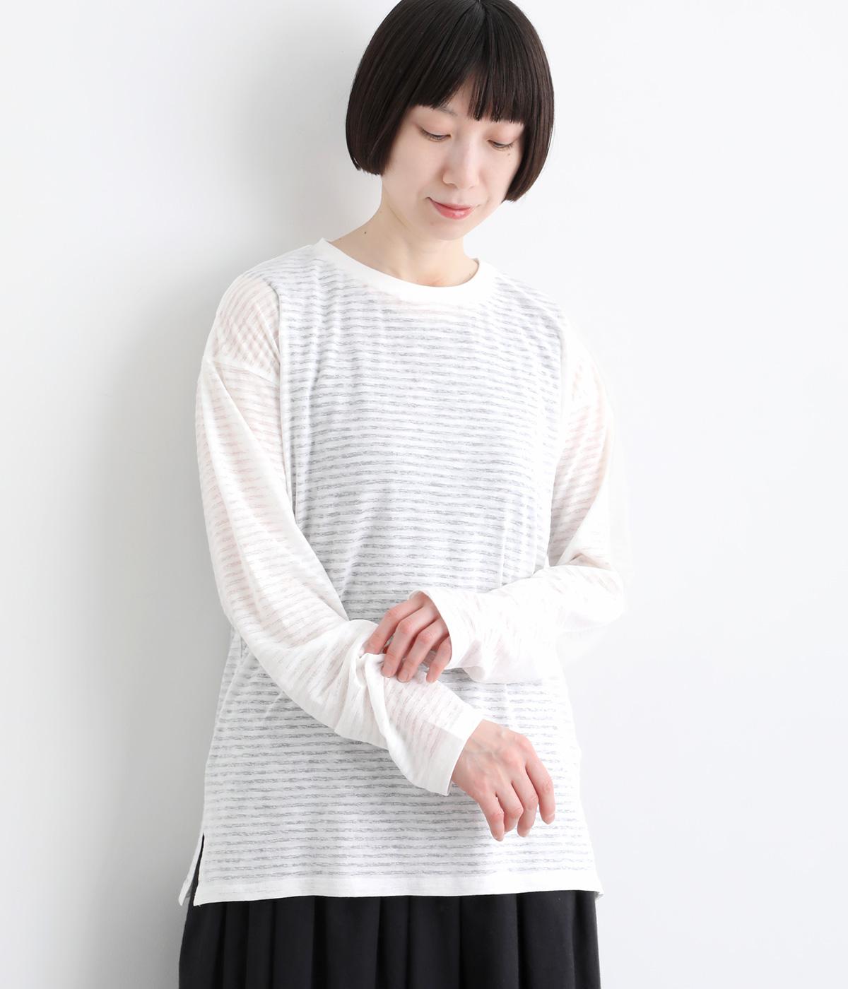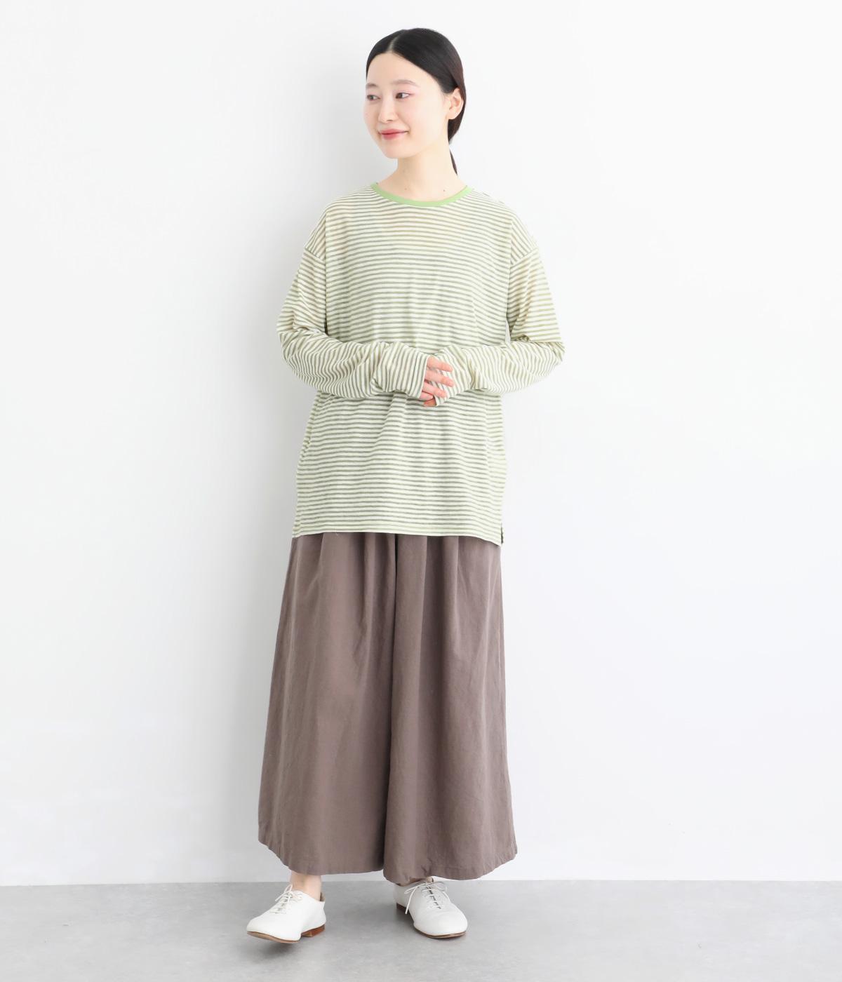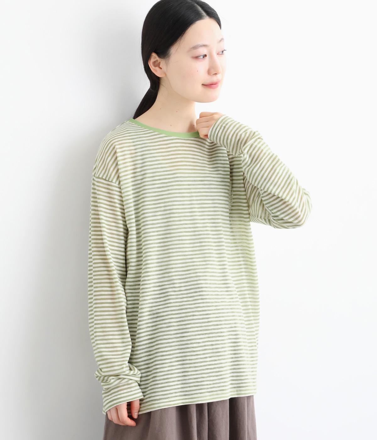 細かなピッチのボーダーが、軽やかで洗練された印象をつくるロングTシャツです。生地のほどよいシアー感が奥行きを添え、ゆとりのあるシルエットがリラックスした雰囲気を引き立てます。インナーとしてジャケットやカーディガンの下からのぞかせれば、軽やかな装いが完成。着まわしに活躍する一着です。
