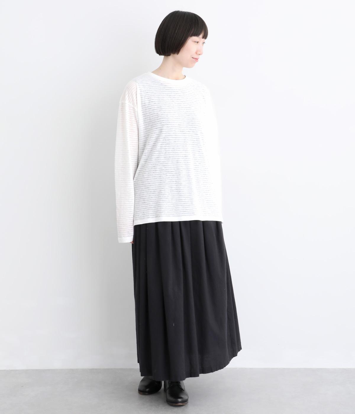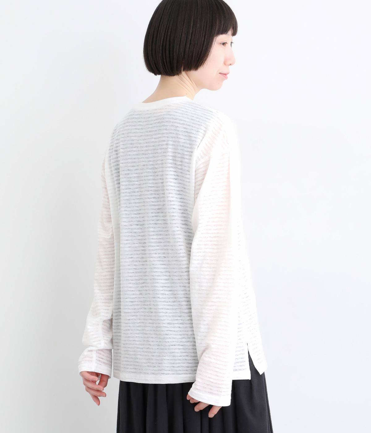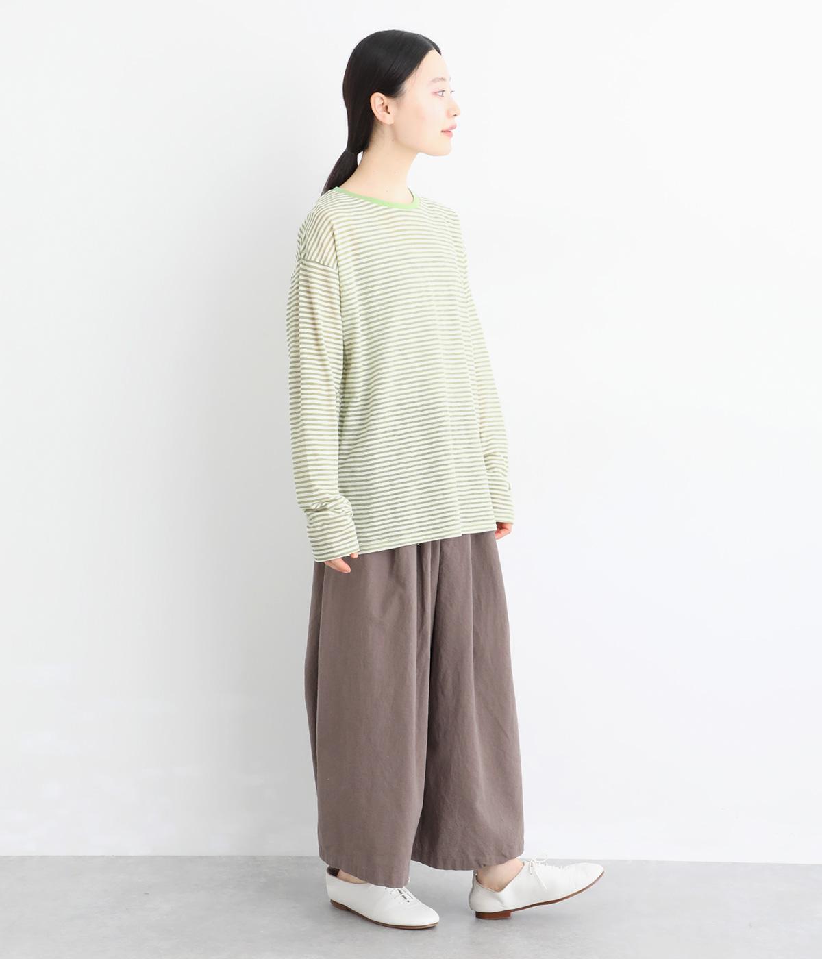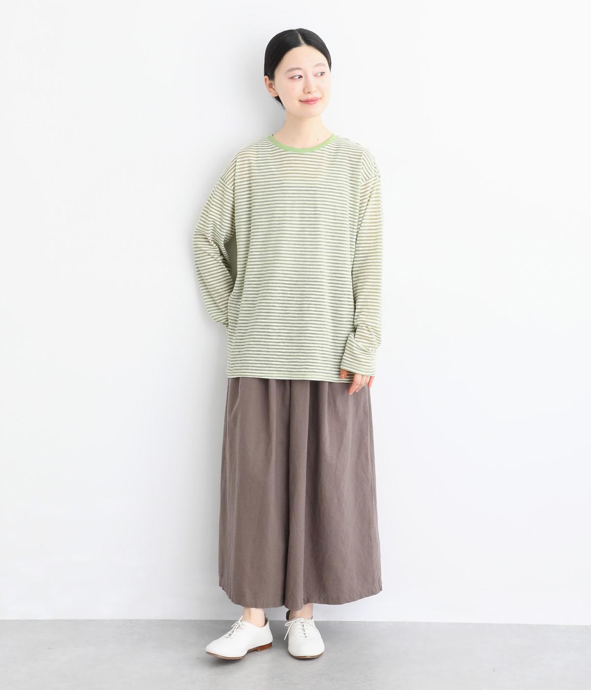 細かなピッチのボーダーが、軽やかで洗練された印象をつくるロングTシャツです。生地のほどよいシアー感が奥行きを添え、ゆとりのあるシルエットがリラックスした雰囲気を引き立てます。インナーとしてジャケットやカーディガンの下からのぞかせれば、軽やかな装いが完成。着まわしに活躍する一着です。
