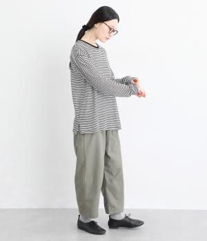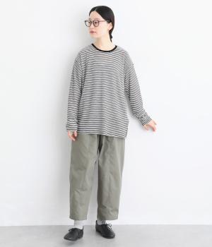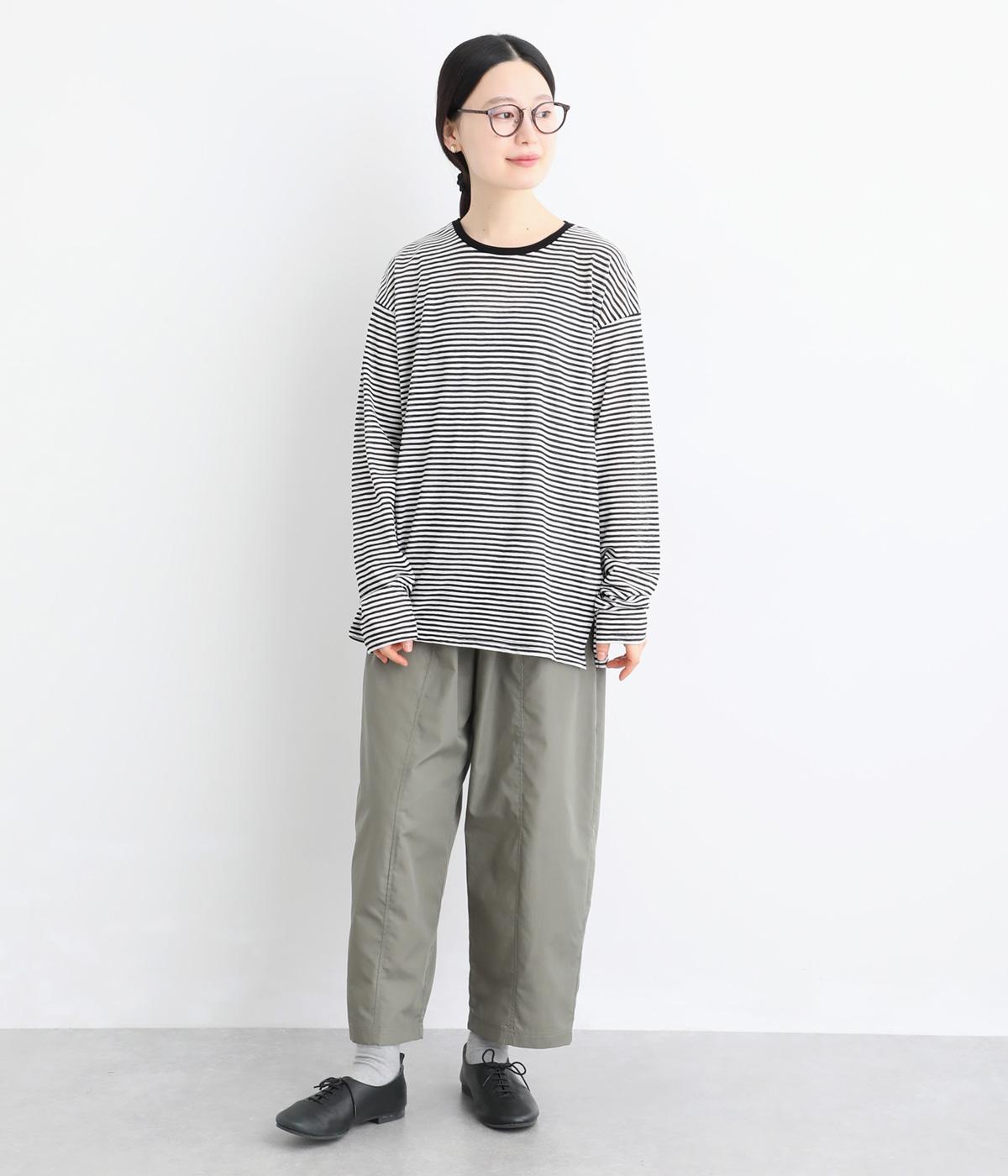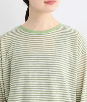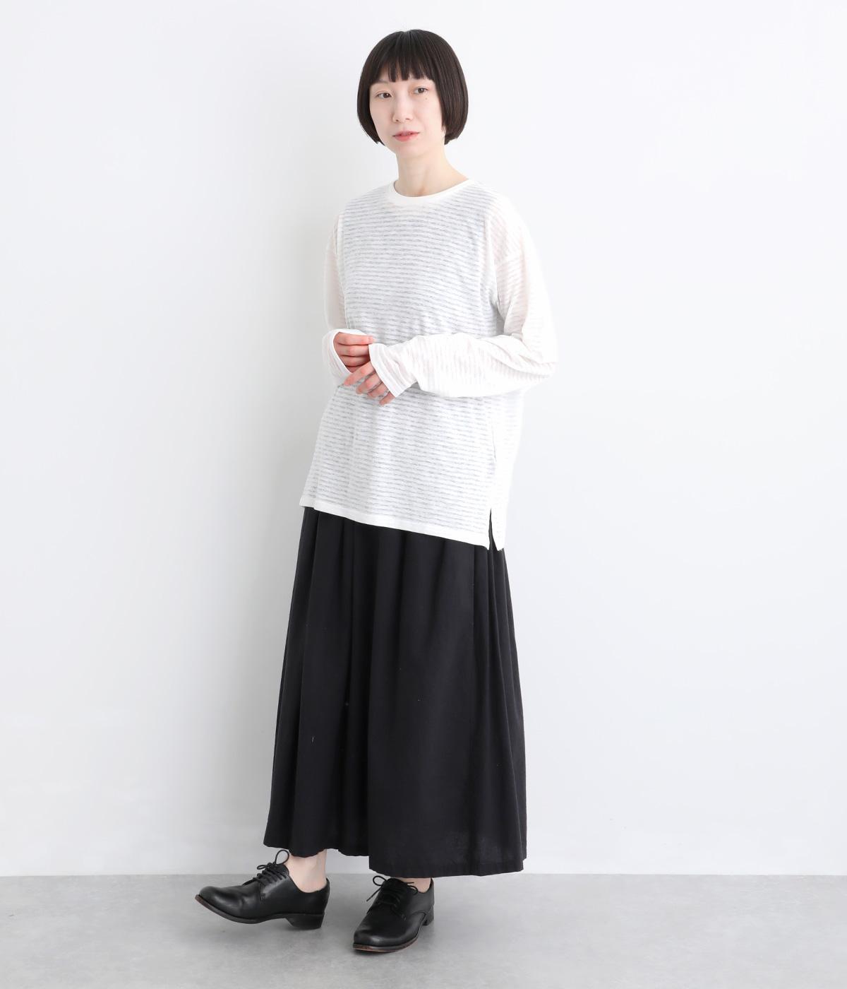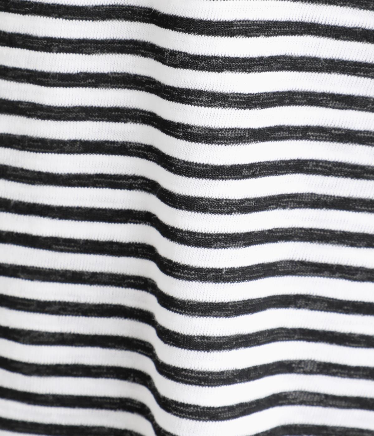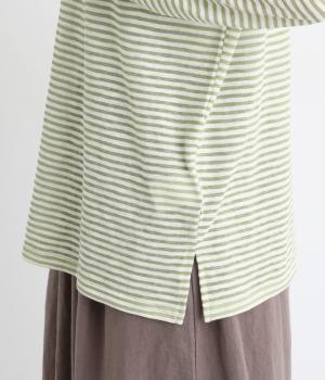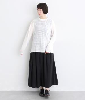 細かなピッチのボーダーが、軽やかで洗練された印象をつくるロングTシャツです。生地のほどよいシアー感が奥行きを添え、ゆとりのあるシルエットがリラックスした雰囲気を引き立てます。インナーとしてジャケットやカーディガンの下からのぞかせれば、軽やかな装いが完成。着まわしに活躍する一着です。