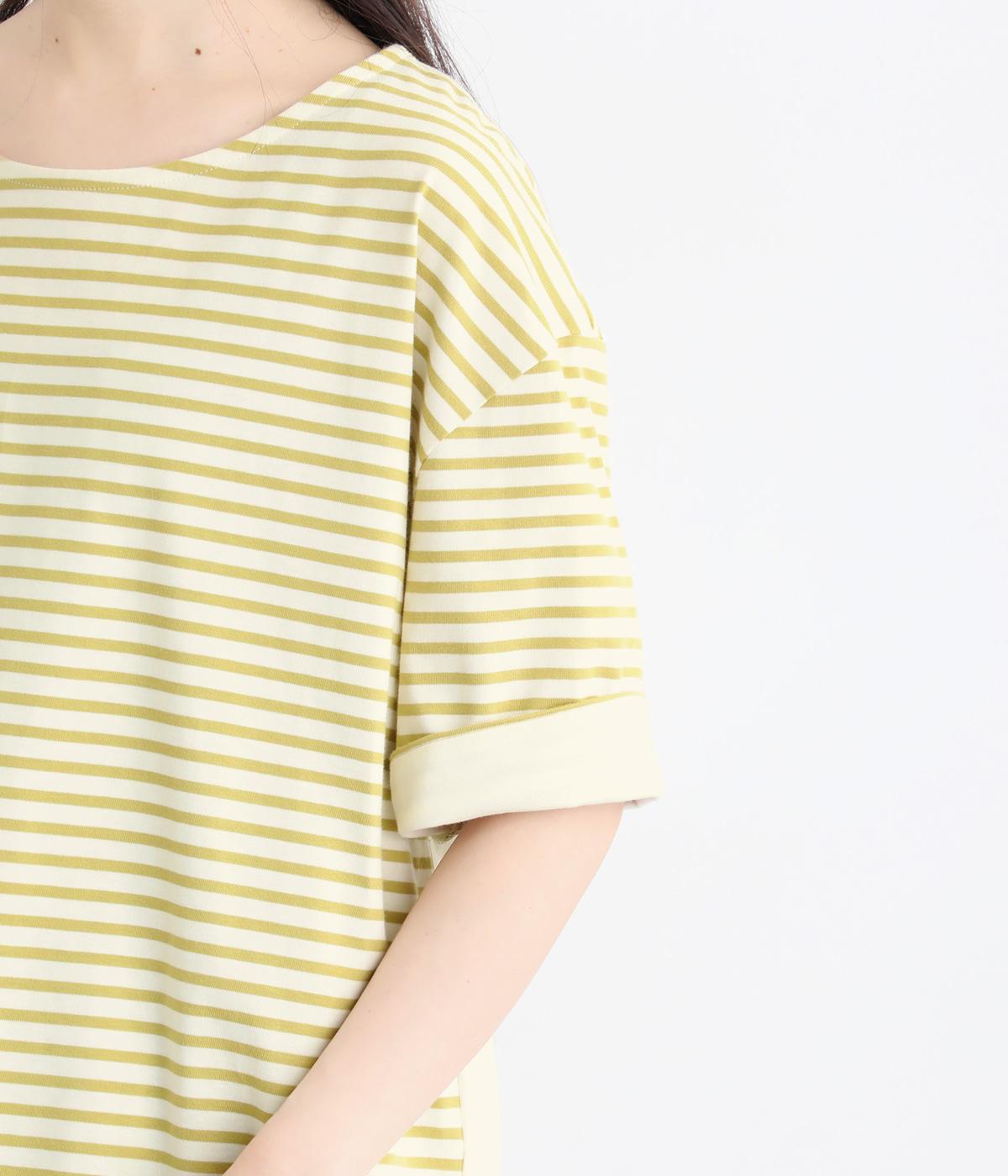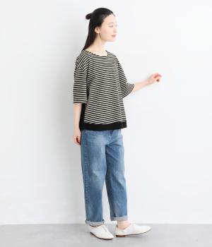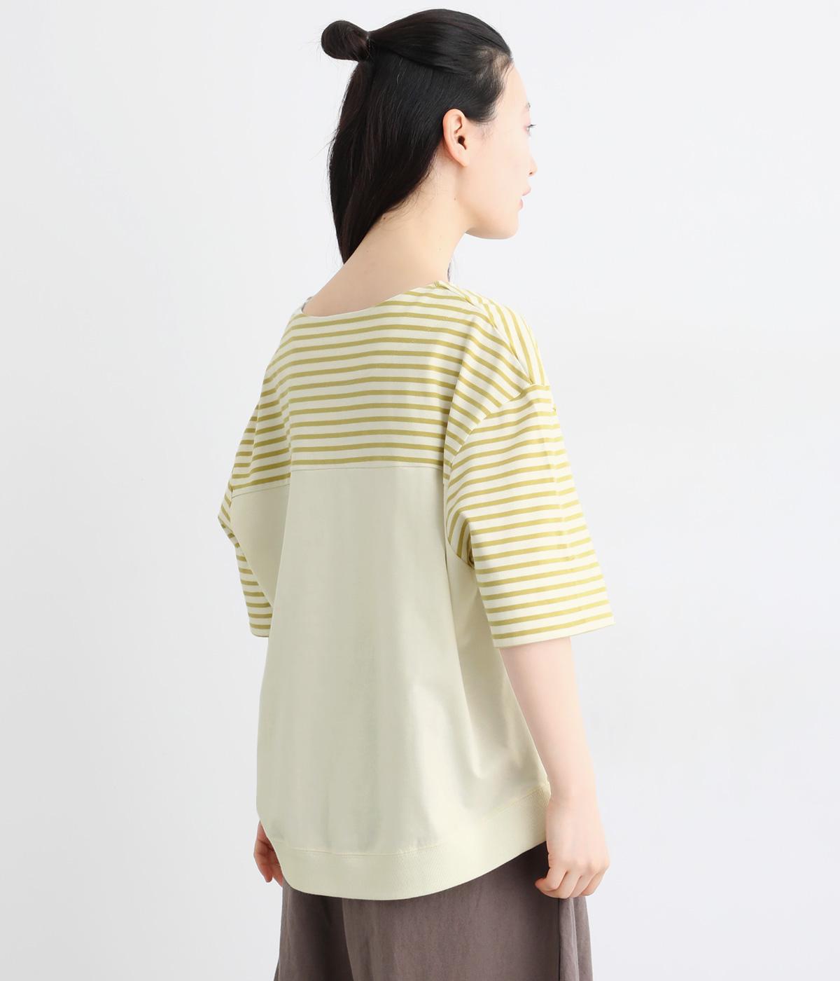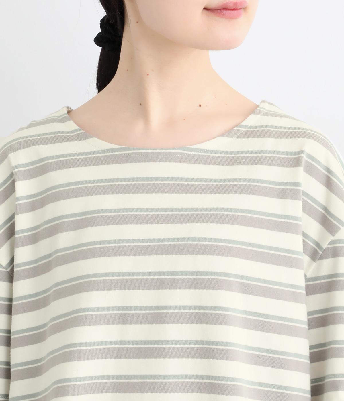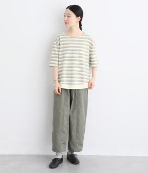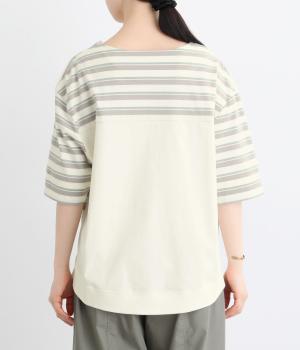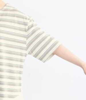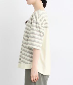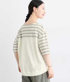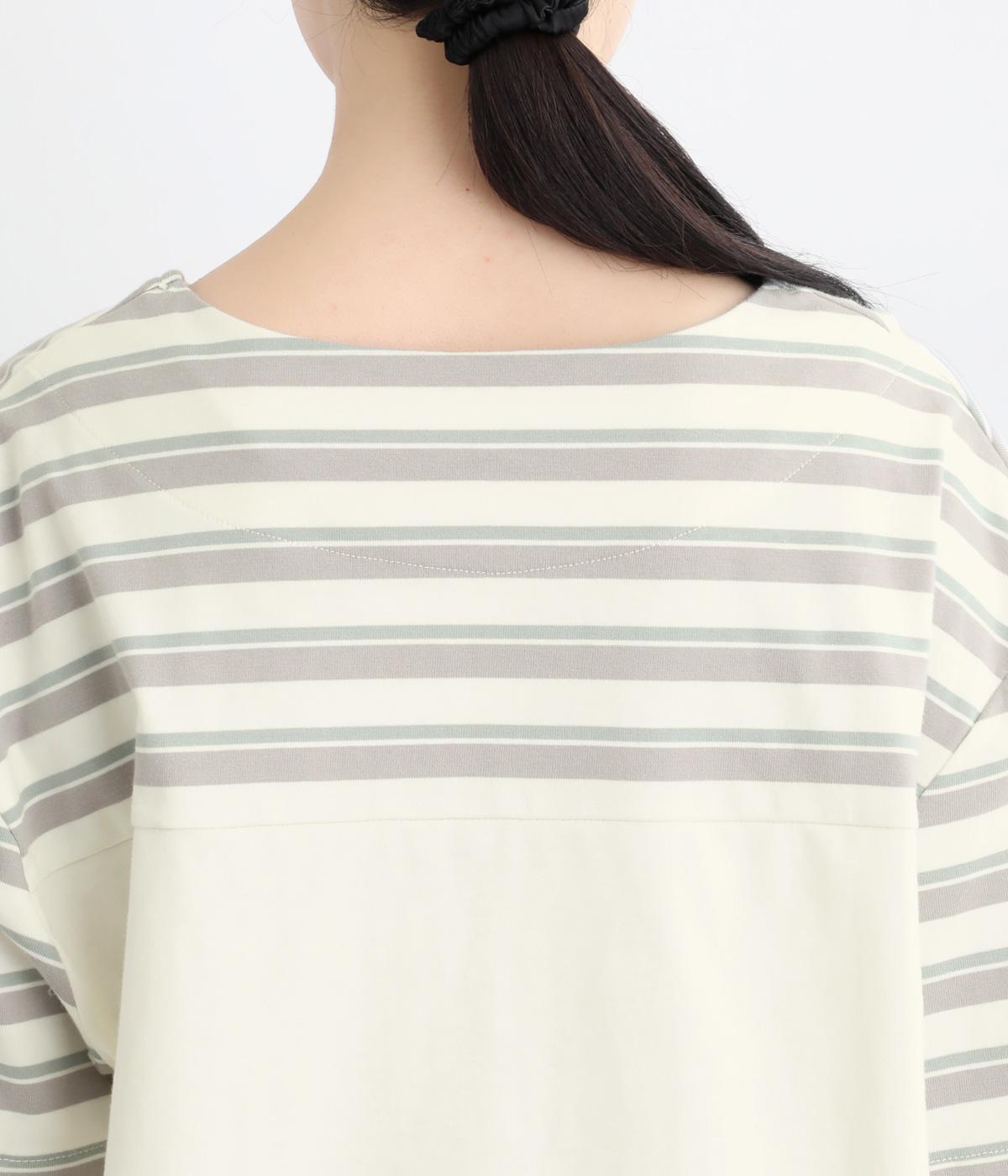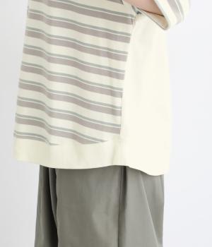 ボーダー柄をベースにうしろのヨーク下を無地で切り替えた、メリハリのある一着。異なる表情を組み合わせることで、シンプルながらも立体感があります。ゆったりシルエットとやや長めの着丈で、体のラインを拾いにくいのも◎。袖口は裏地つきで、折り返してニュアンスを変えた着こなしもたのしめます。