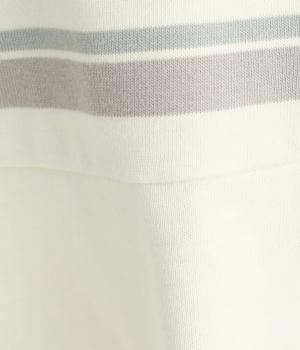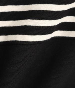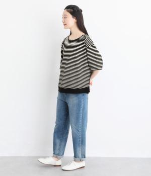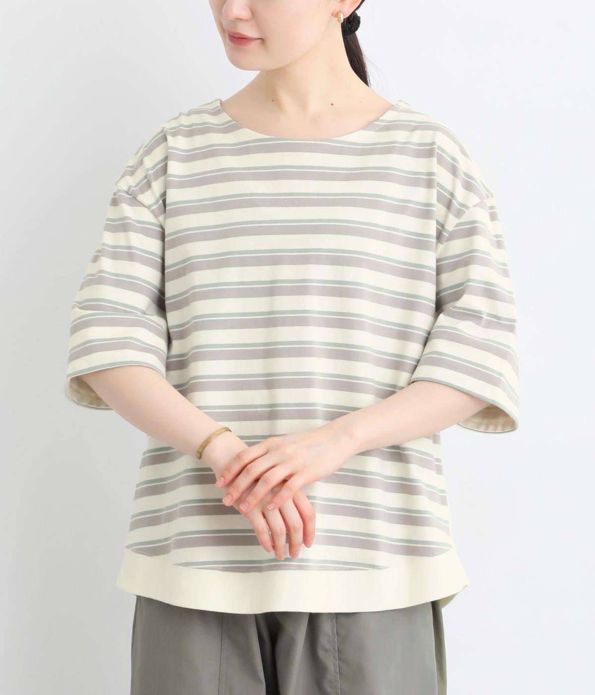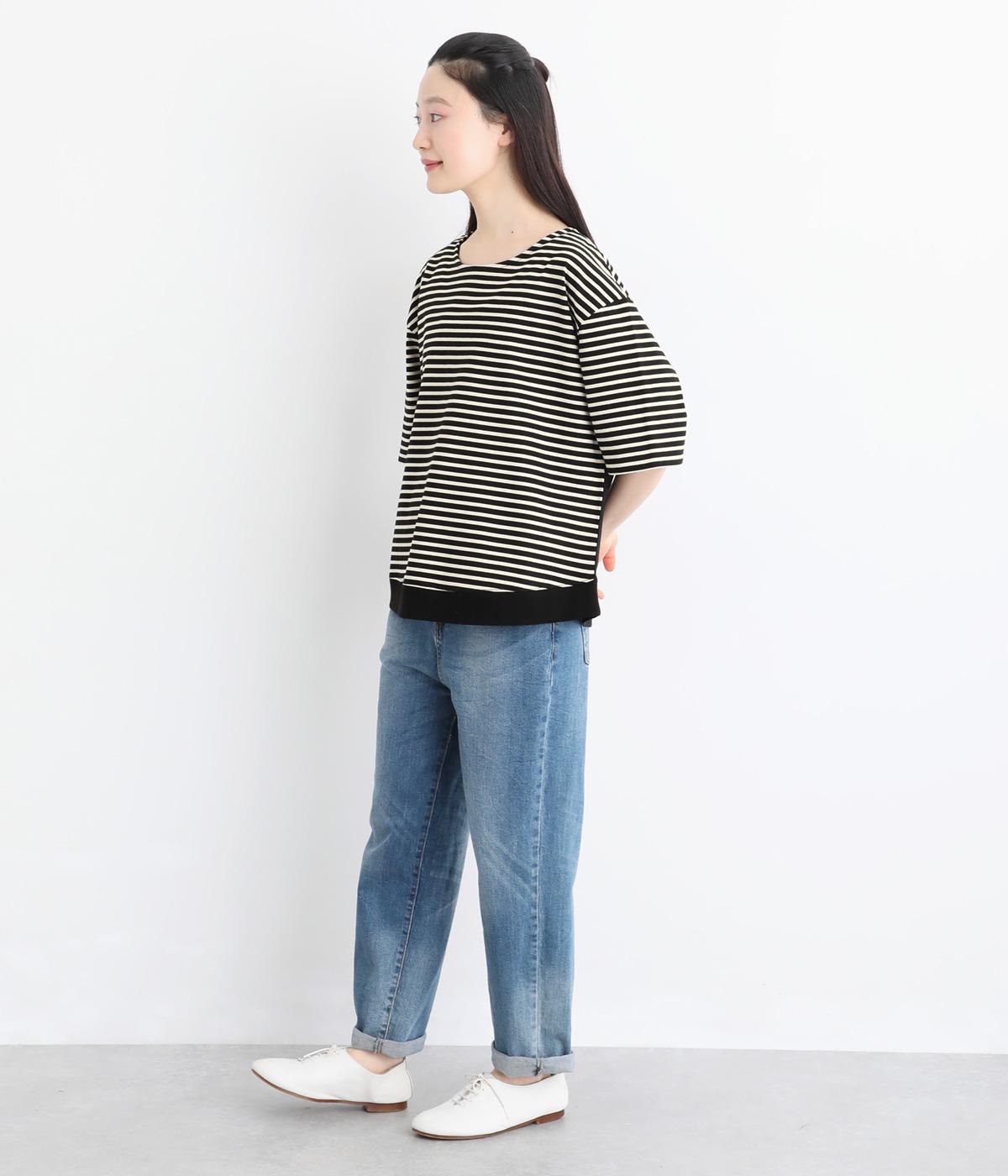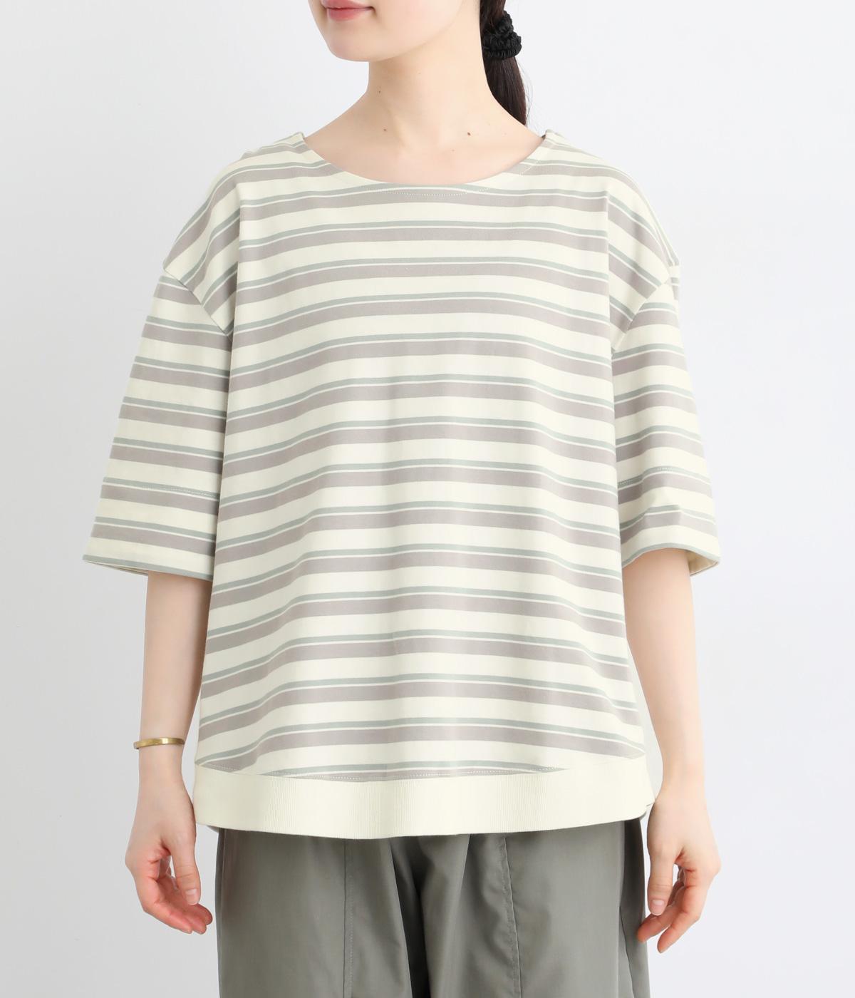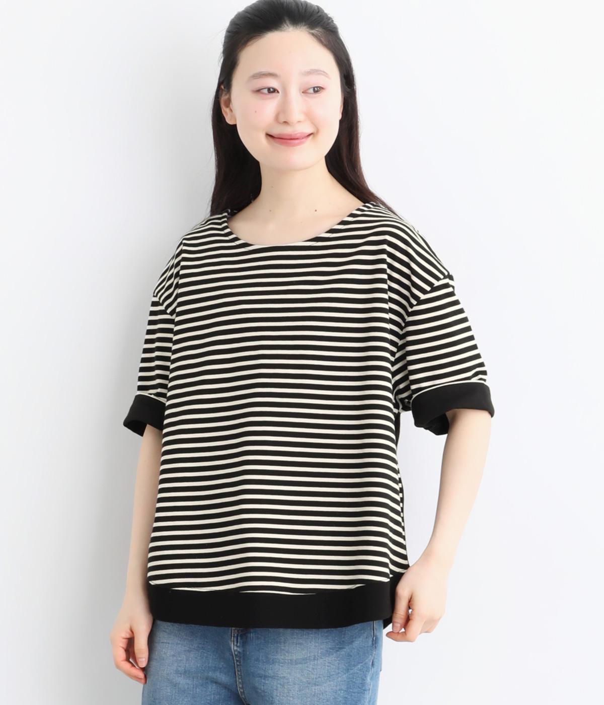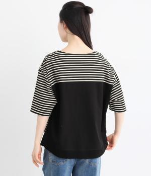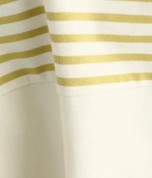ボーダー柄をベースにうしろのヨーク下を無地で切り替えた、メリハリのある一着。異なる表情を組み合わせることで、シンプルながらも立体感があります。ゆったりシルエットとやや長めの着丈で、体のラインを拾いにくいのも◎。袖口は裏地つきで、折り返してニュアンスを変えた着こなしもたのしめます。