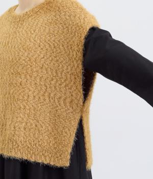 モコモコとしたボリューム感がコーディネートに季節感と愛らしさを与えるニットベスト。サイドをボタンひとつで留める仕様で、抜け感のある横姿がポイントです。アームホールは広めに設定して、さまざまなインナーに合わせやすくしています。