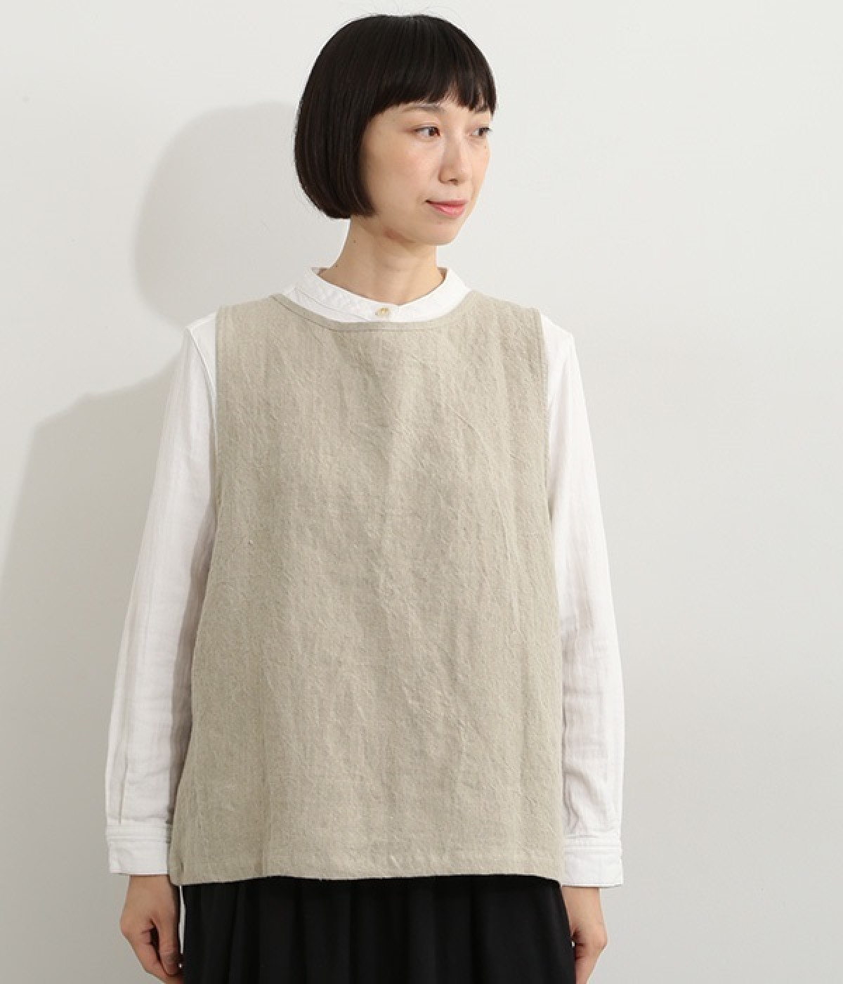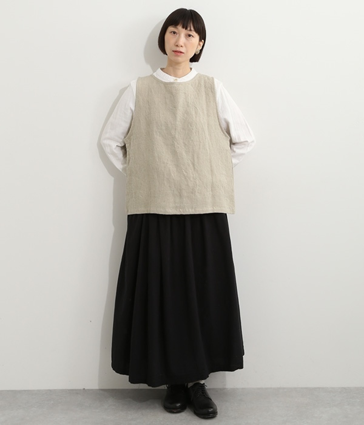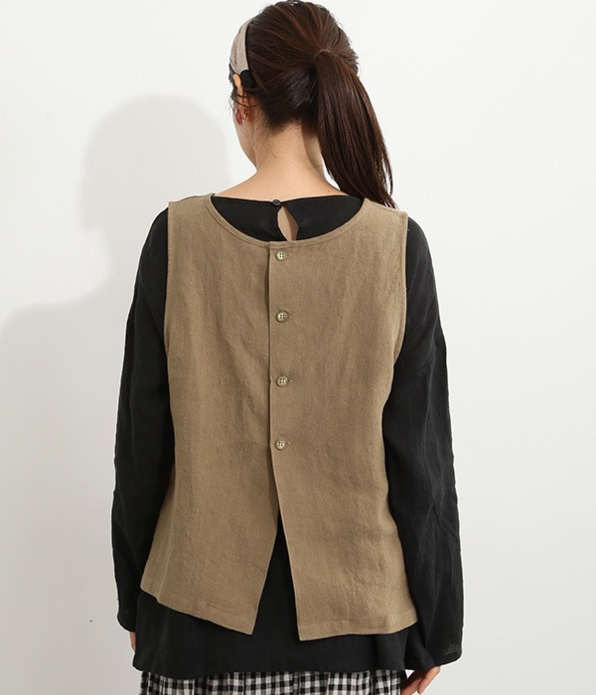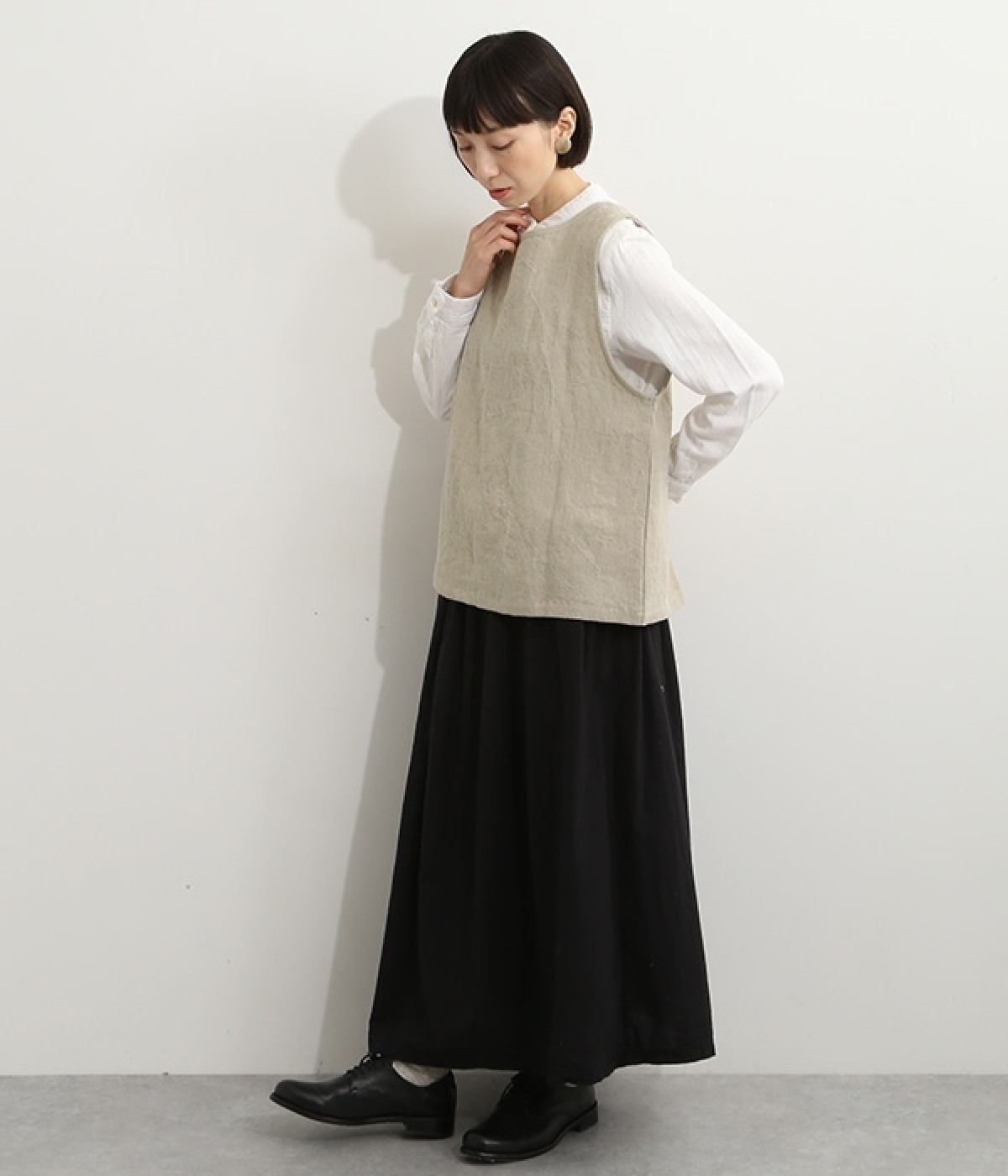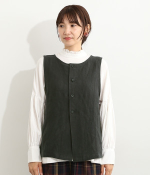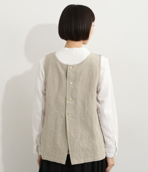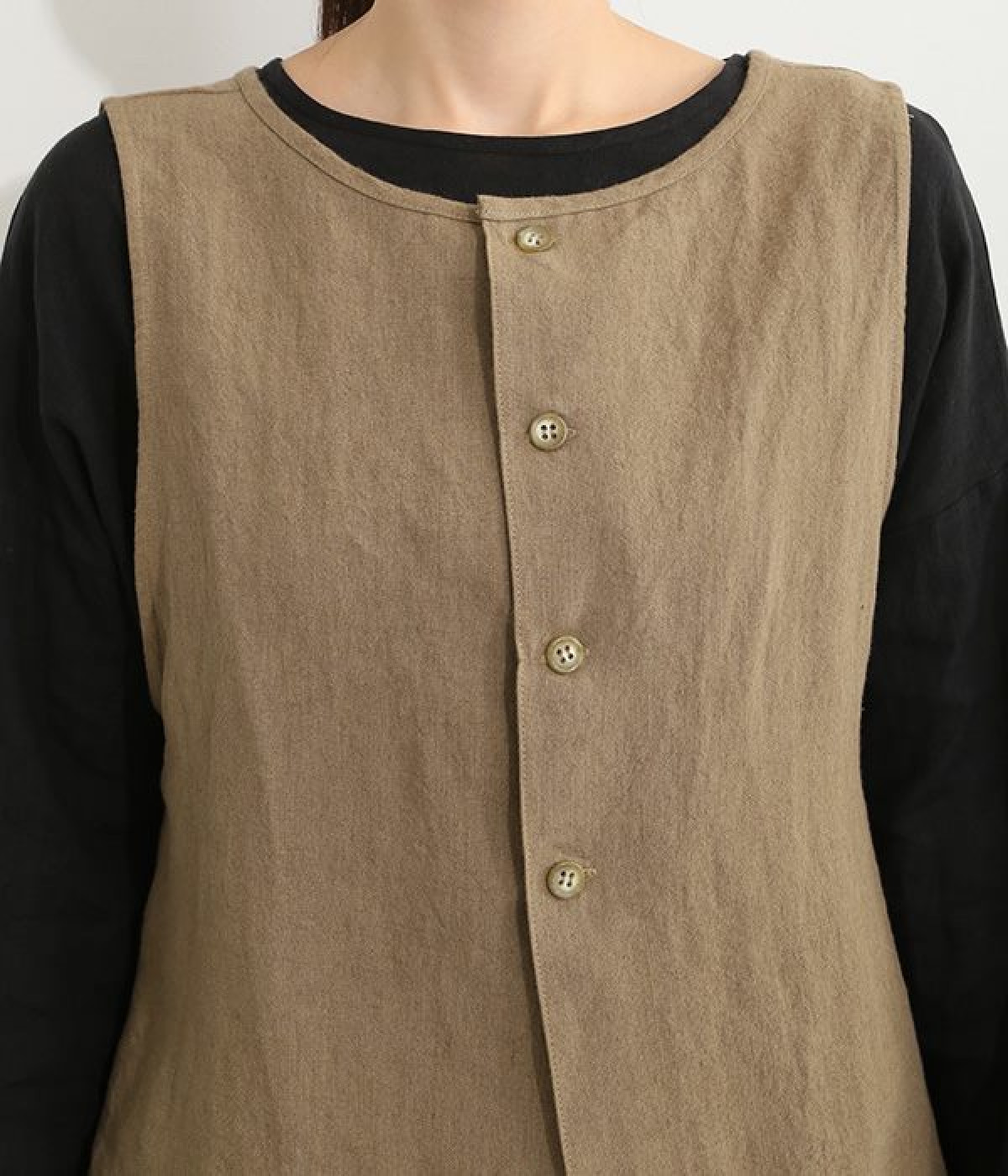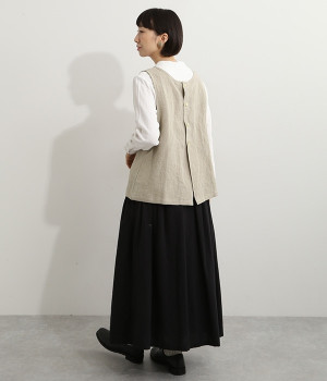 どちらを前にしても着まわせて、印象をお好みで変えられる2WAY仕様のベストです。ボリュームのあるトップスが多くなる秋冬シーズンぴったりな、アームホール広めのゆったりシルエット。通気性が良くライトな着心地が魅力のリネン素材を使用しています。シャツ合わせのベーシックなスタイリングはもちろん、ワンピースとの合わせもおすすめです。
