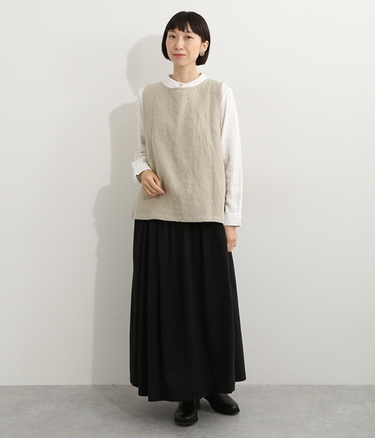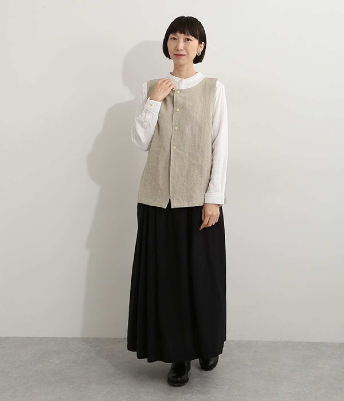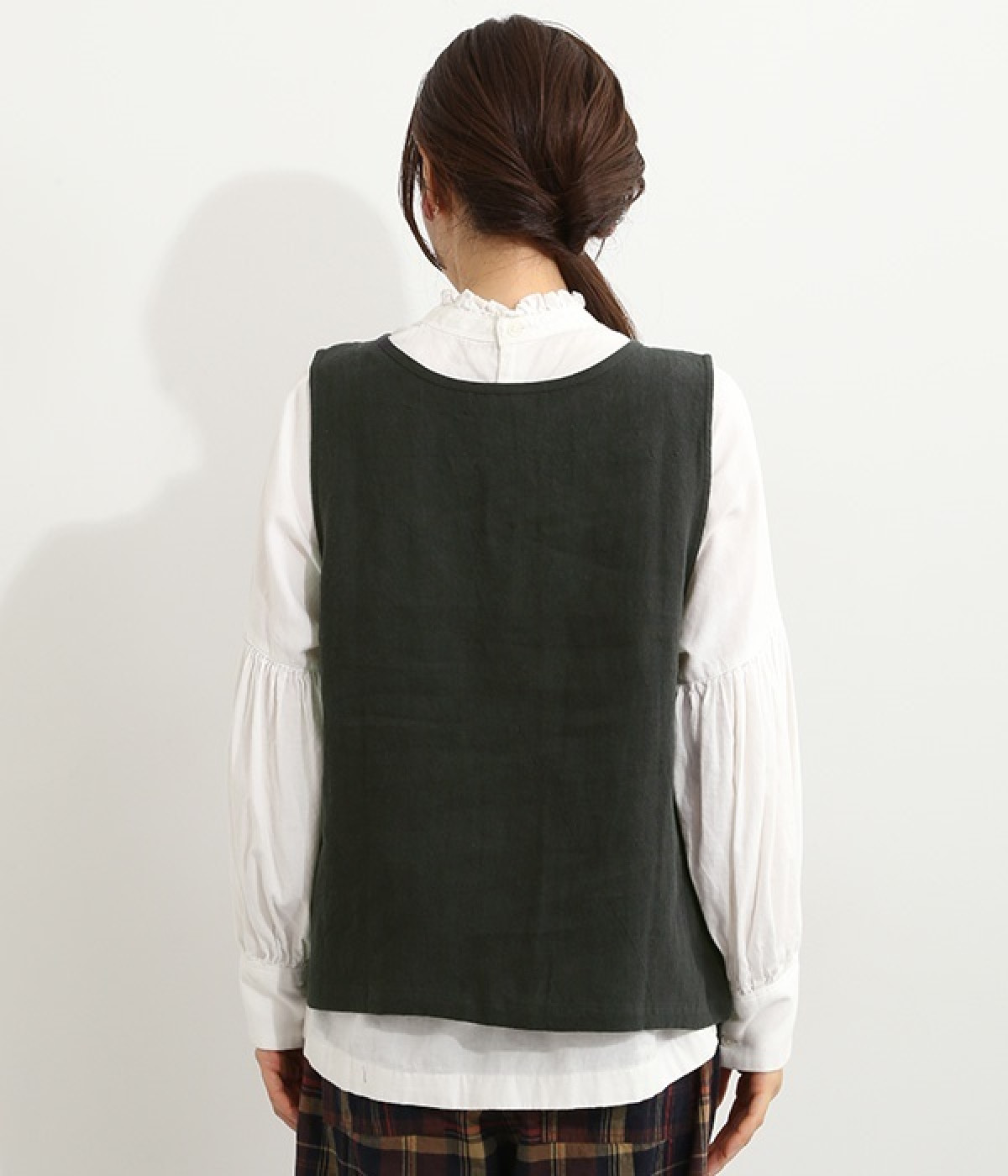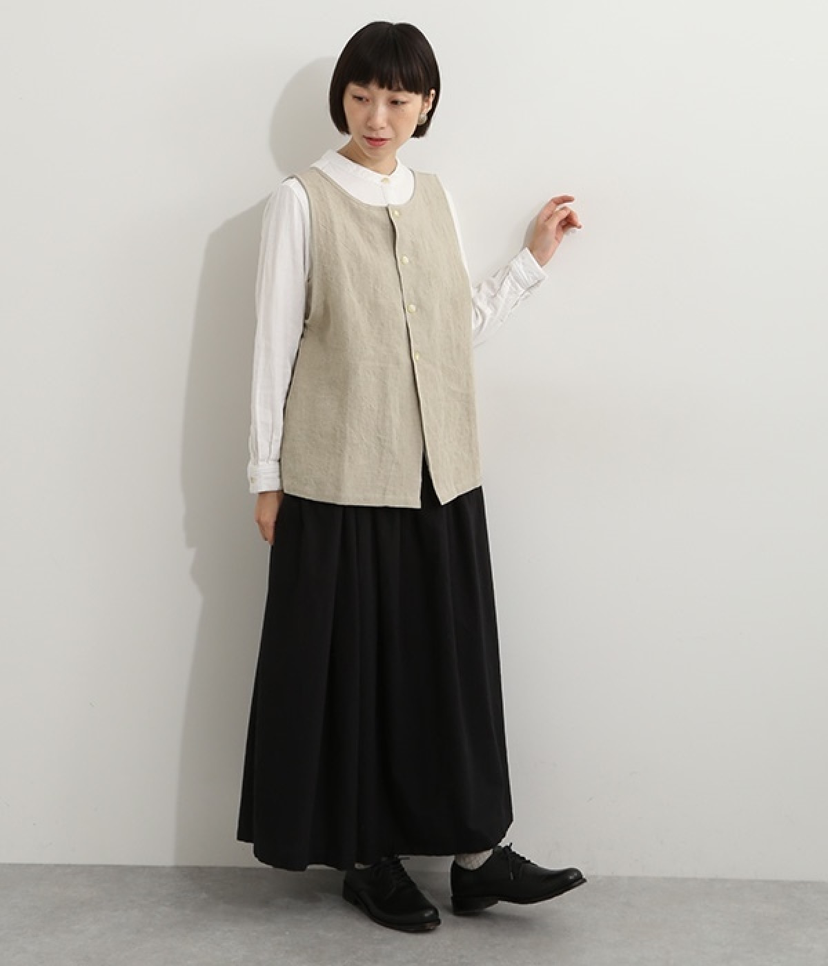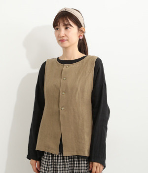 どちらを前にしても着まわせて、印象をお好みで変えられる2WAY仕様のベストです。ボリュームのあるトップスが多くなる秋冬シーズンぴったりな、アームホール広めのゆったりシルエット。通気性が良くライトな着心地が魅力のリネン素材を使用しています。シャツ合わせのベーシックなスタイリングはもちろん、ワンピースとの合わせもおすすめです。