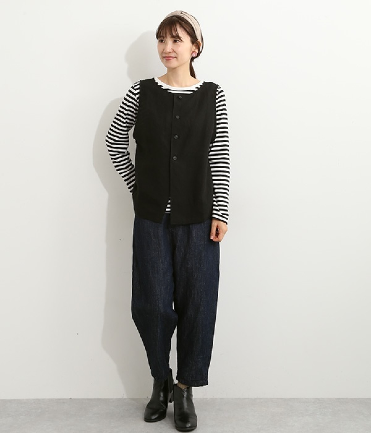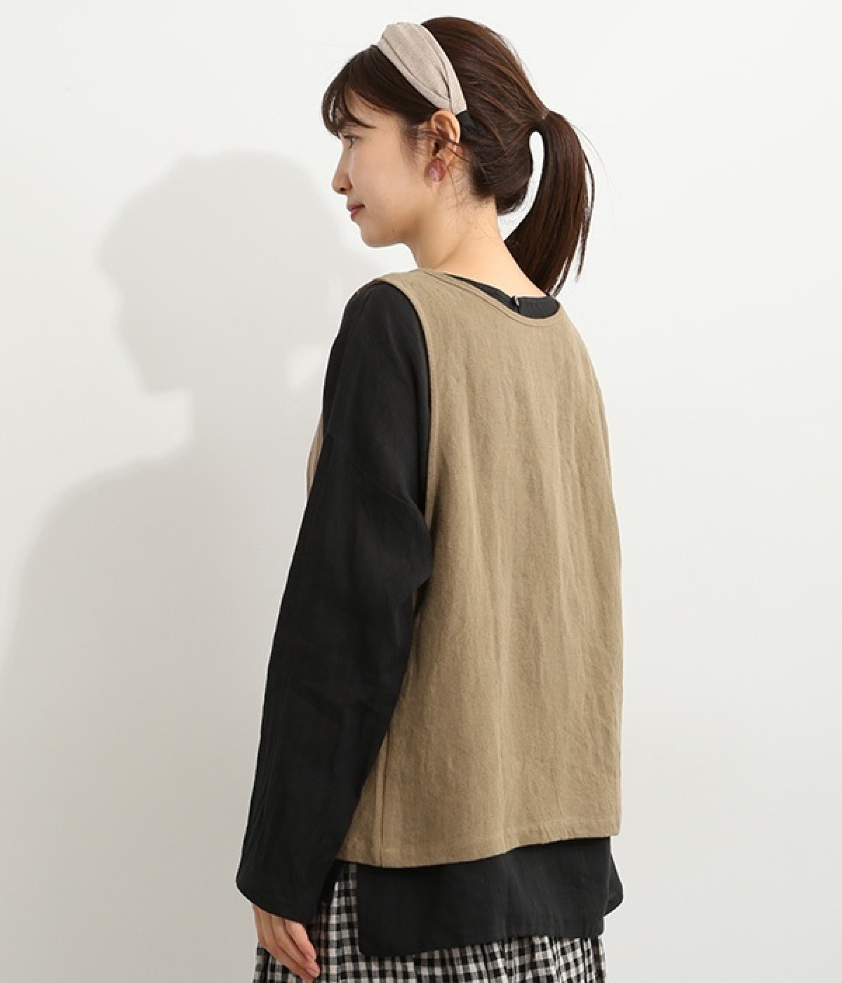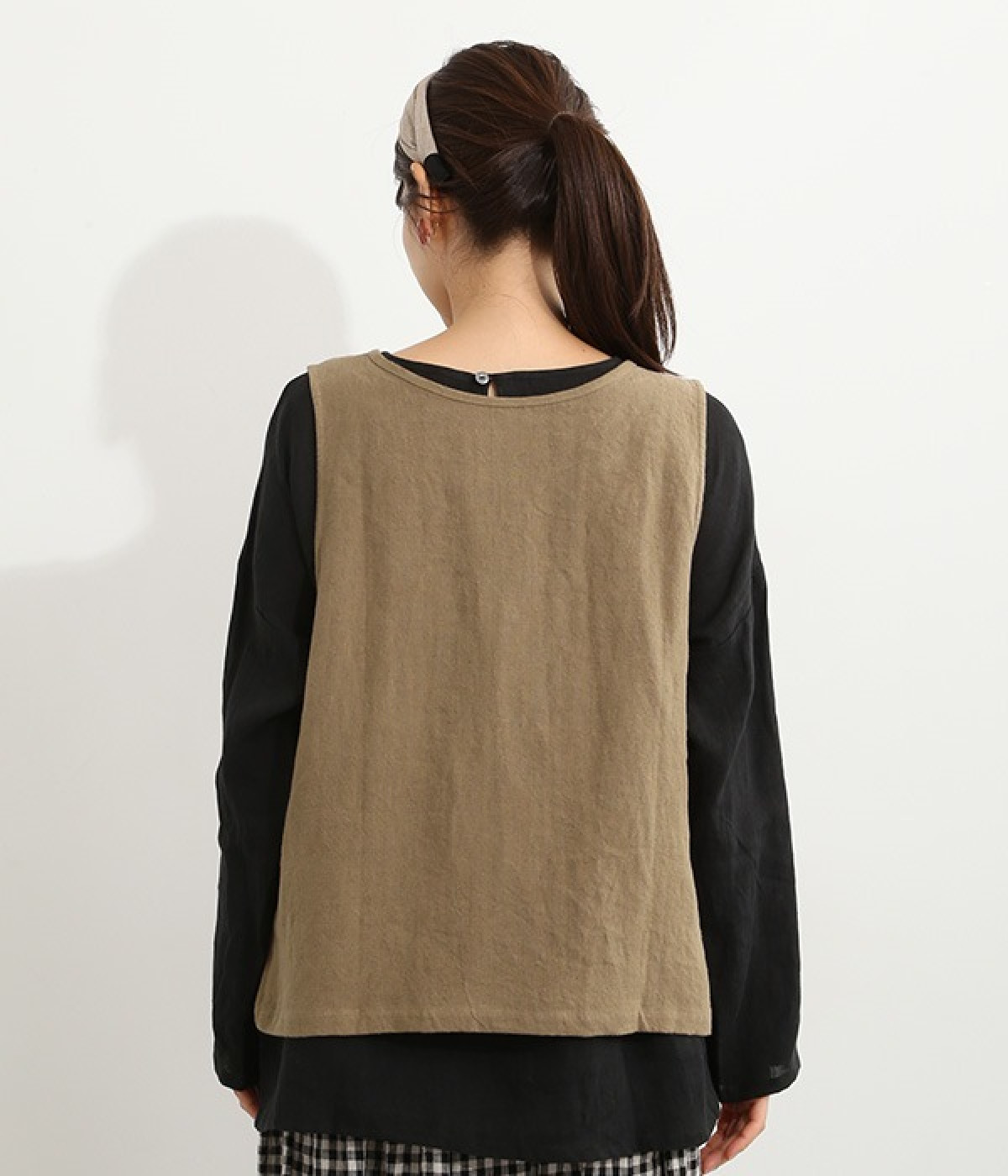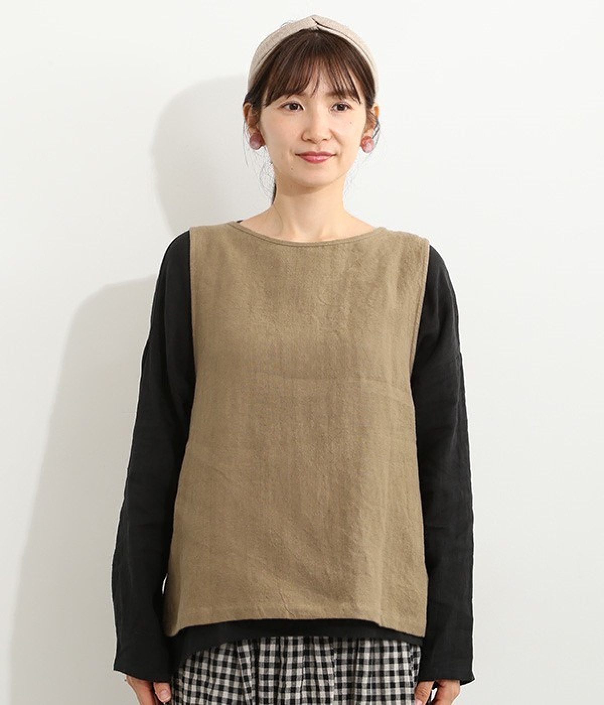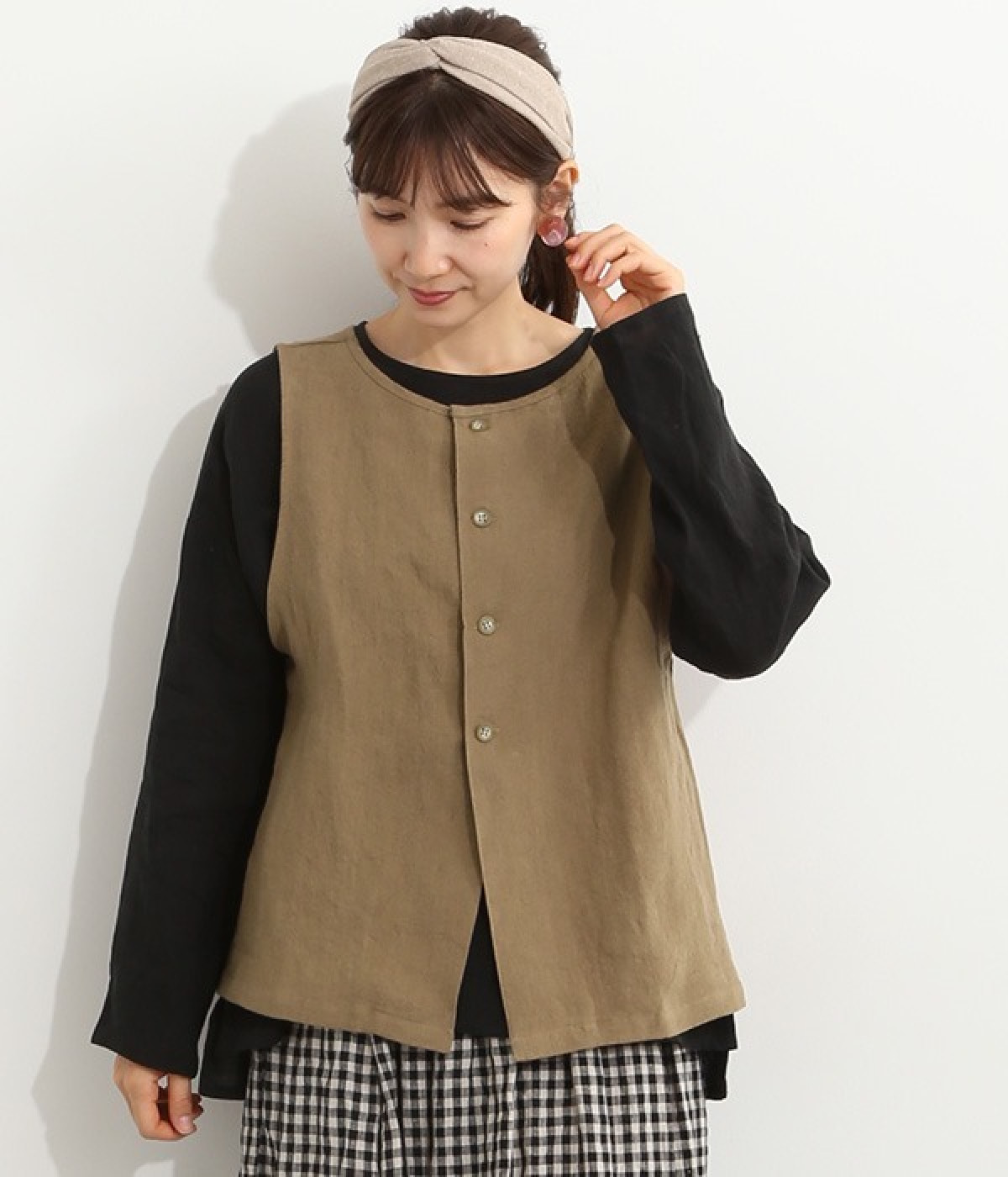 どちらを前にしても着まわせて、印象をお好みで変えられる2WAY仕様のベストです。ボリュームのあるトップスが多くなる秋冬シーズンぴったりな、アームホール広めのゆったりシルエット。通気性が良くライトな着心地が魅力のリネン素材を使用しています。シャツ合わせのベーシックなスタイリングはもちろん、ワンピースとの合わせもおすすめです。