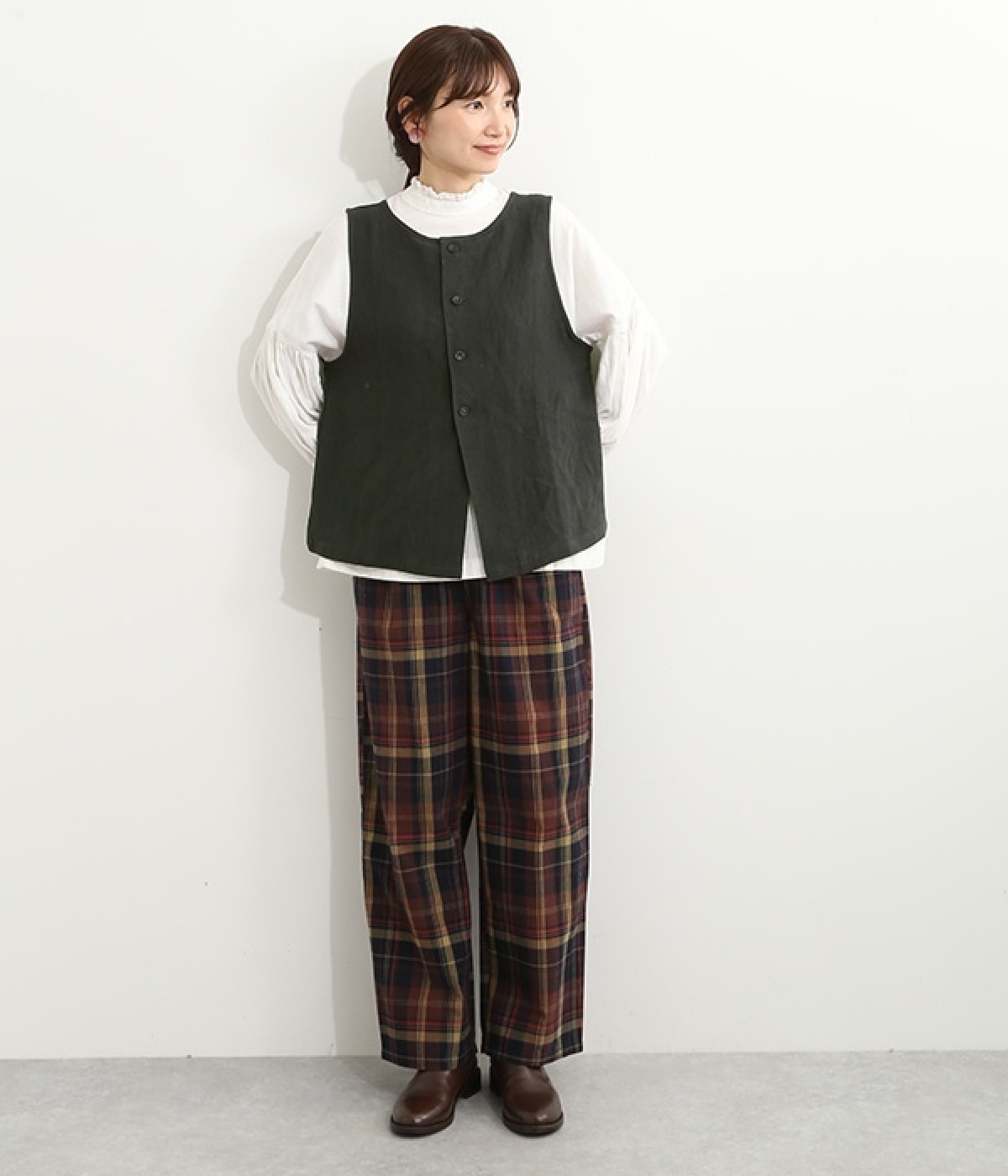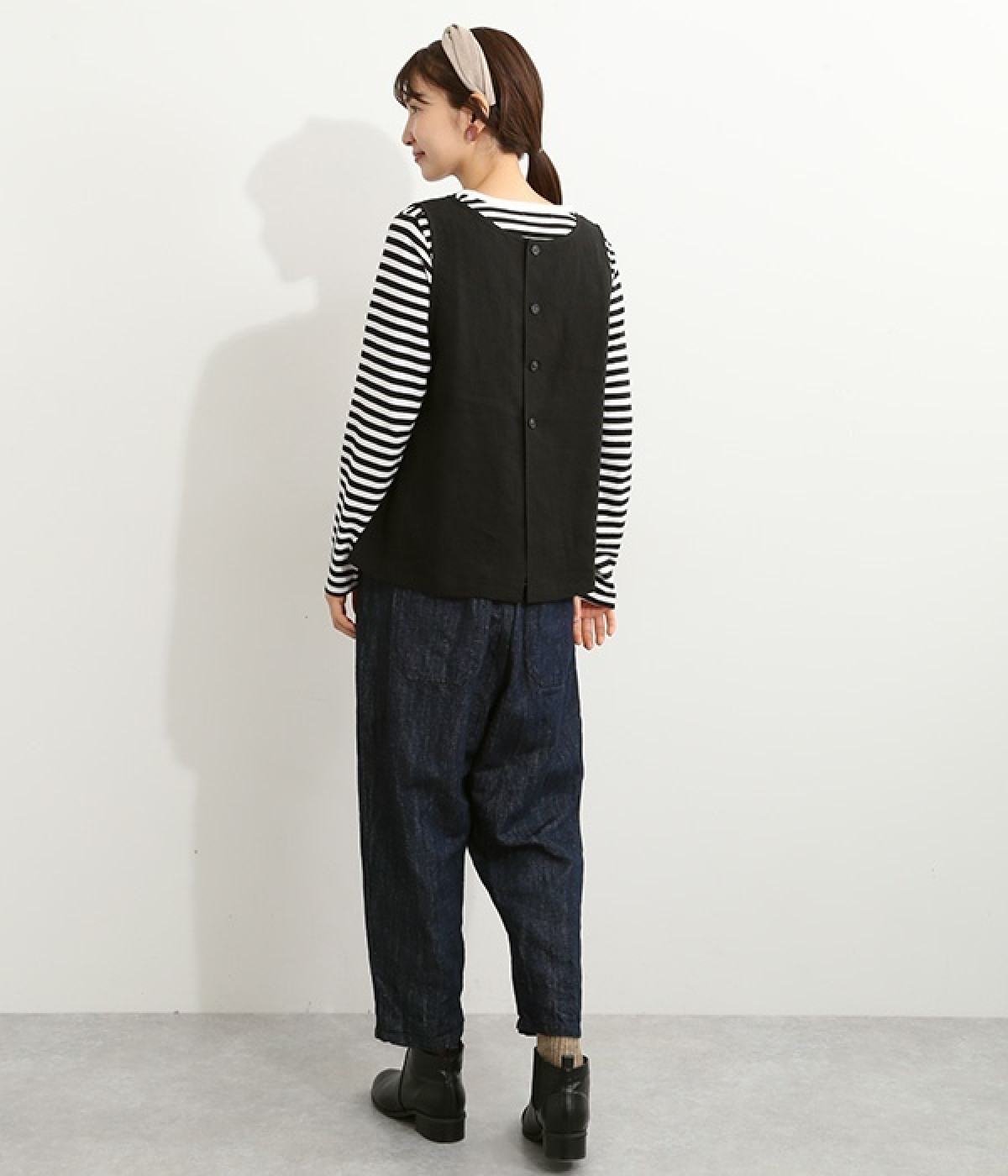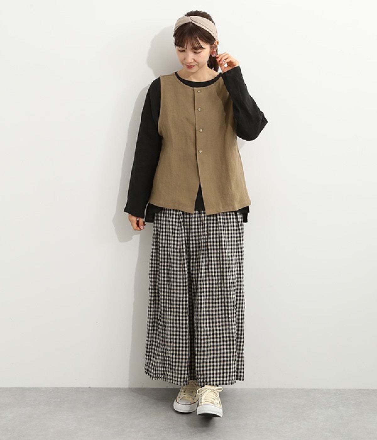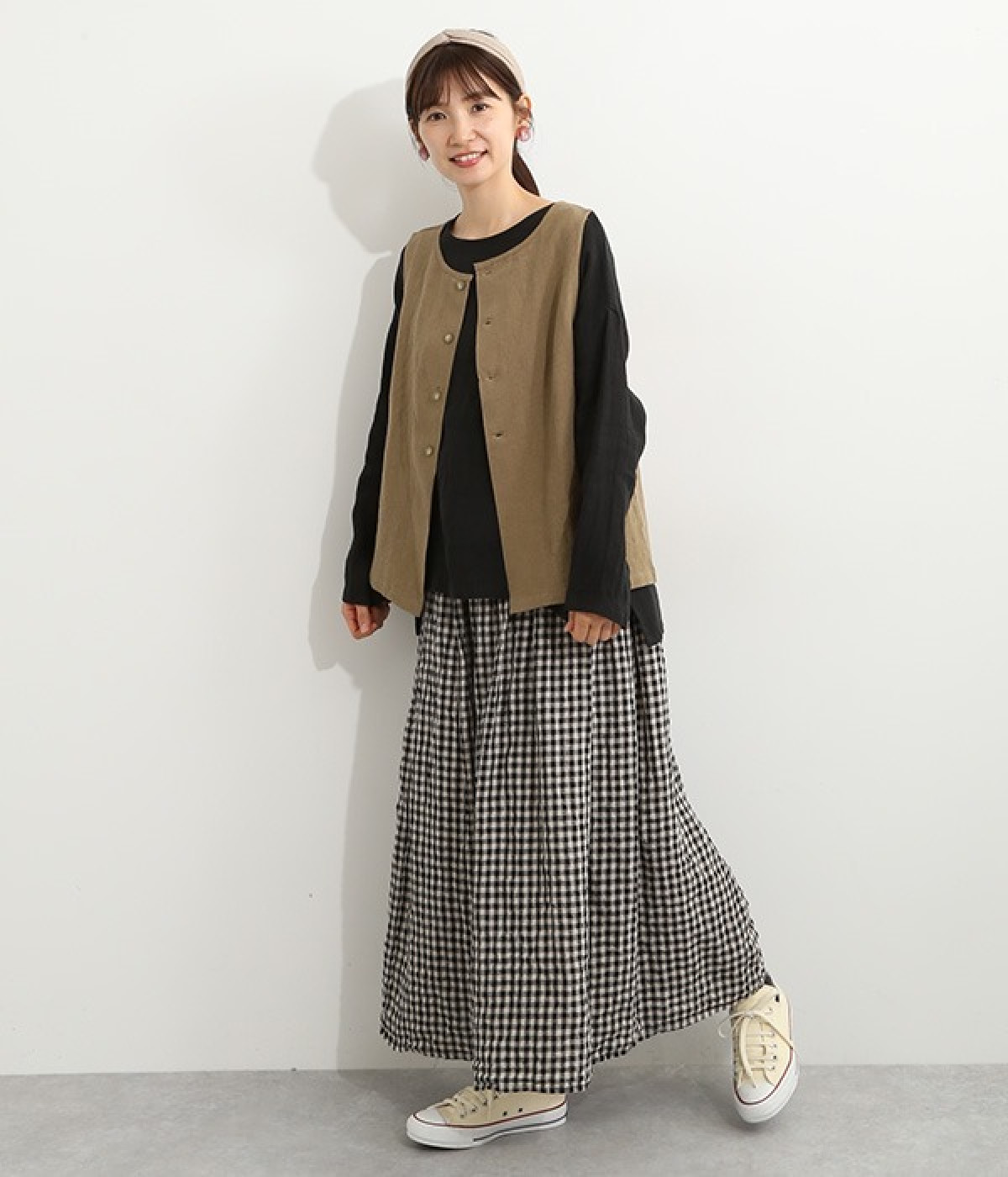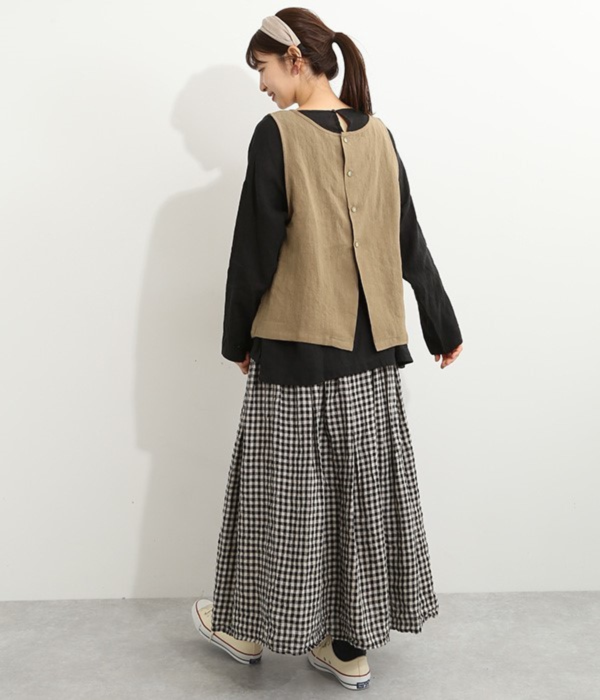 どちらを前にしても着まわせて、印象をお好みで変えられる2WAY仕様のベストです。ボリュームのあるトップスが多くなる秋冬シーズンぴったりな、アームホール広めのゆったりシルエット。通気性が良くライトな着心地が魅力のリネン素材を使用しています。シャツ合わせのベーシックなスタイリングはもちろん、ワンピースとの合わせもおすすめです。