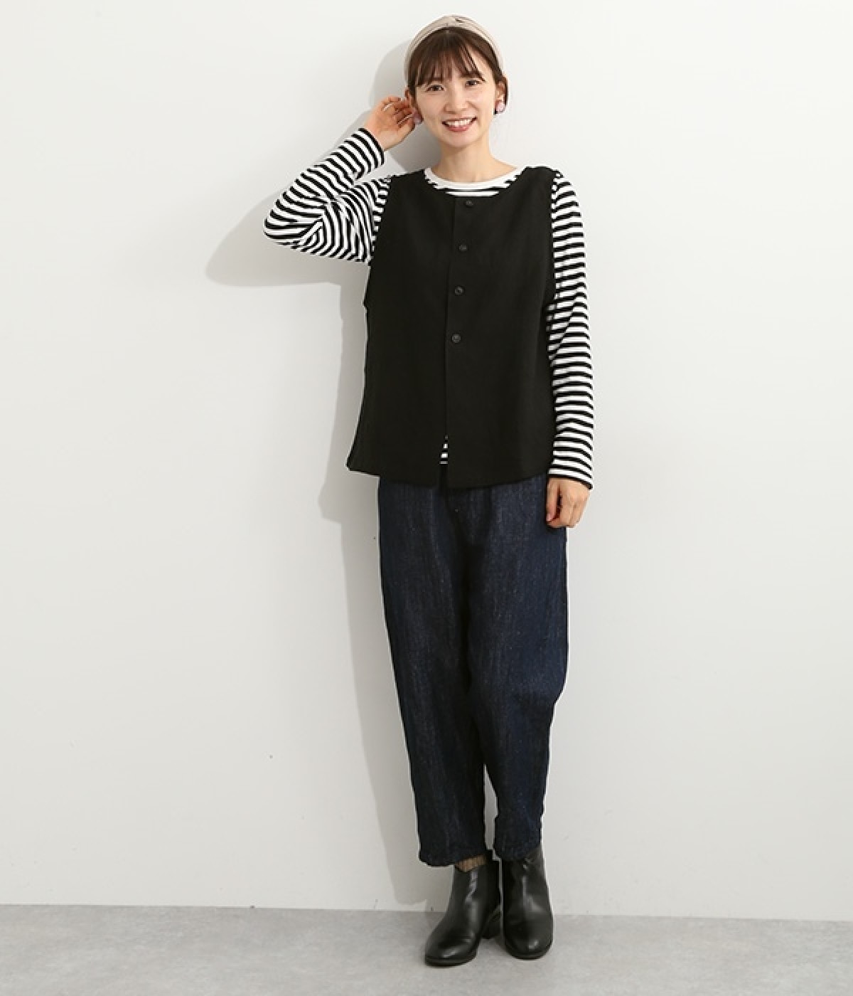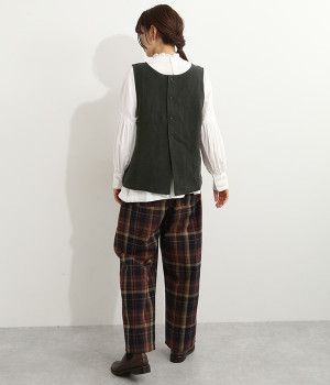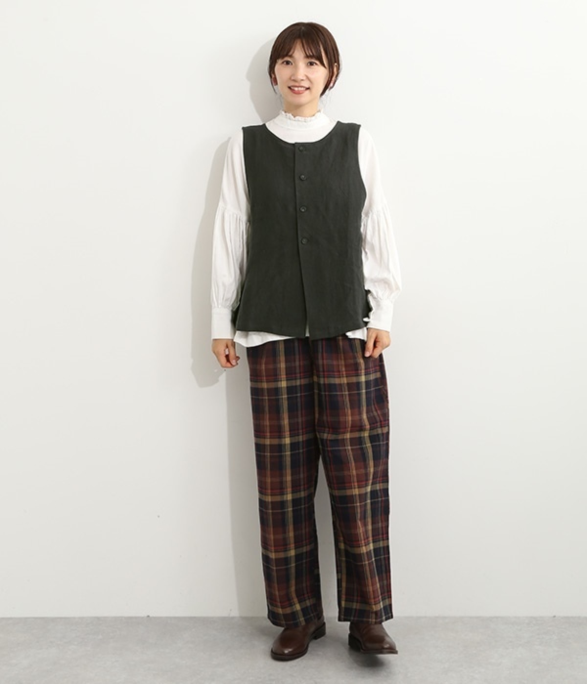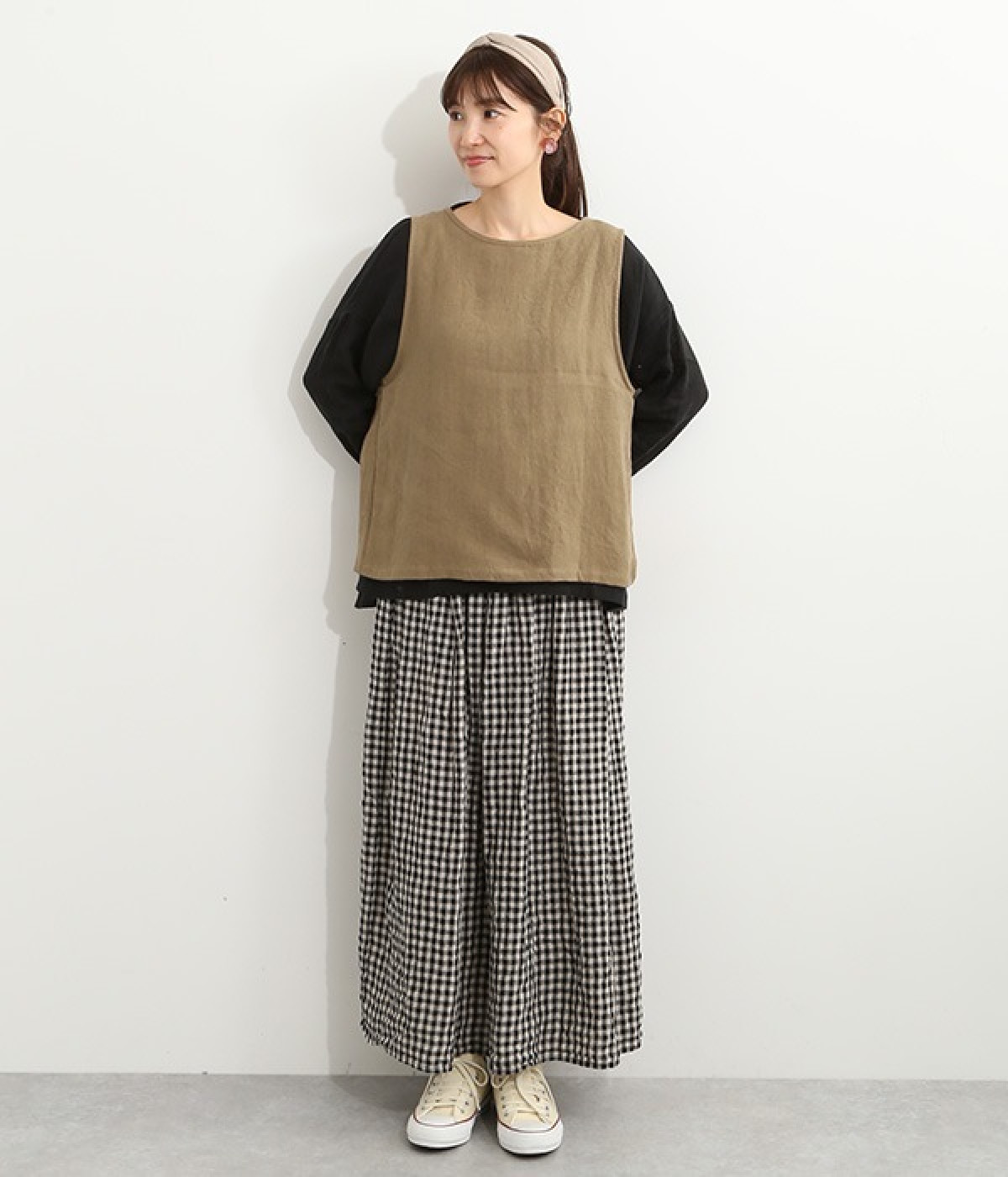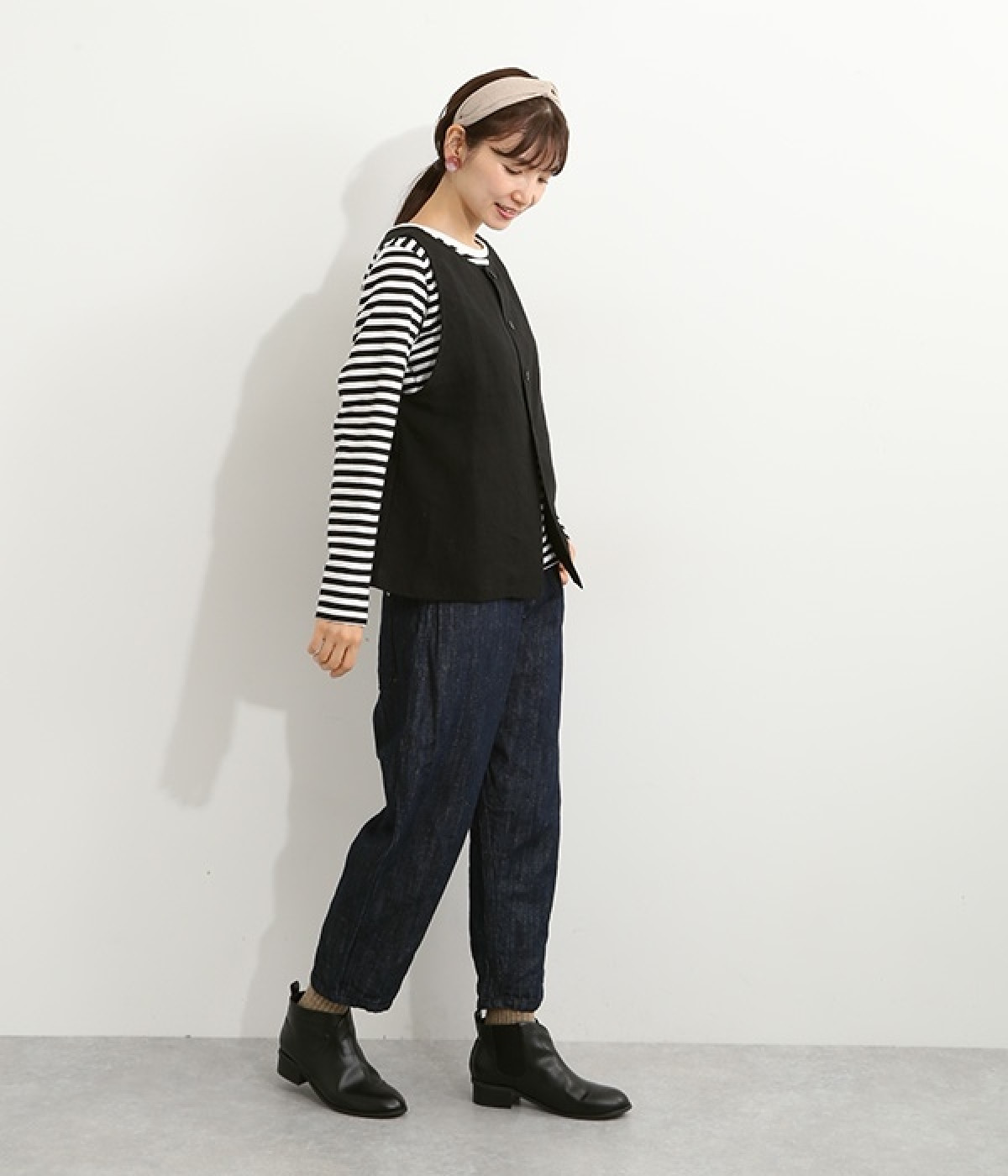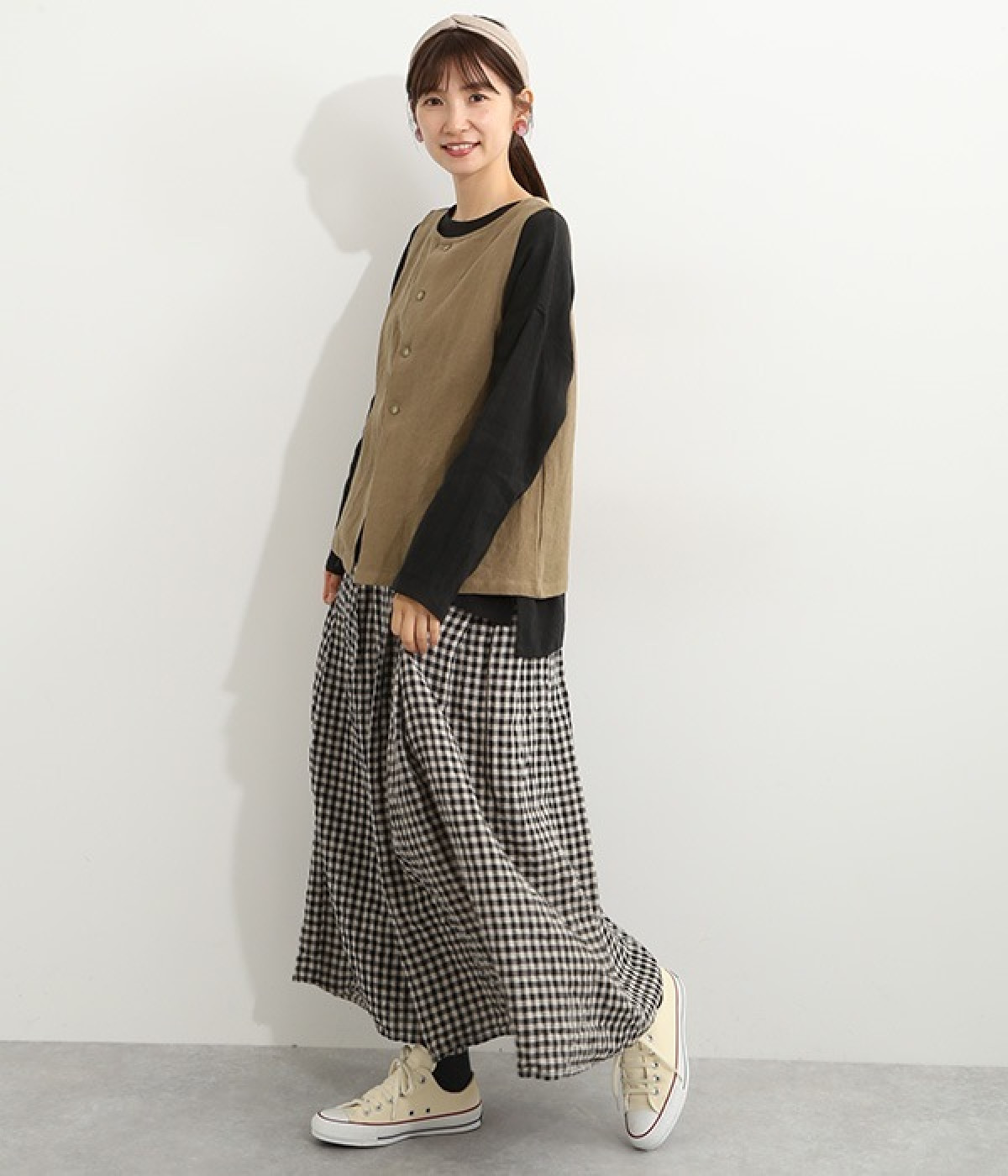 どちらを前にしても着まわせて、印象をお好みで変えられる2WAY仕様のベストです。ボリュームのあるトップスが多くなる秋冬シーズンぴったりな、アームホール広めのゆったりシルエット。通気性が良くライトな着心地が魅力のリネン素材を使用しています。シャツ合わせのベーシックなスタイリングはもちろん、ワンピースとの合わせもおすすめです。
