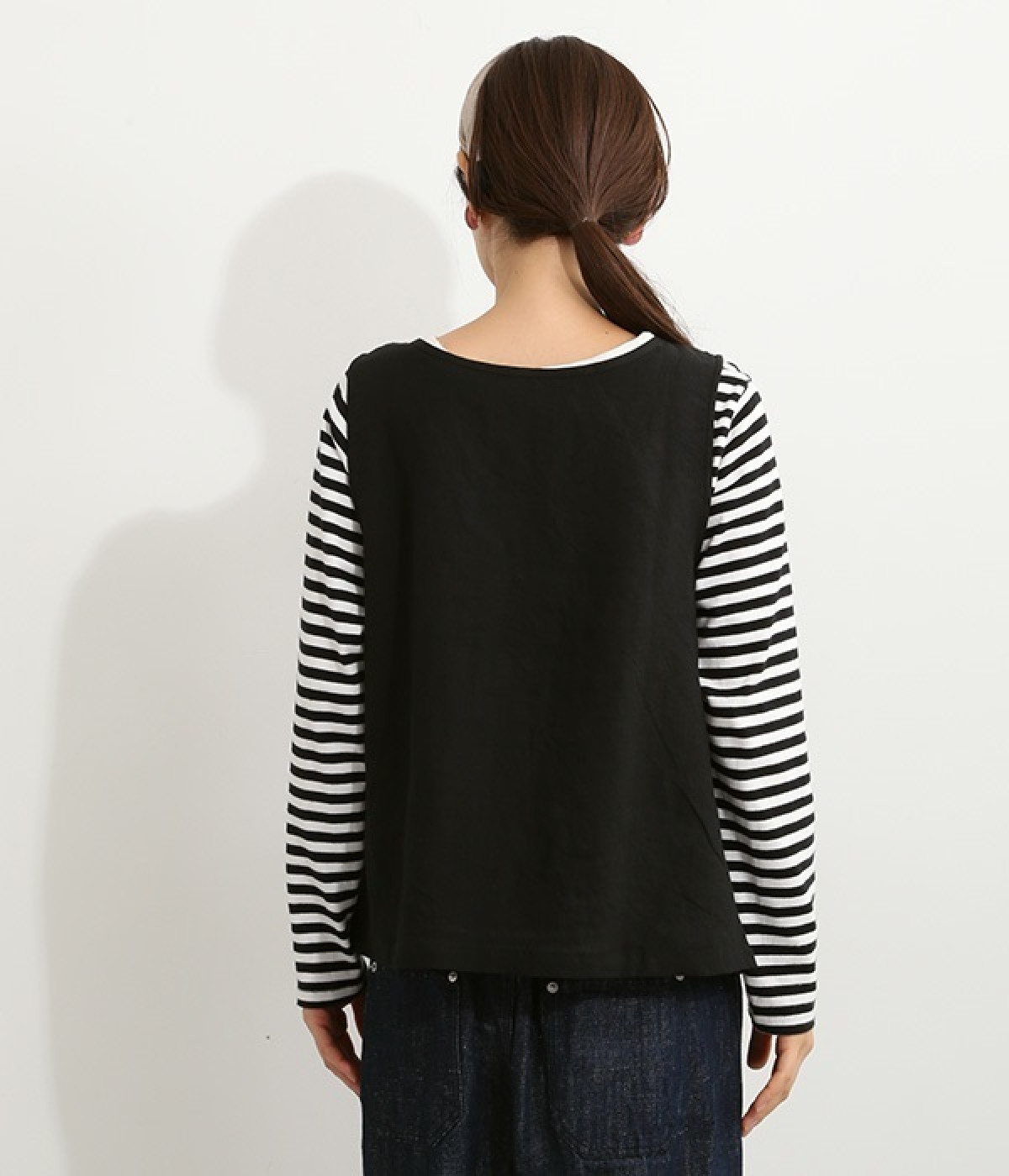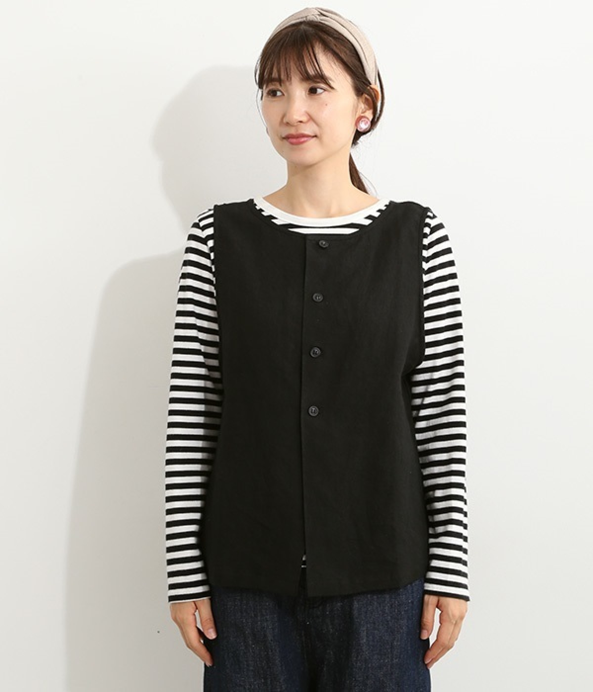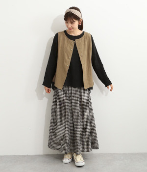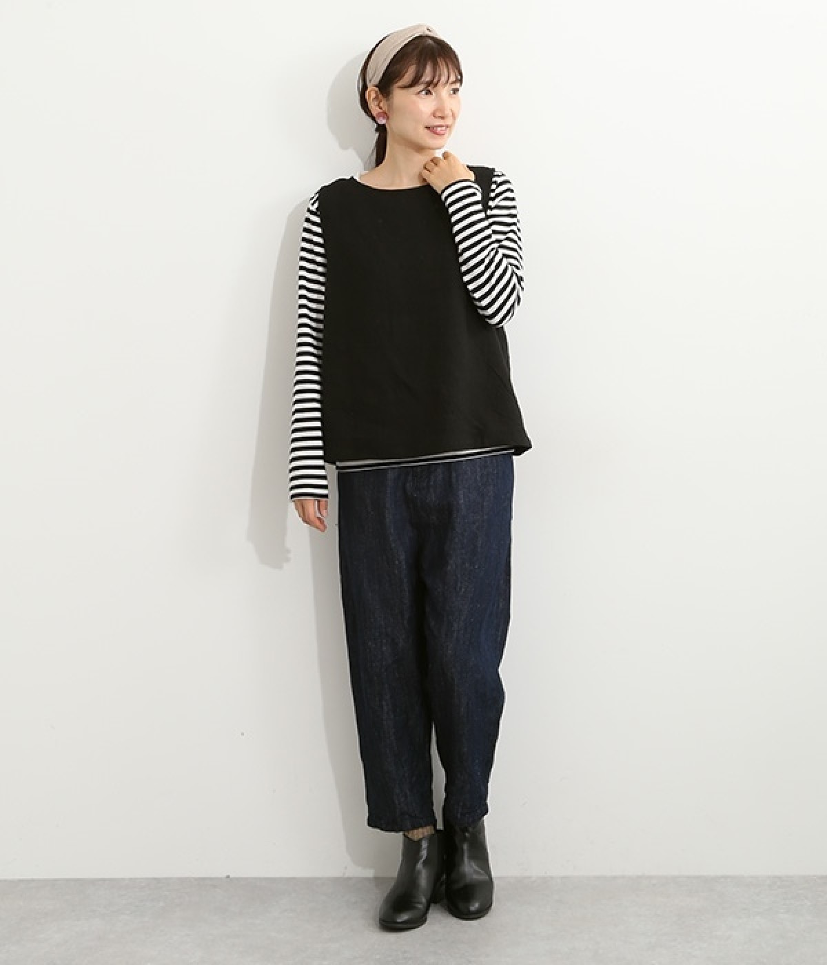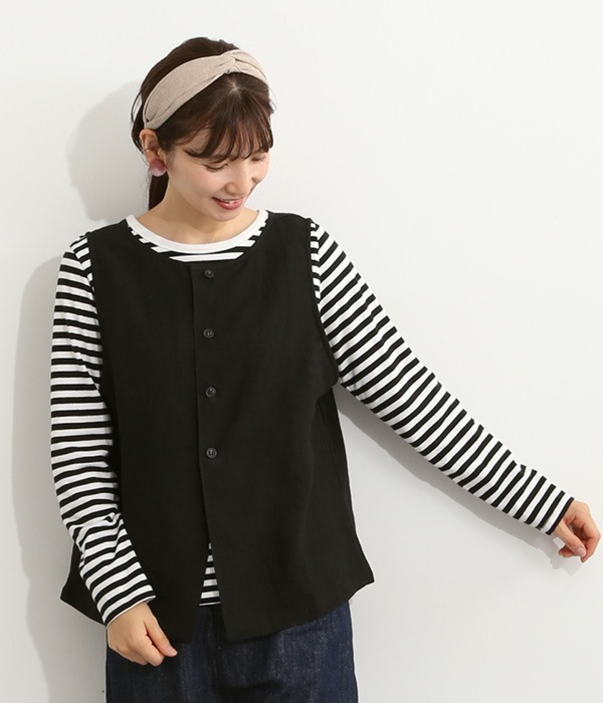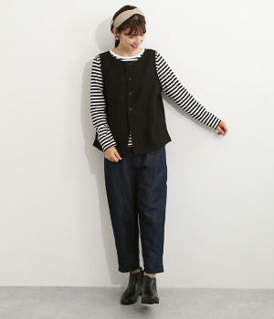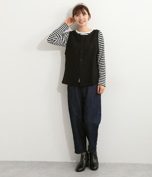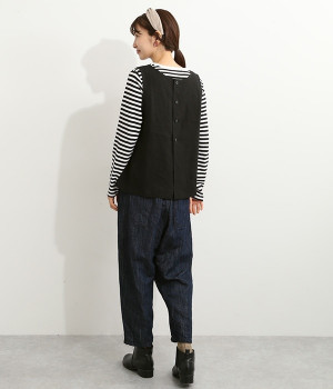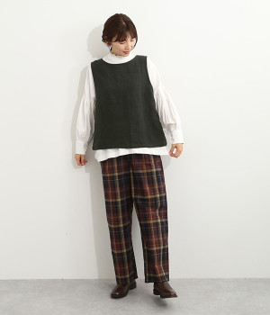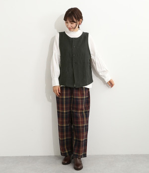 どちらを前にしても着まわせて、印象をお好みで変えられる2WAY仕様のベストです。ボリュームのあるトップスが多くなる秋冬シーズンぴったりな、アームホール広めのゆったりシルエット。通気性が良くライトな着心地が魅力のリネン素材を使用しています。シャツ合わせのベーシックなスタイリングはもちろん、ワンピースとの合わせもおすすめです。