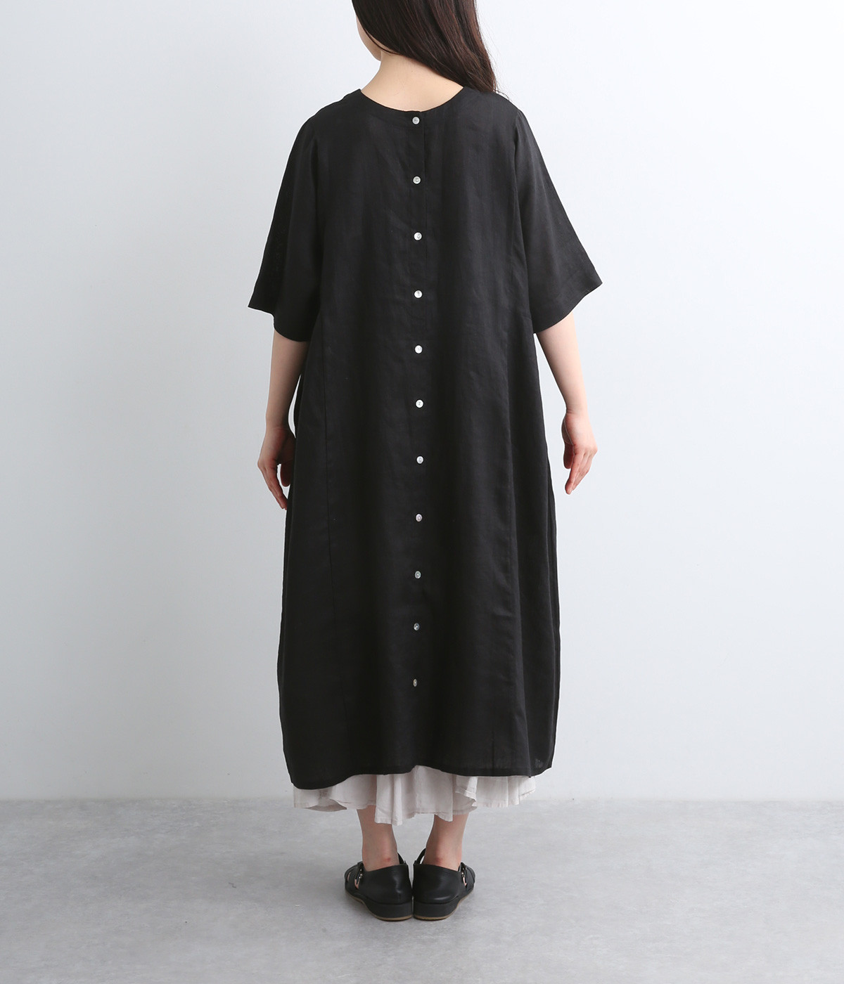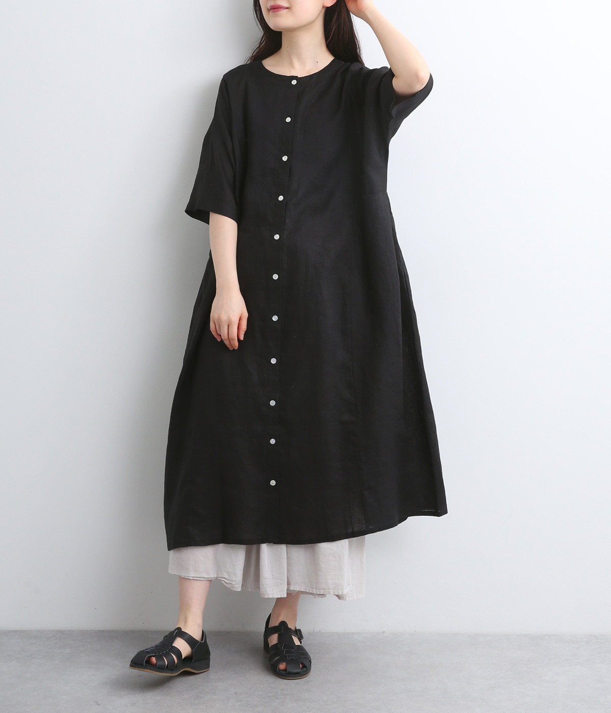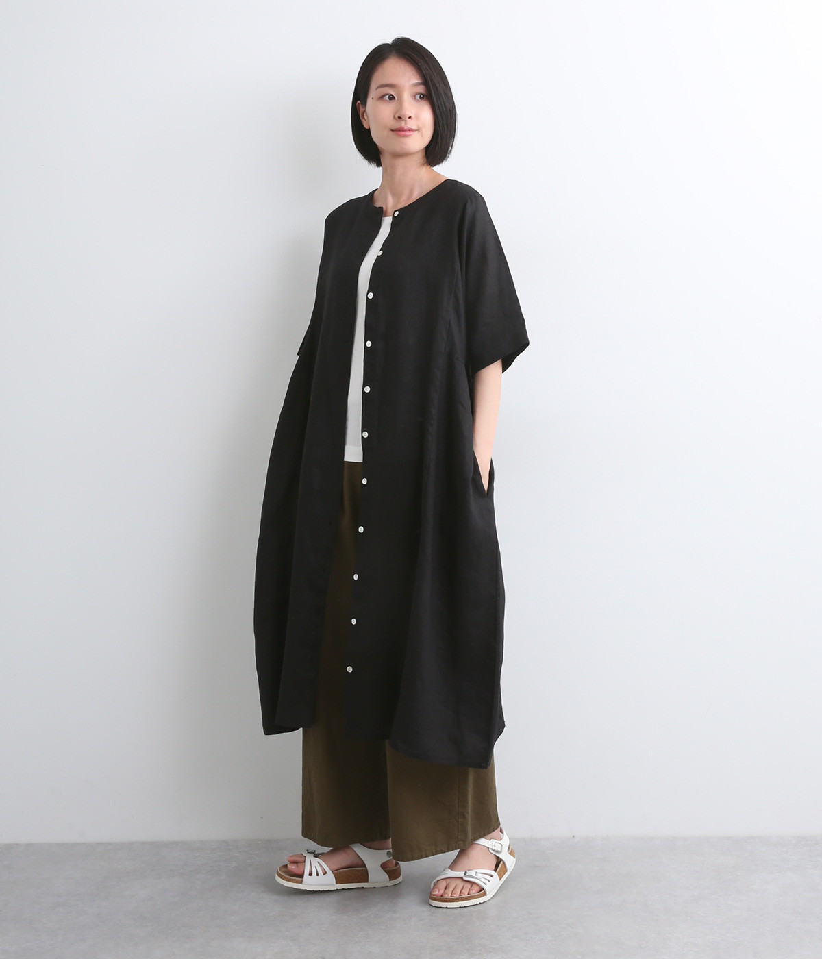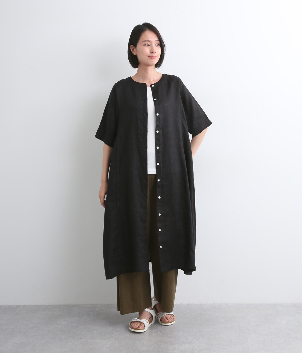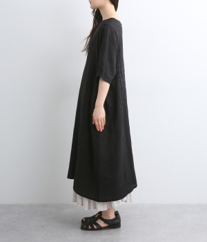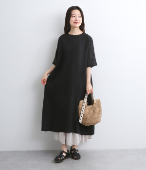 ほどよいハリと、やわらかな光沢感をまとったリネン素材を使用しました。着こむほどに肌になじんでいく、経年変化を楽しめる素材です。