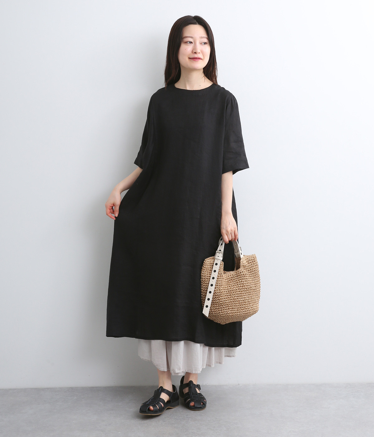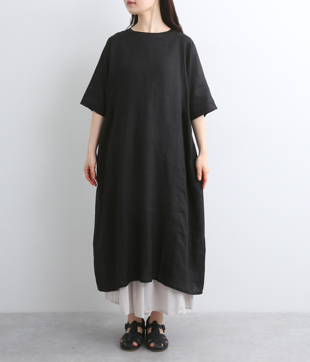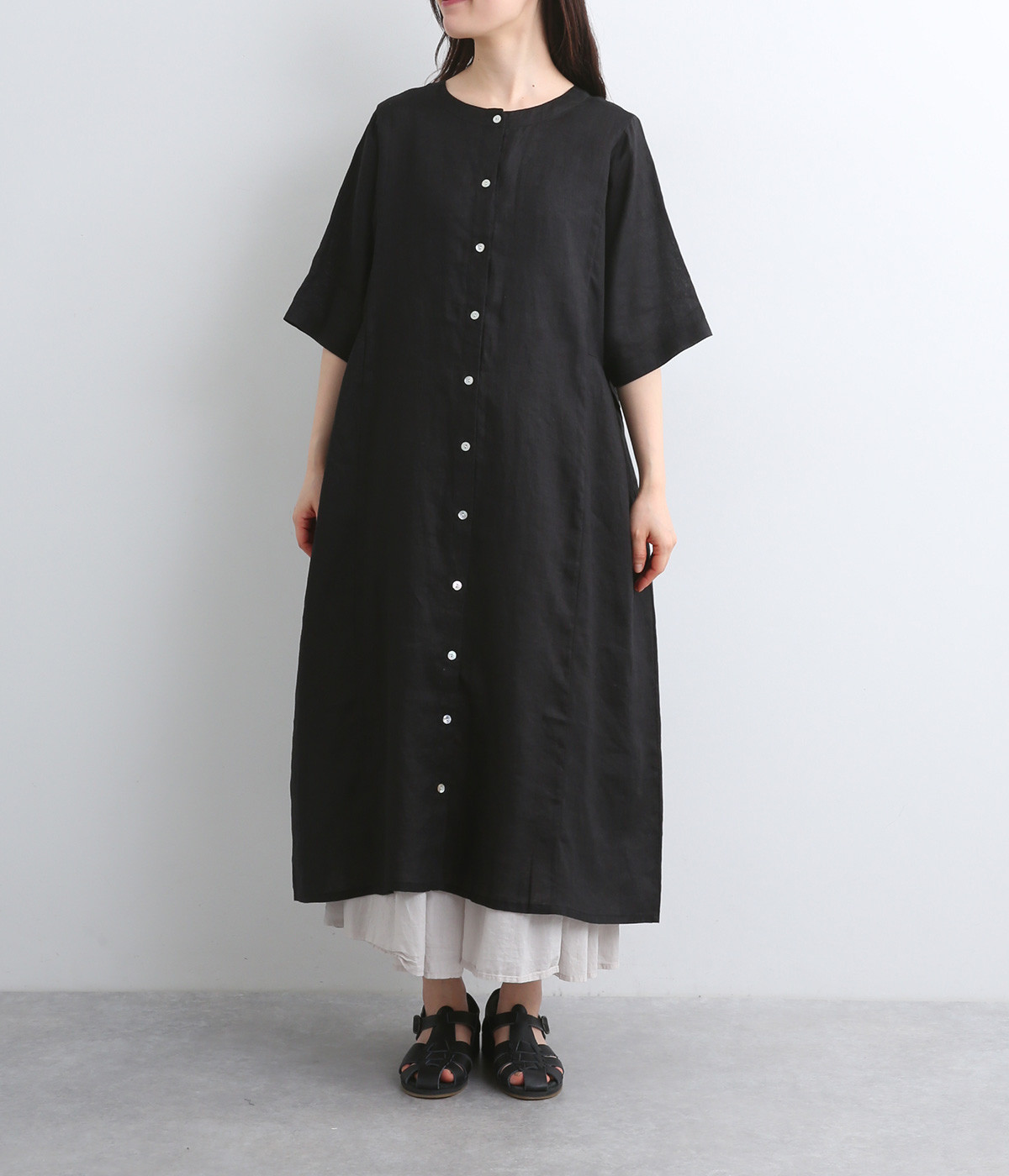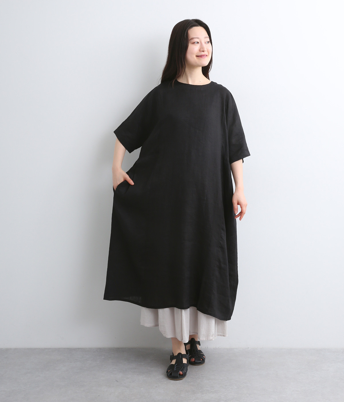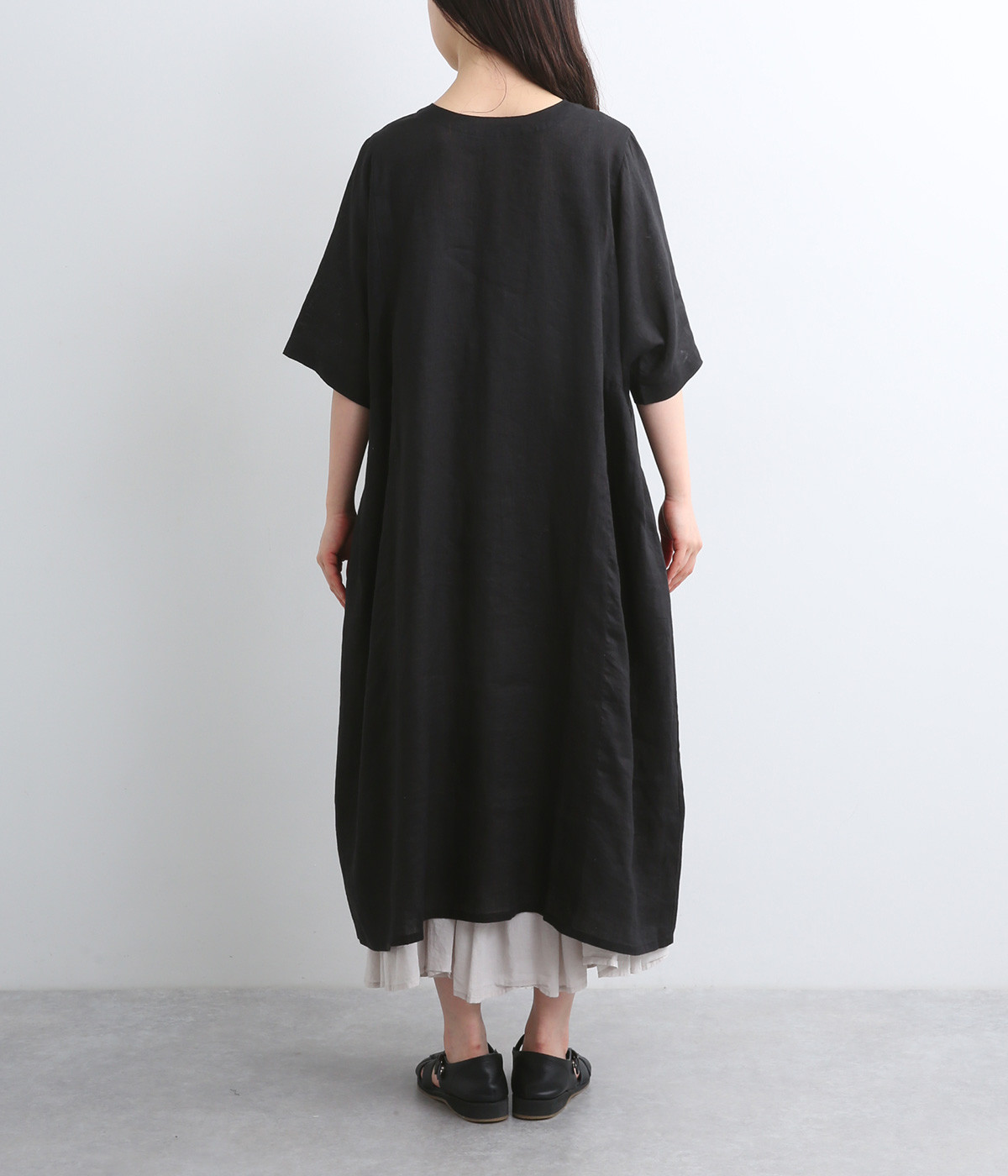 ほどよいハリと、やわらかな光沢感をまとったリネン素材を使用しました。着こむほどに肌になじんでいく、経年変化を楽しめる素材です。