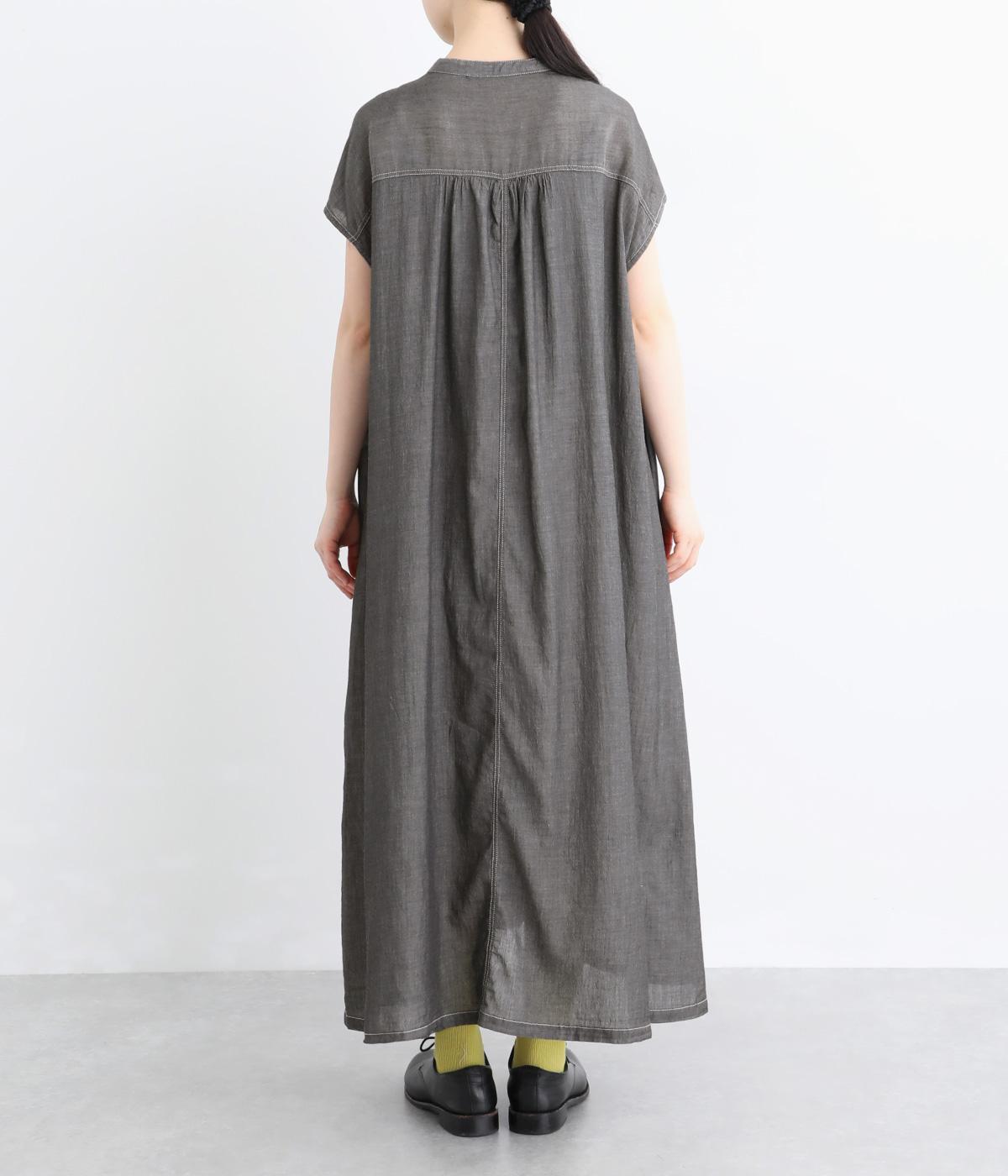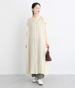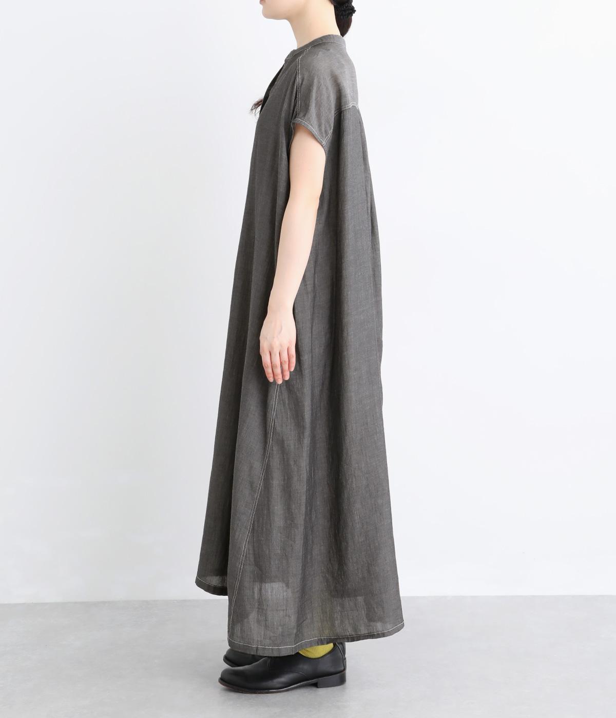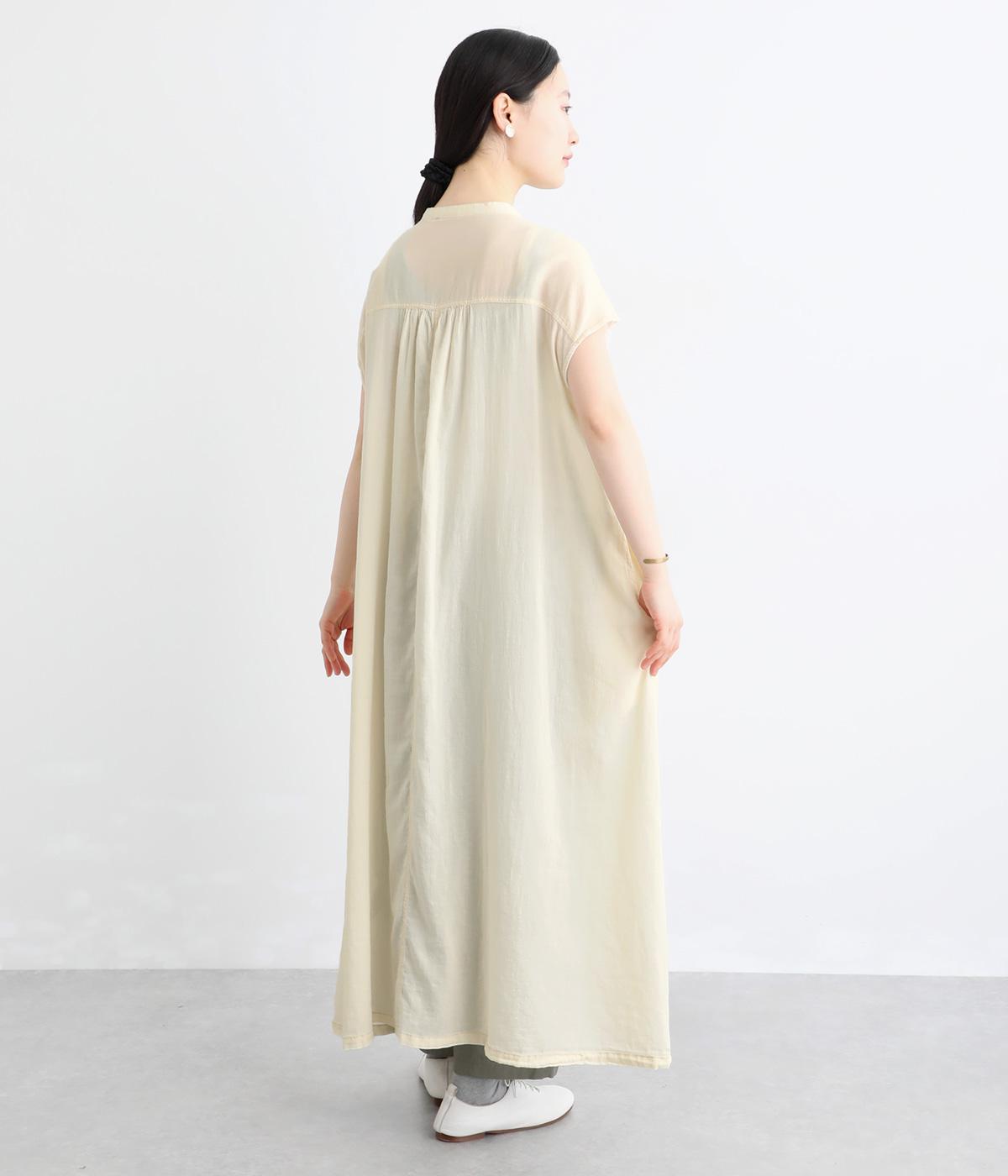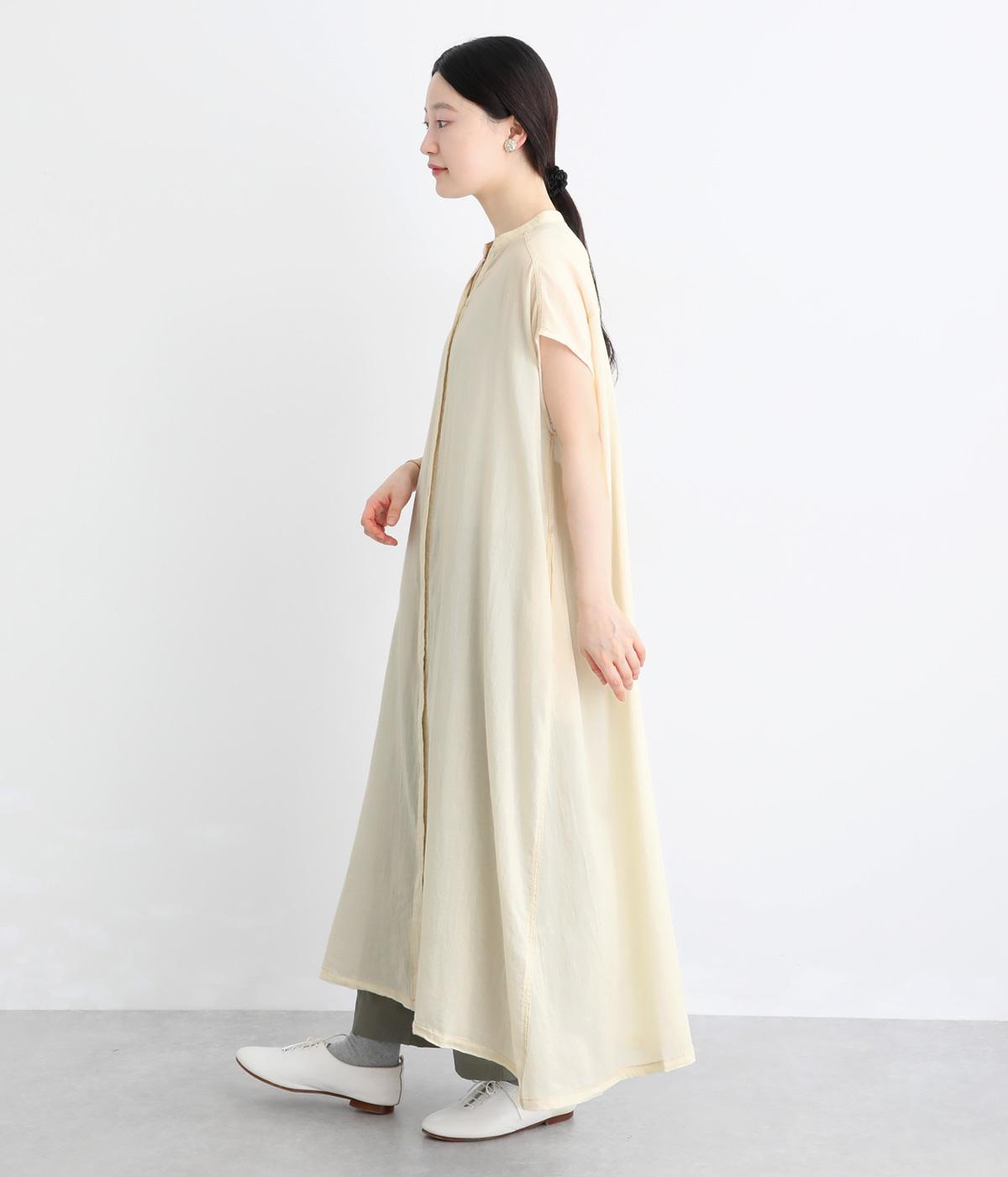 首元に抜け感をつくるスキッパーネックと、女性らしい上品なフレンチスリーブが魅力のワンピースです。身頃にたっぷり施したギャザーと落ち感のある素材が、美しいAラインのドレープシルエットを描きます。一枚でさらりとまとうだけでもサマになり、大人のリラックスムードを品よく引き立てる一着です。