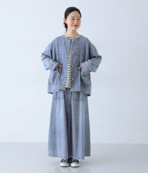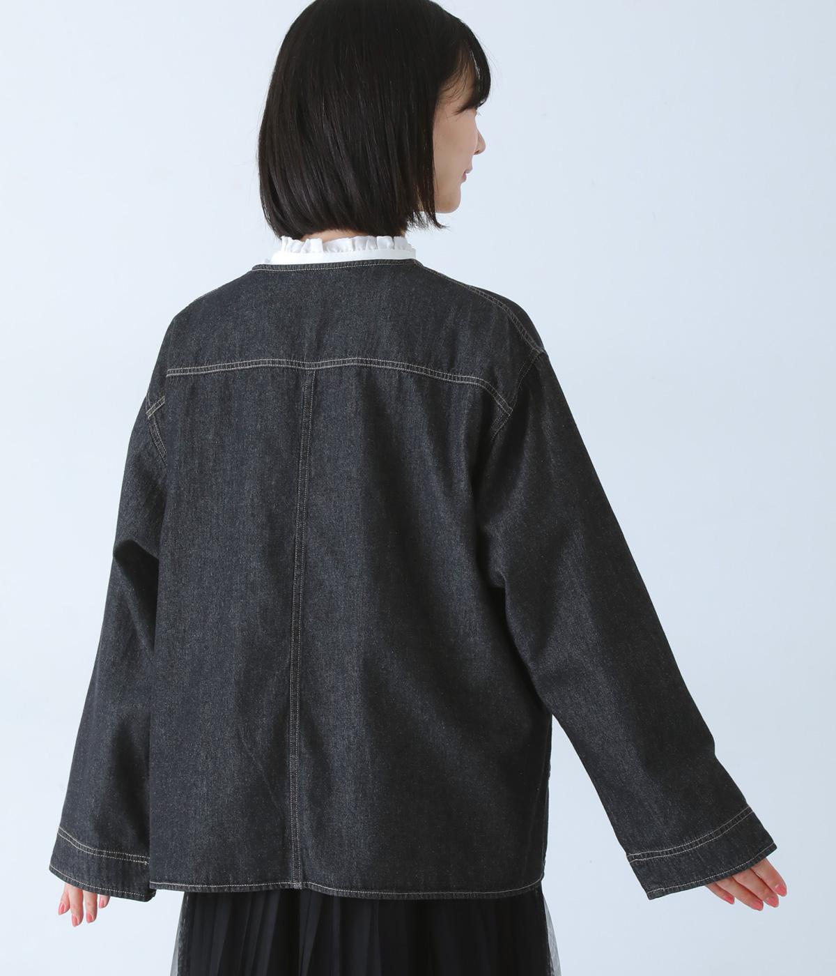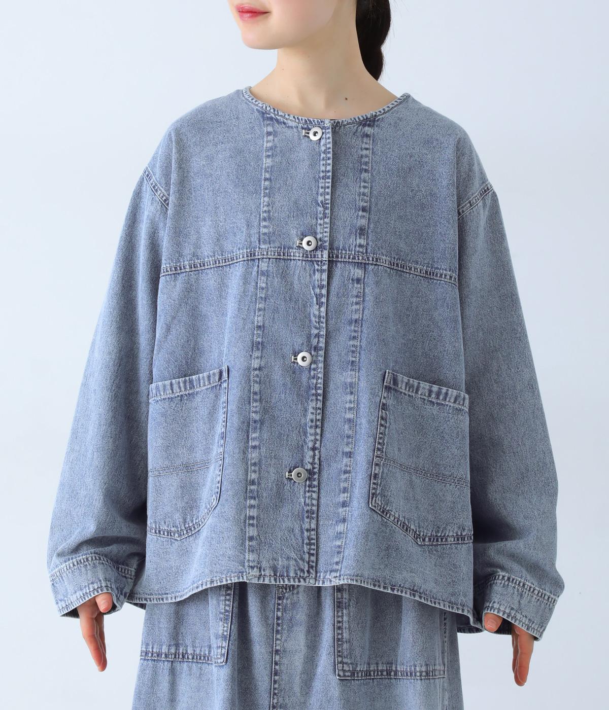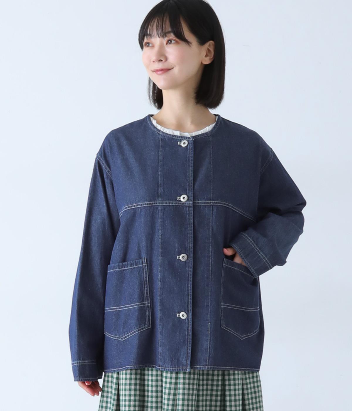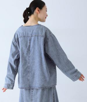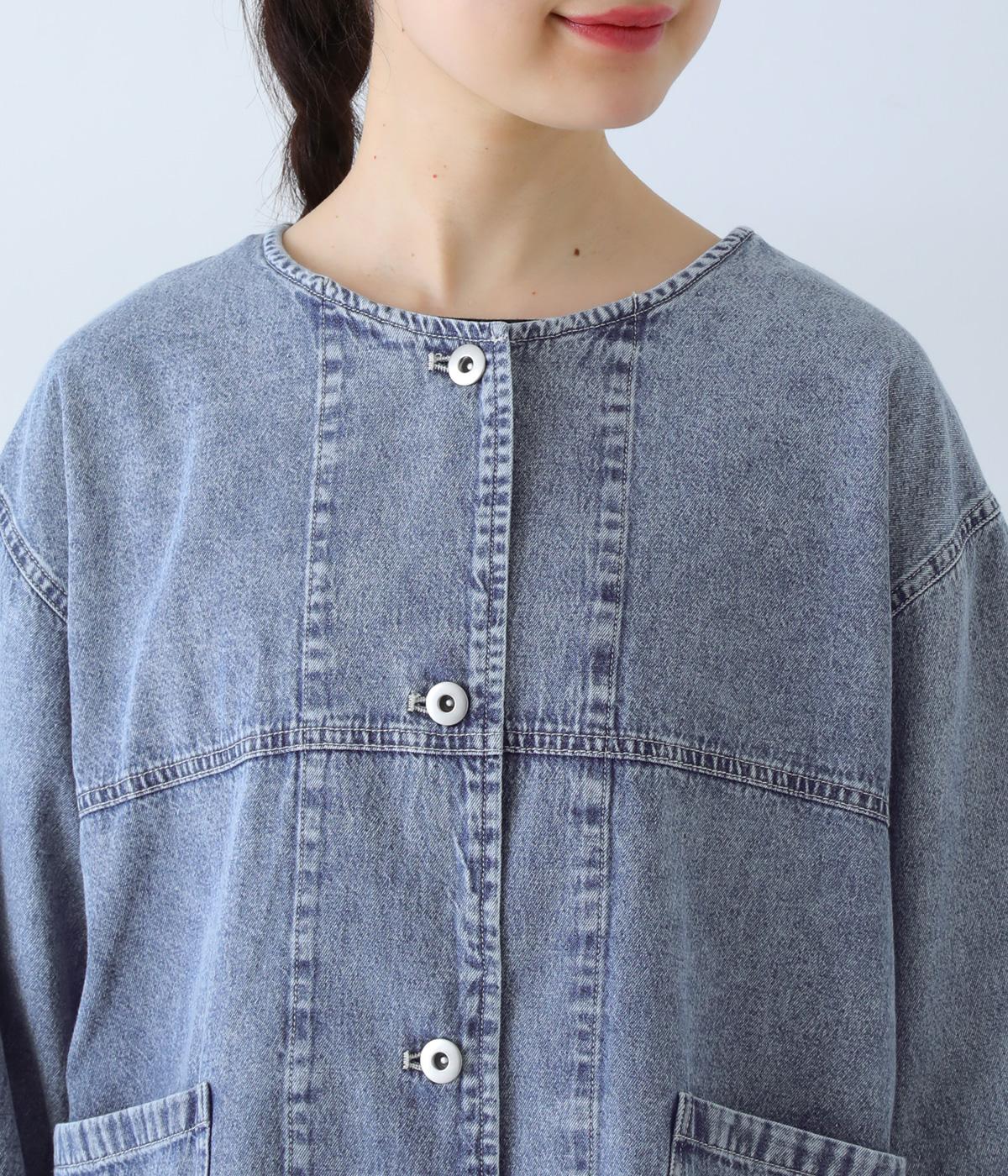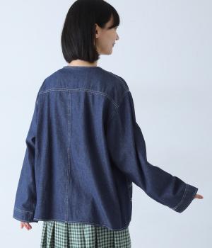 ノーカラーで首元がすっきり見えるデニムジャケット。インナーの襟をのぞかせる着こなしも楽しめます。両サイドの大きめポケットがアクセントに。腰まわりをほどよくカバーする丈感で、どんなボトムスとも合わせやすい一着です。