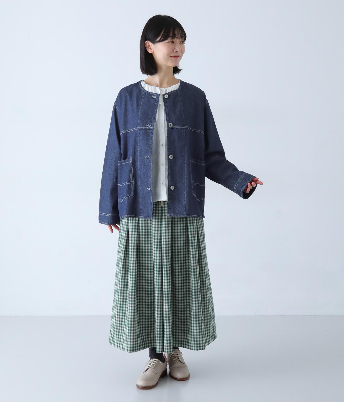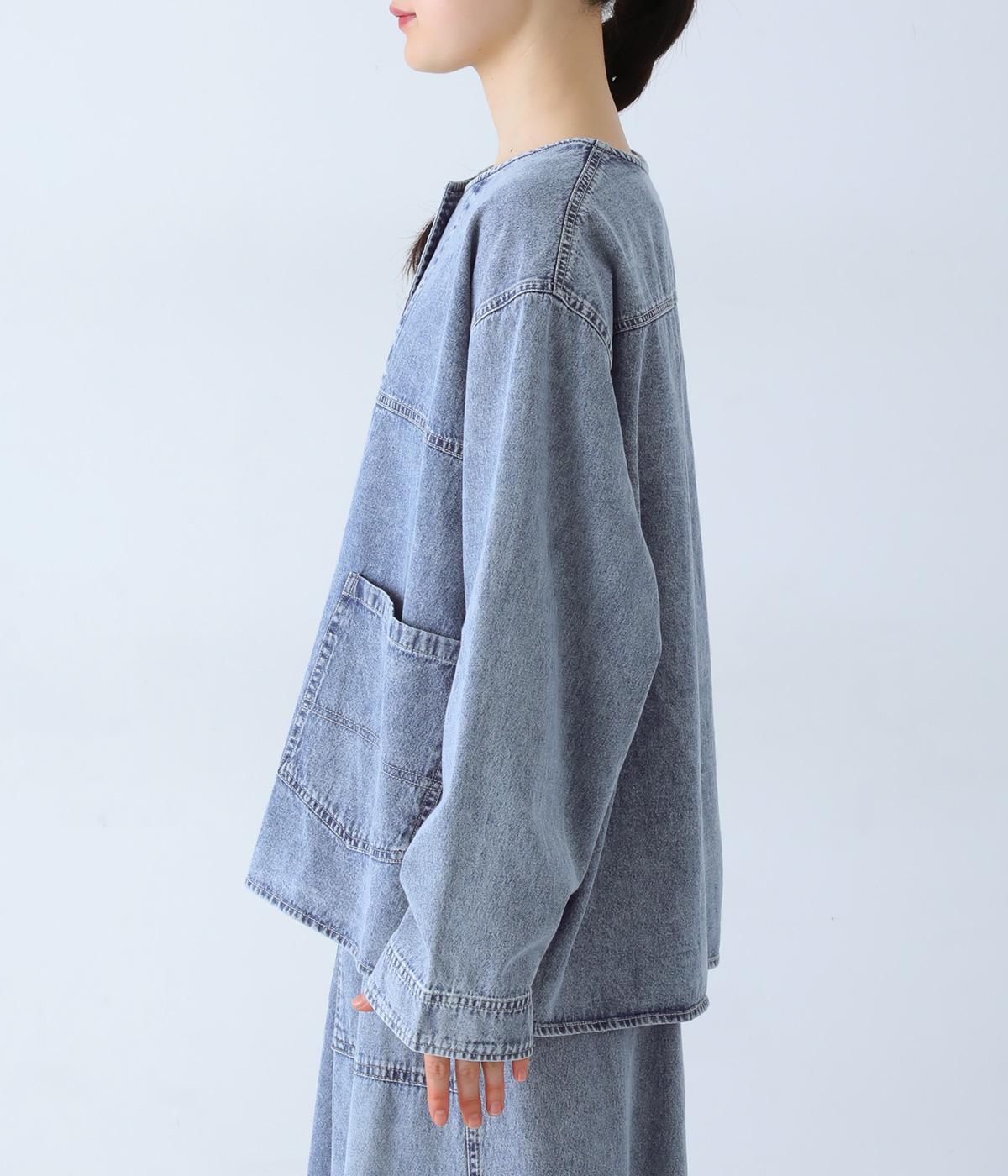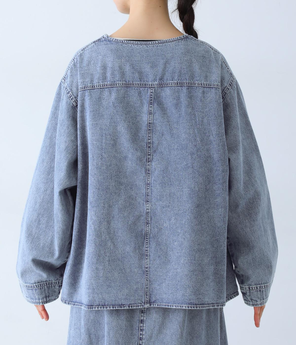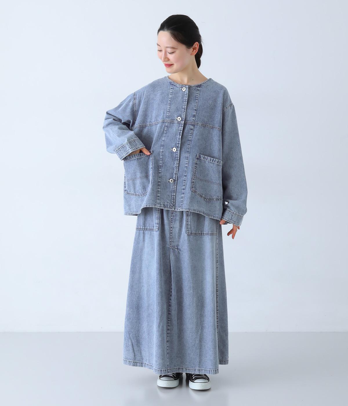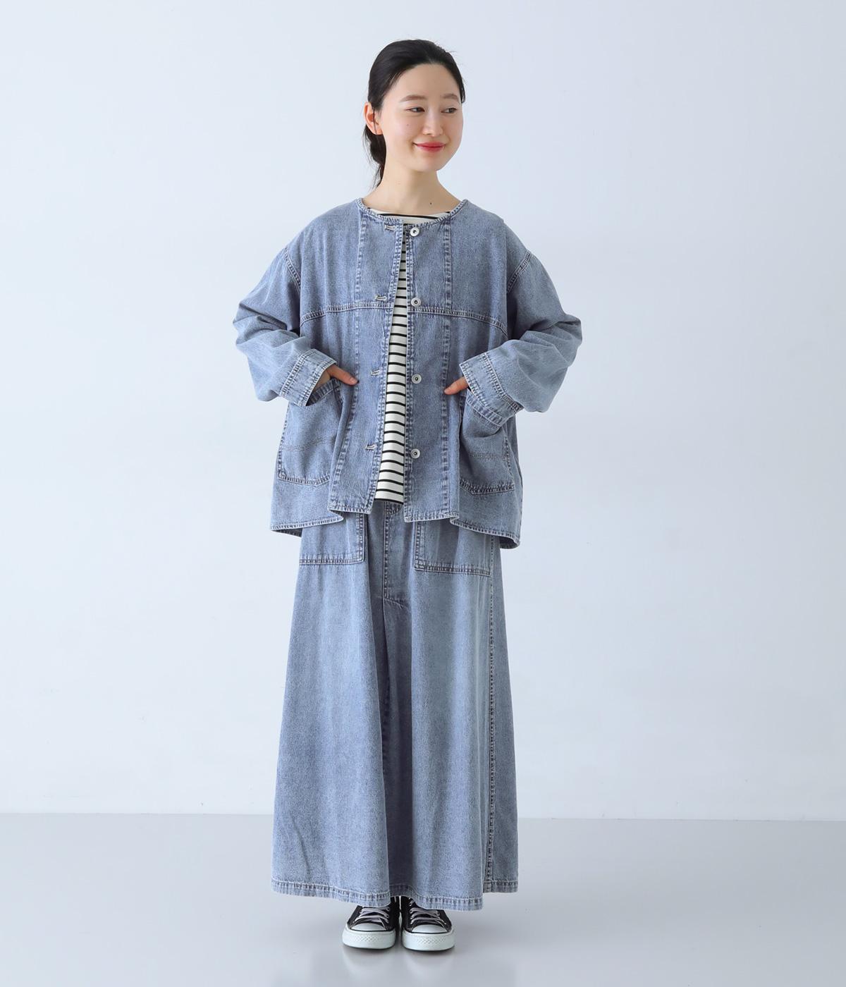 ノーカラーで首元がすっきり見えるデニムジャケット。インナーの襟をのぞかせる着こなしも楽しめます。両サイドの大きめポケットがアクセントに。腰まわりをほどよくカバーする丈感で、どんなボトムスとも合わせやすい一着です。