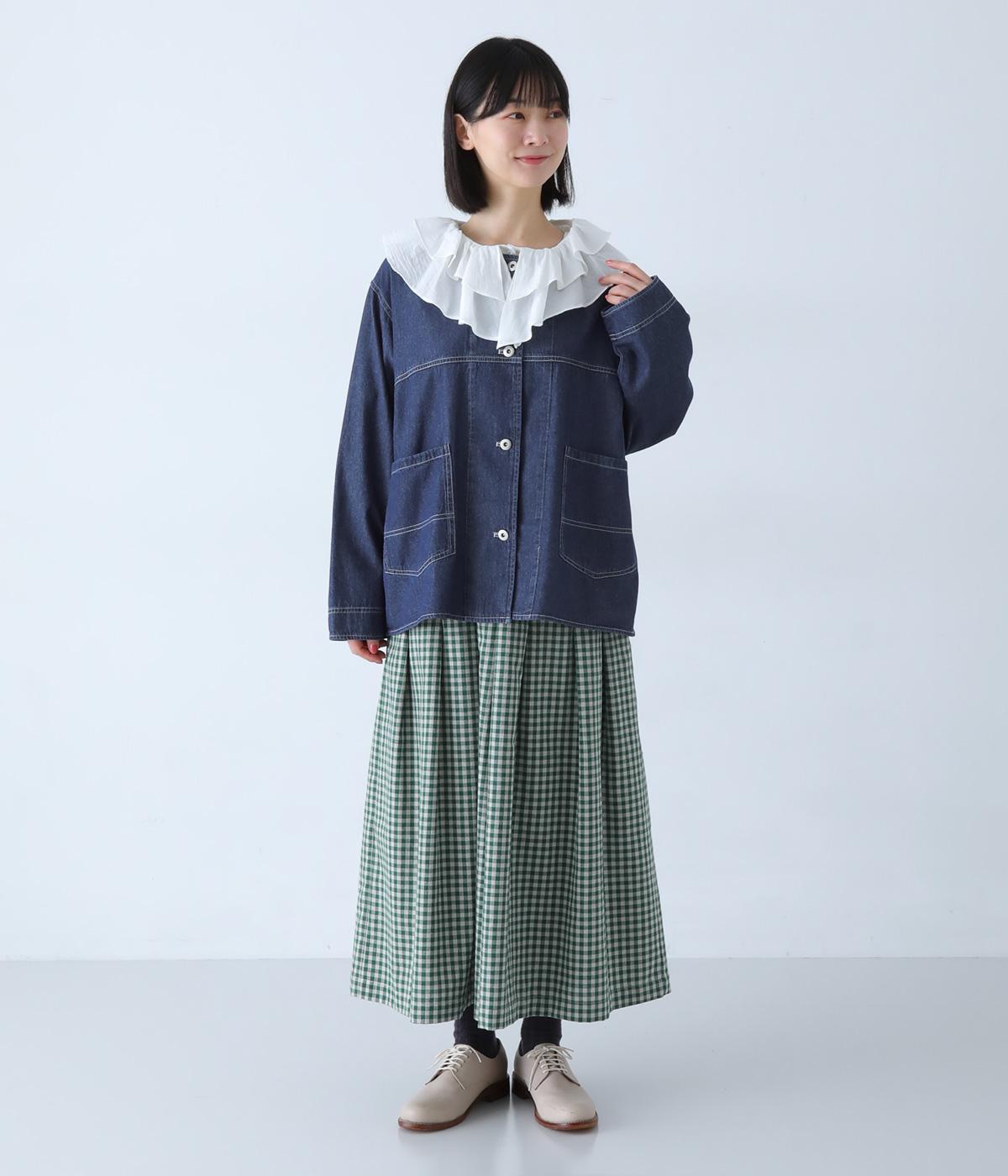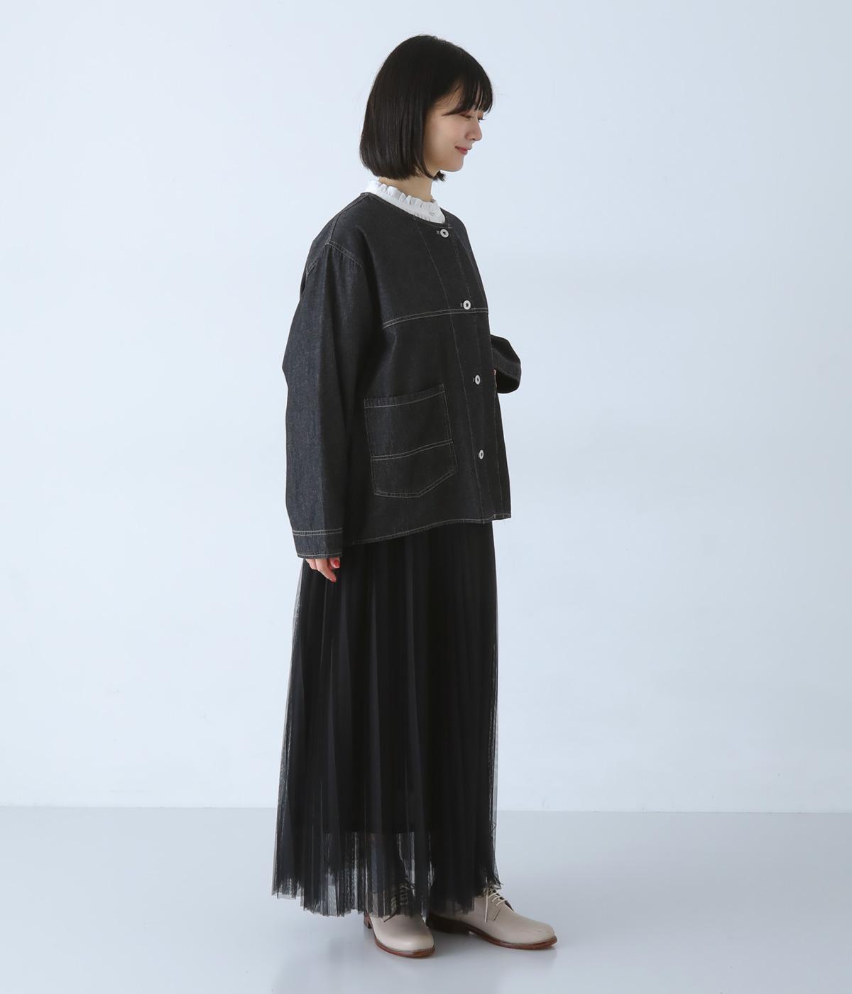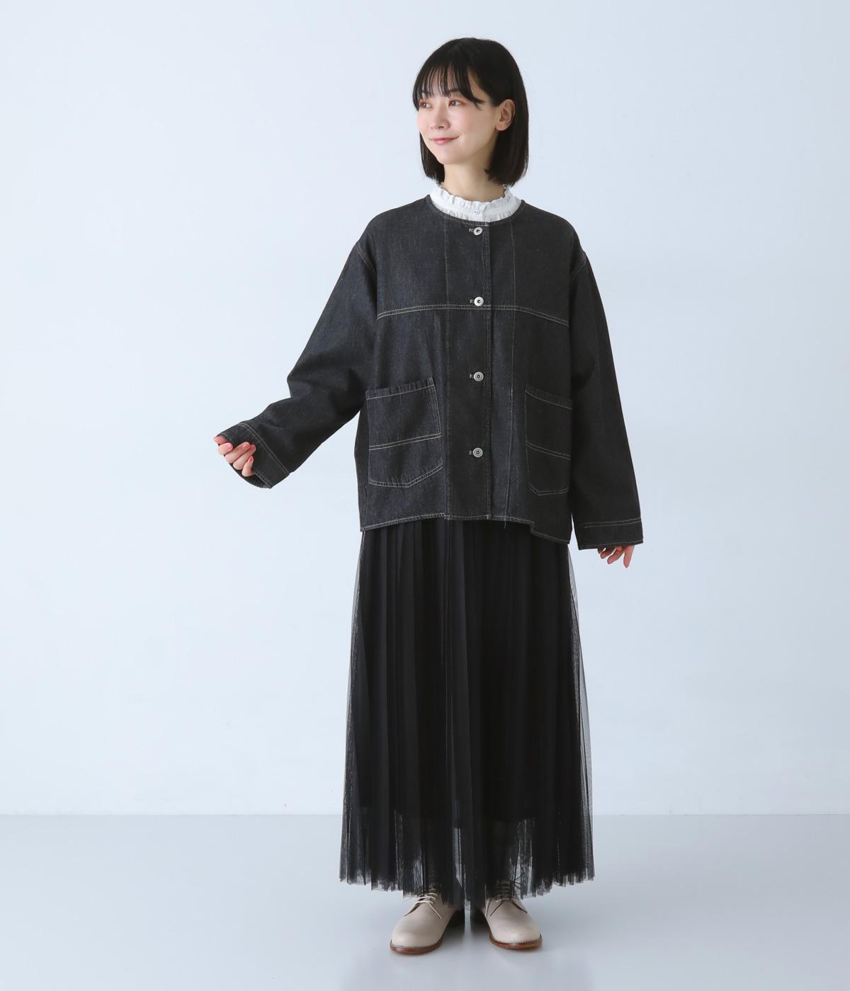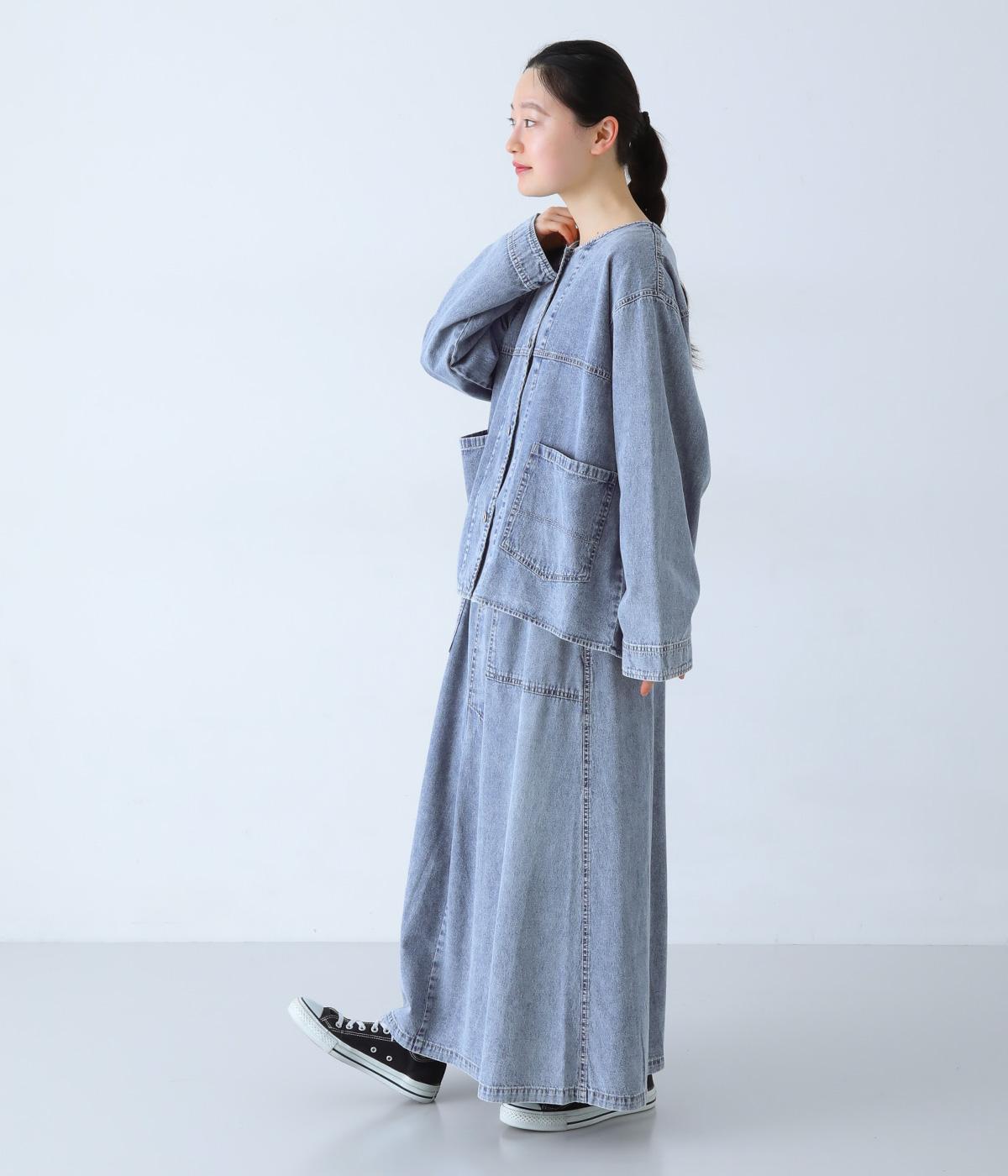 ノーカラーで首元がすっきり見えるデニムジャケット。インナーの襟をのぞかせる着こなしも楽しめます。両サイドの大きめポケットがアクセントに。腰まわりをほどよくカバーする丈感で、どんなボトムスとも合わせやすい一着です。