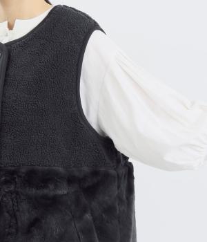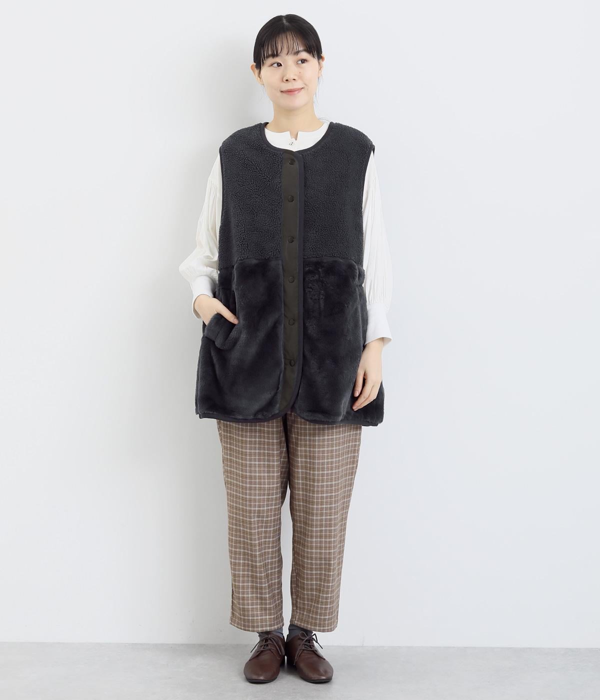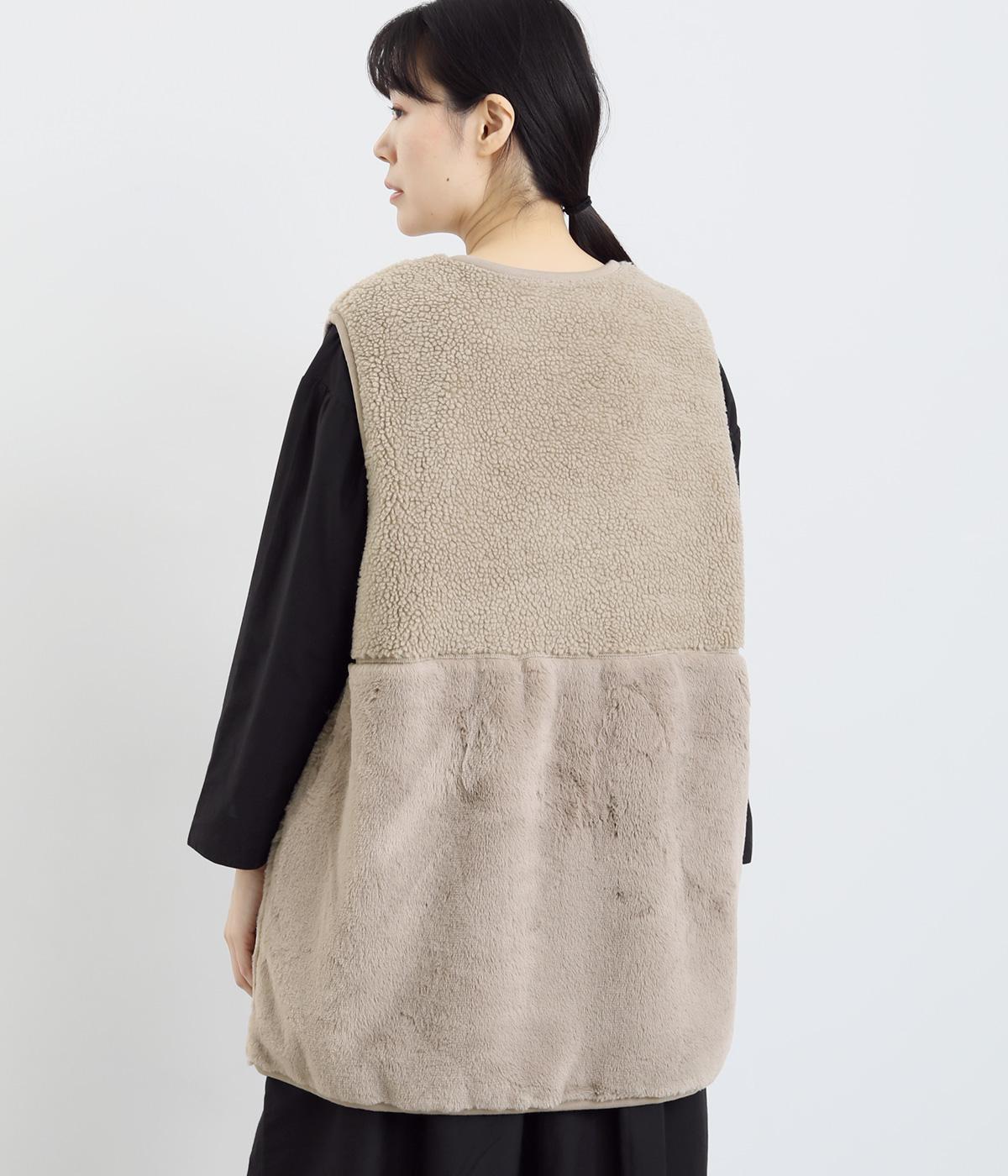軽くてやさしい肌触り。ボアとファーのふんわり感たっぷりのチャーミングなベストです。保温性にも優れ、安心感のある素材です。しっかりと施されたポリエステル素材の裏地は、重ね着してもごわつかず快適です。