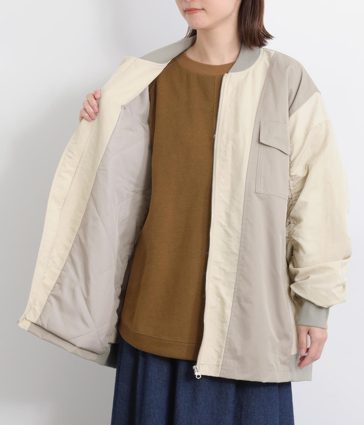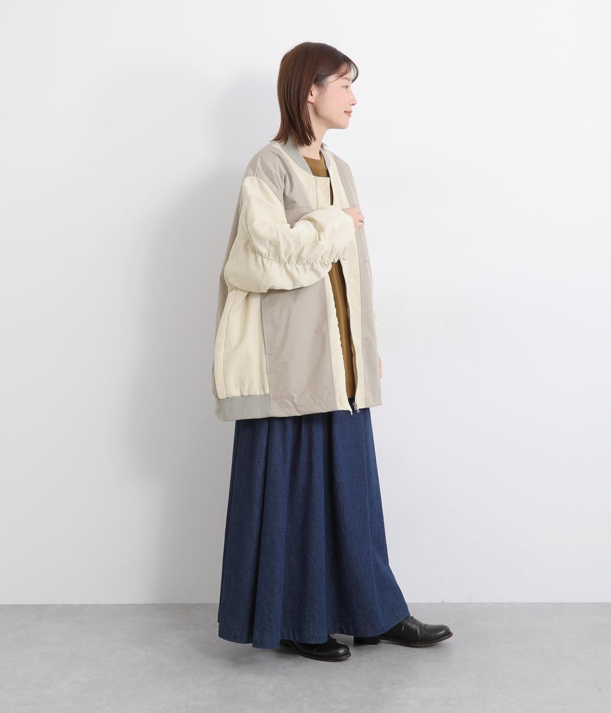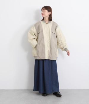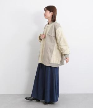 ハリのあるツイル素材と、なめらかな光沢をもつナイロンを組み合わせています。袖口や首元のリブは防寒性とデザイン性を高めるワンポイントに。裏地には中綿を入れ、あたたかさと軽さを両立。