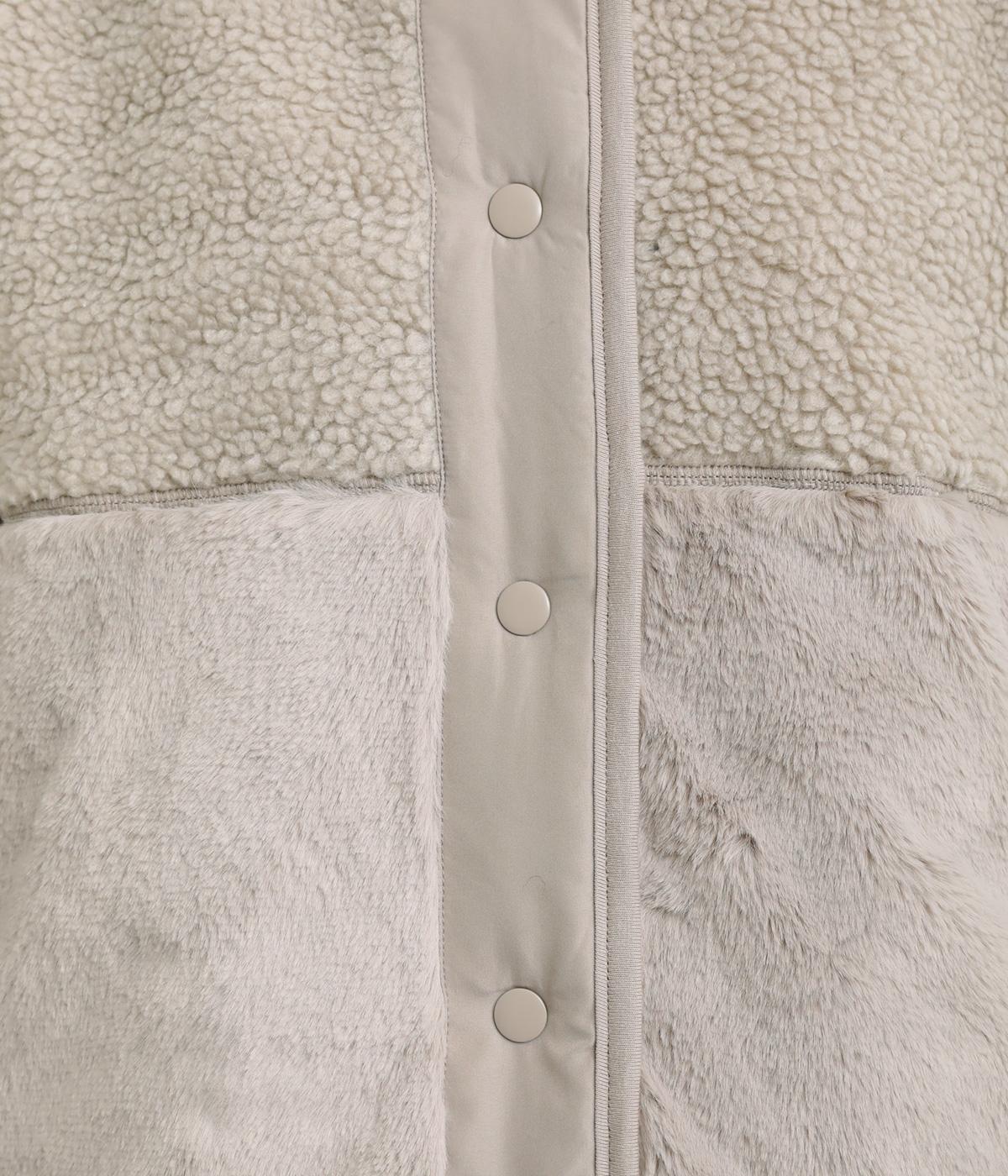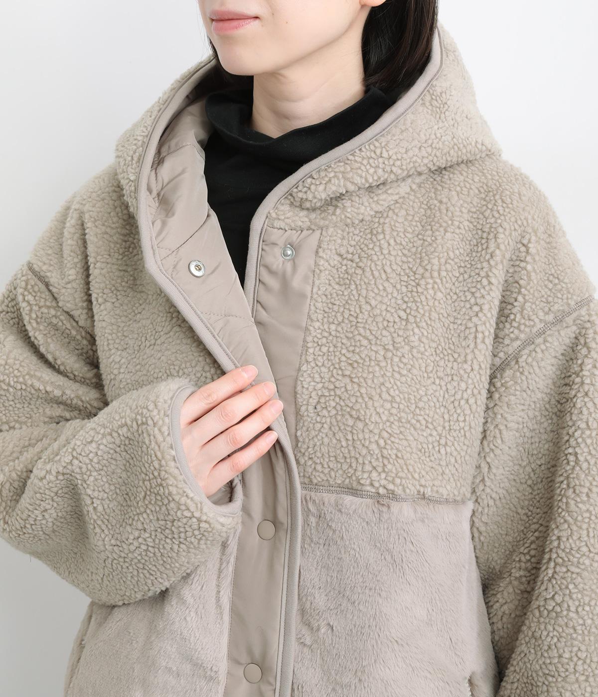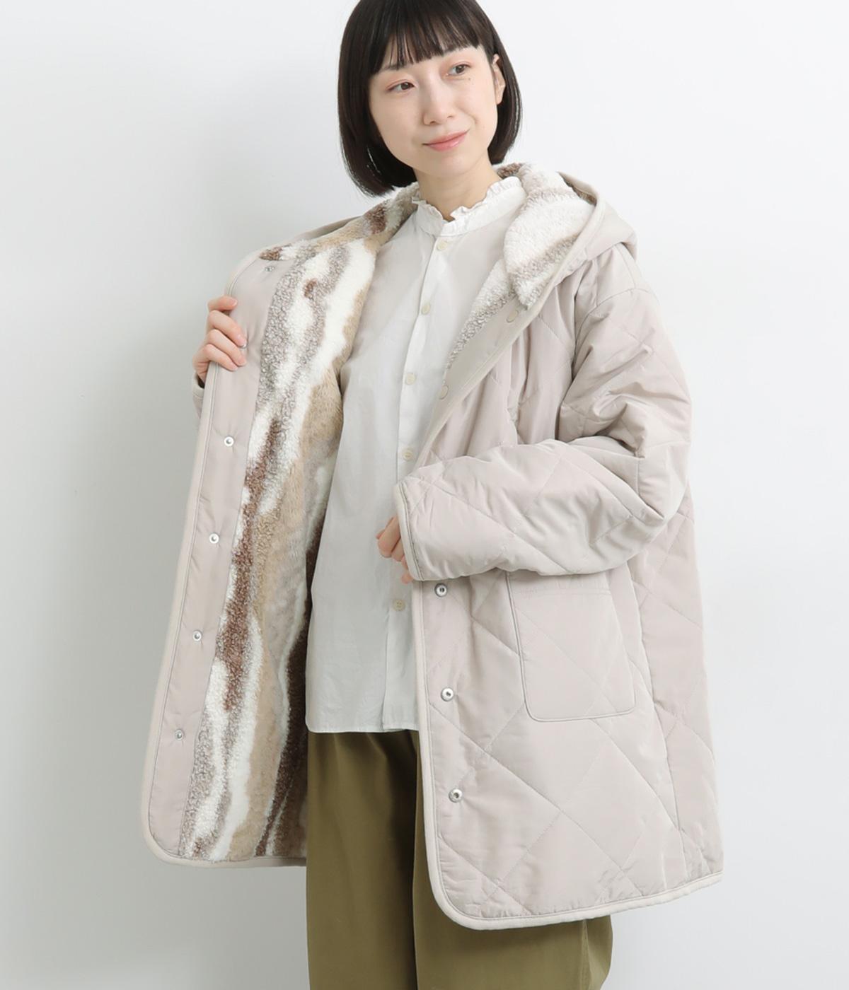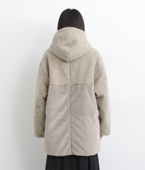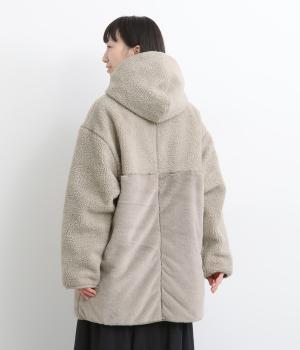もこもことやわらかなボアと、なめらかで上品なファーを組み合わせた表面は、触れた瞬間にぬくもりを感じる仕上がりです。裏はキルトステッチが映えるマットなタフタ面で、すっきりと洗練された印象に。