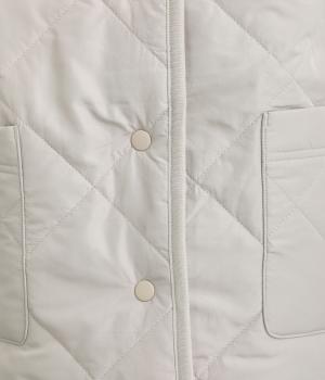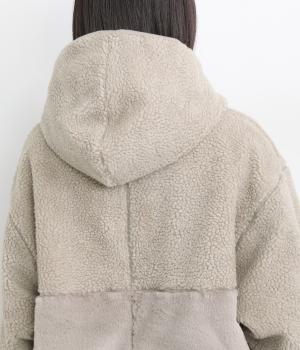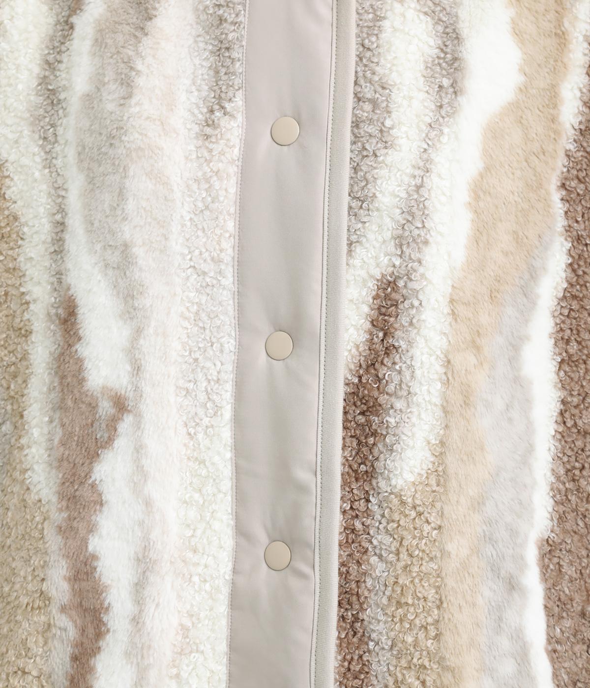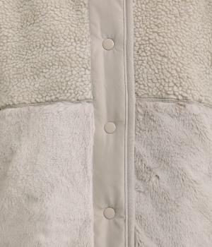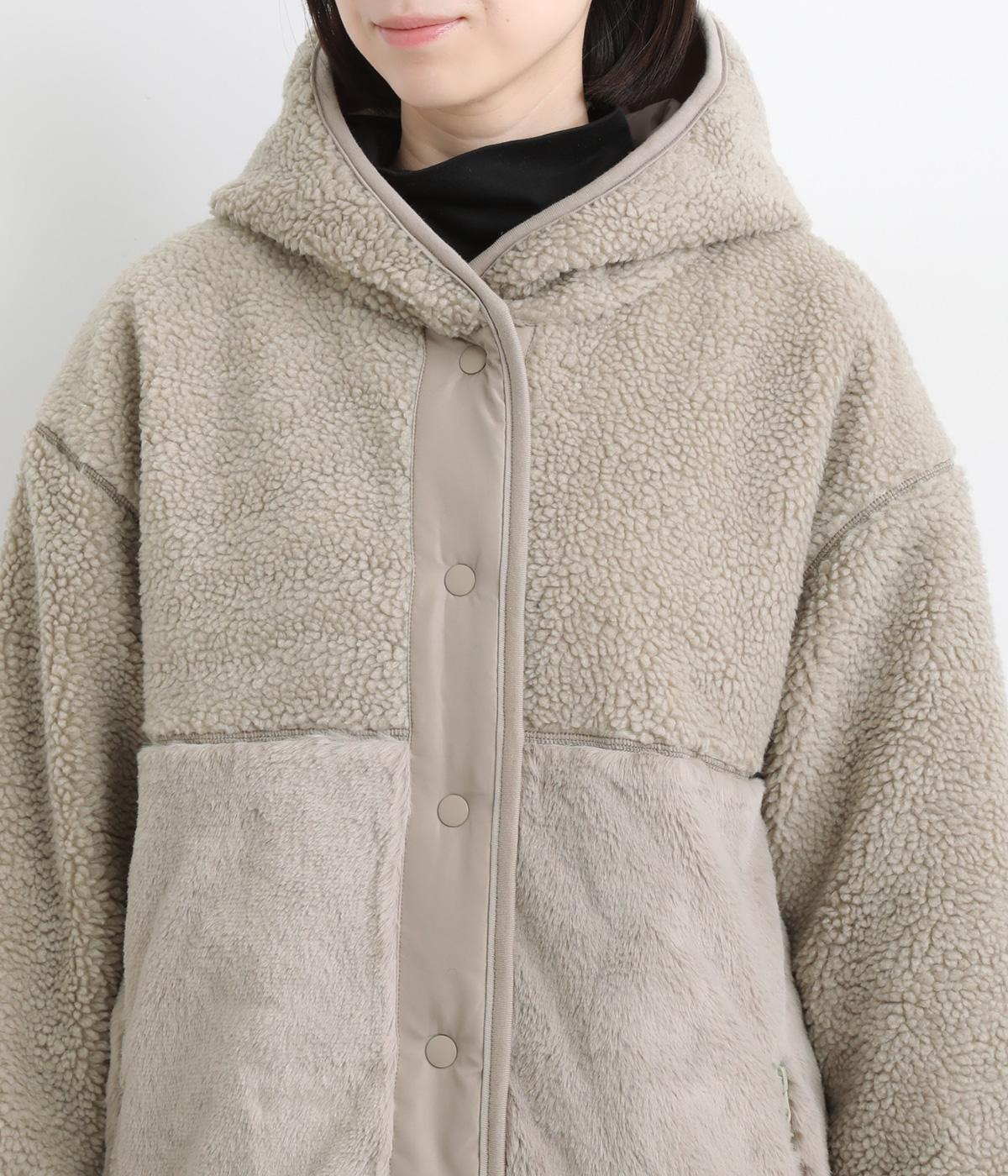 もこもことやわらかなボアと、なめらかで上品なファーを組み合わせた表面は、触れた瞬間にぬくもりを感じる仕上がりです。裏はキルトステッチが映えるマットなタフタ面で、すっきりと洗練された印象に。