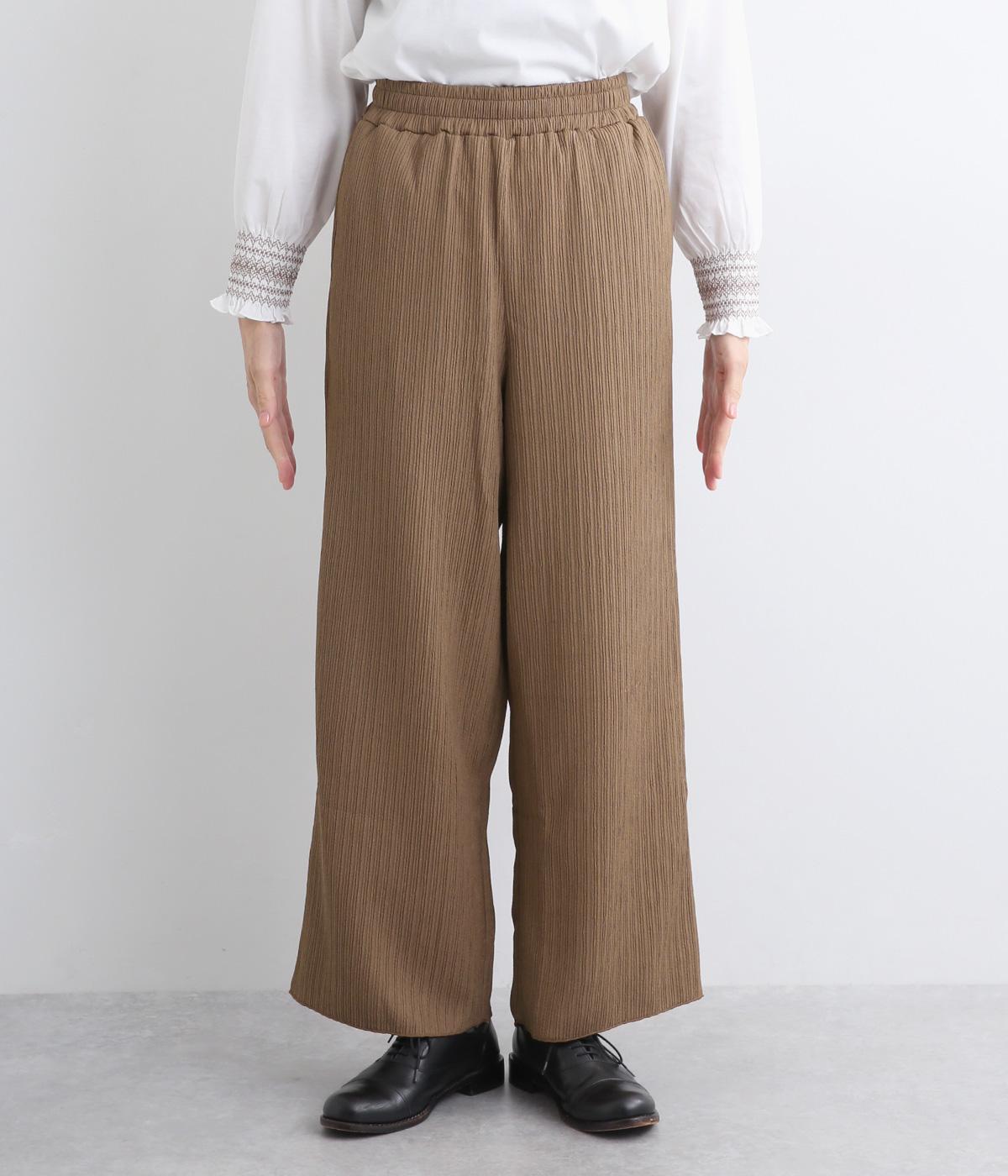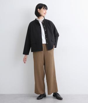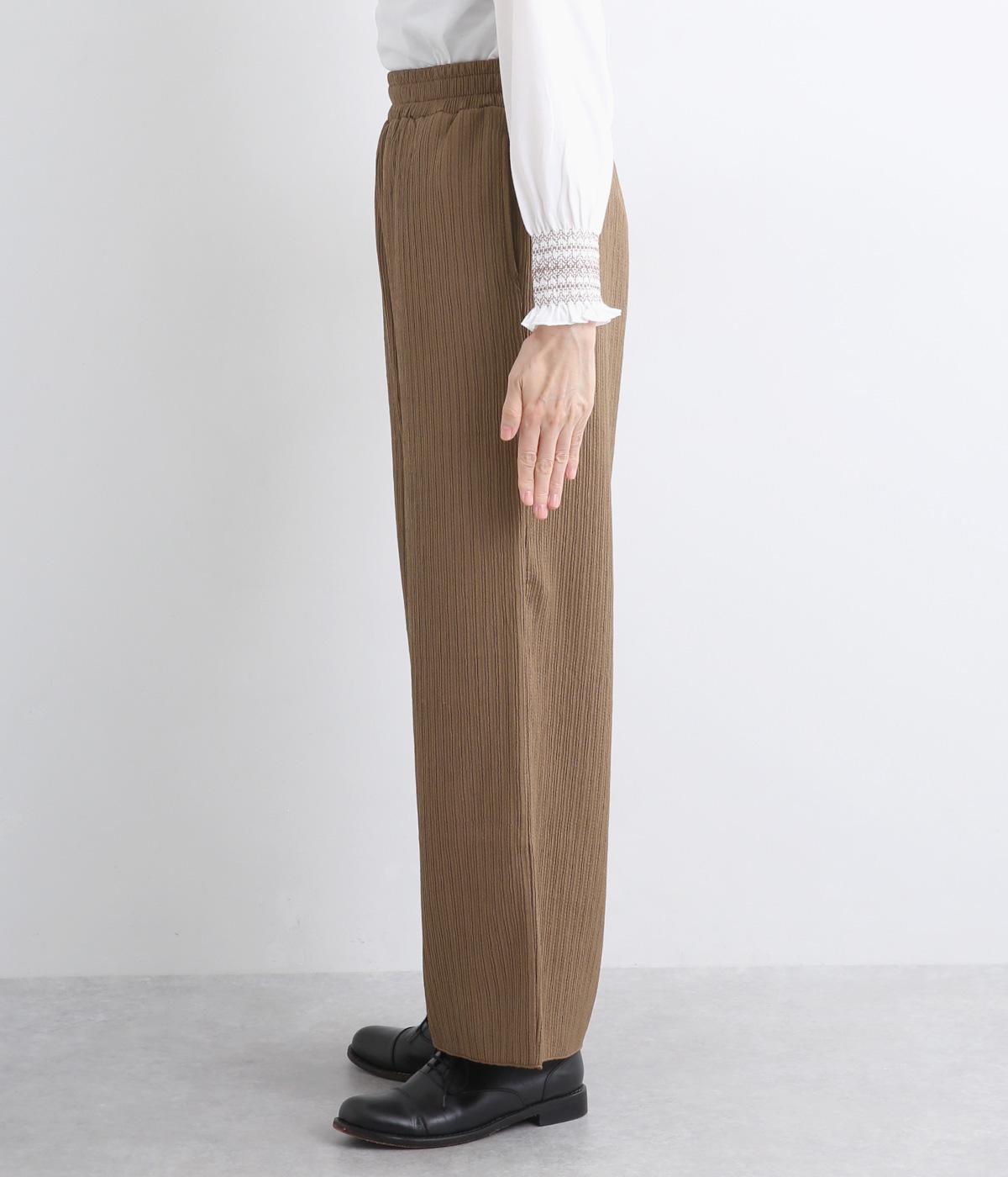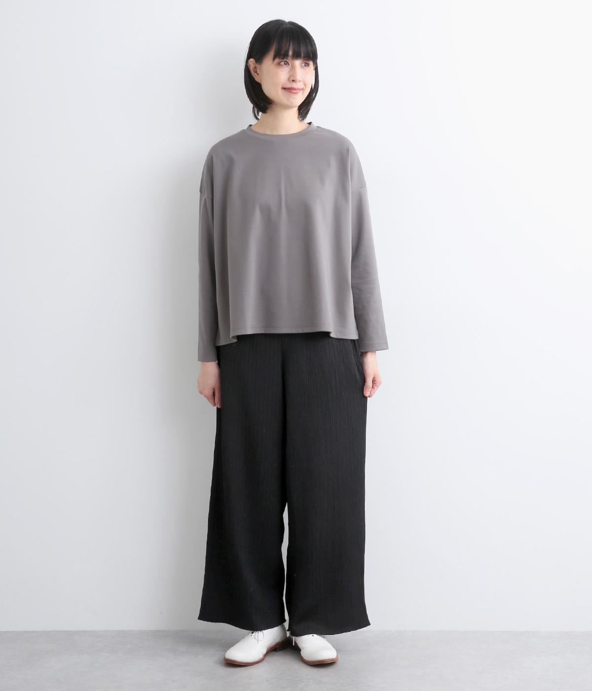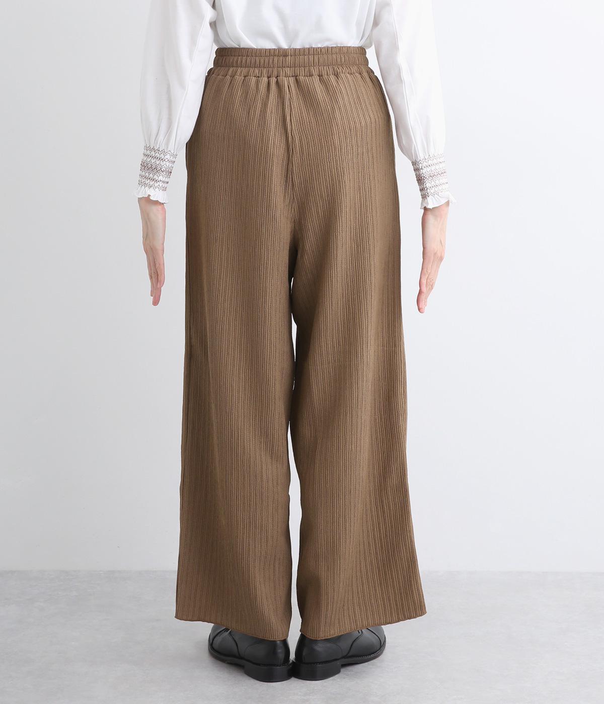 裾のメロー始末でさりげないアクセントを添えた、ワイドシルエットのイージーパンツです。広幅のウエストゴムでカジュアルになりすぎず、リラックスしたはき心地に仕立てました。内側に通した紐で微調節も可能です。