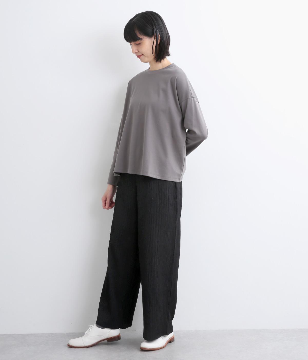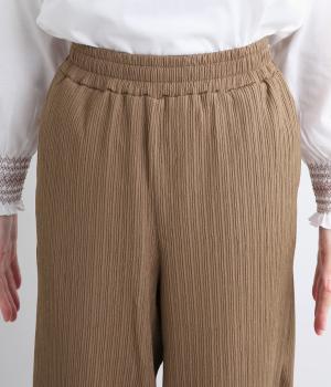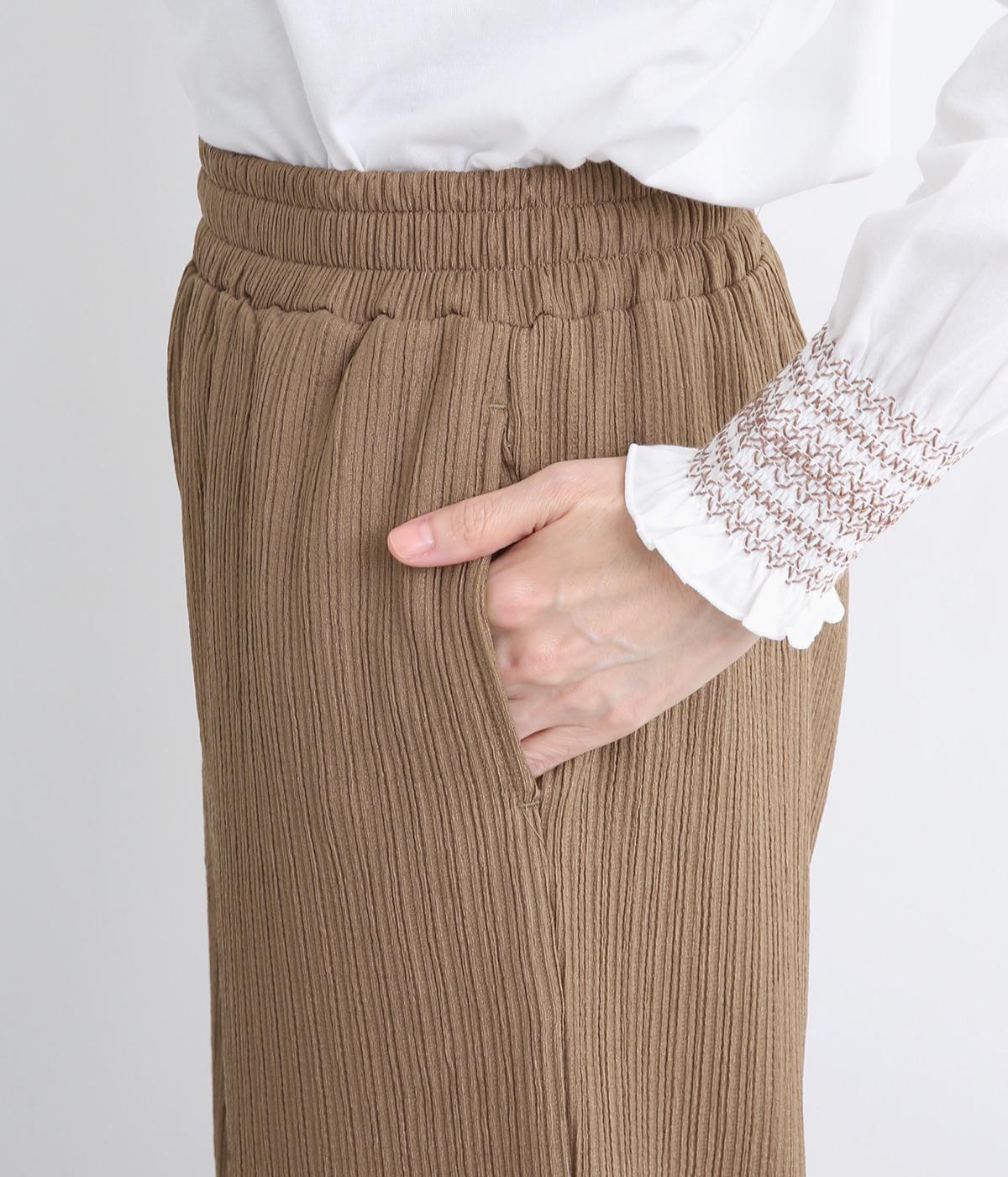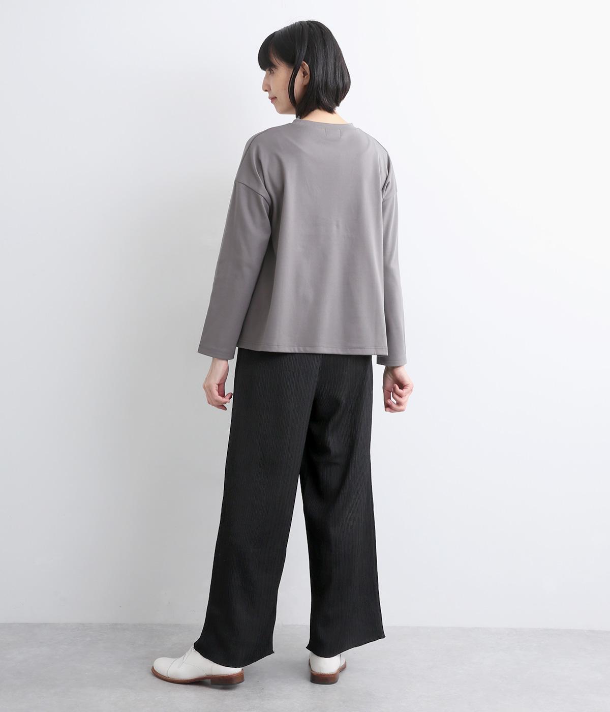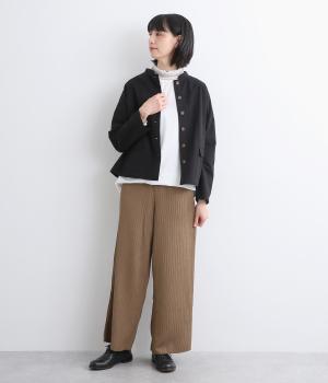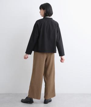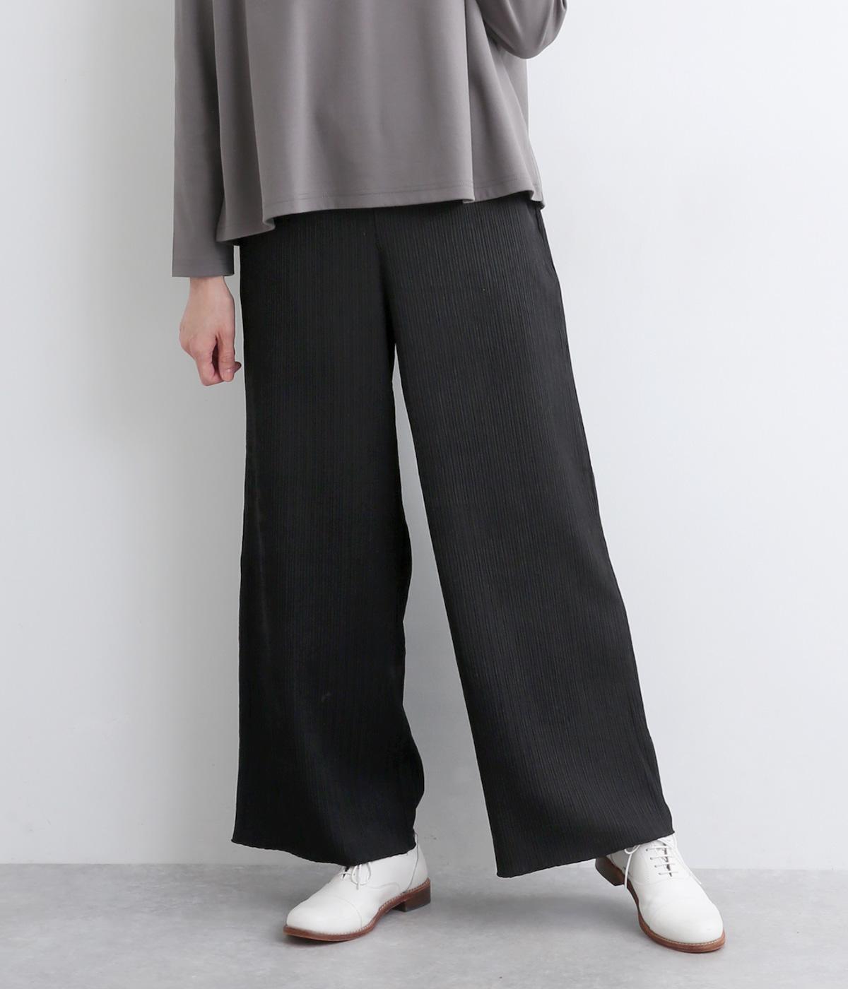 裾のメロー始末でさりげないアクセントを添えた、ワイドシルエットのイージーパンツです。広幅のウエストゴムでカジュアルになりすぎず、リラックスしたはき心地に仕立てました。内側に通した紐で微調節も可能です。