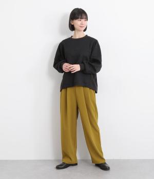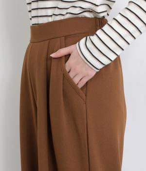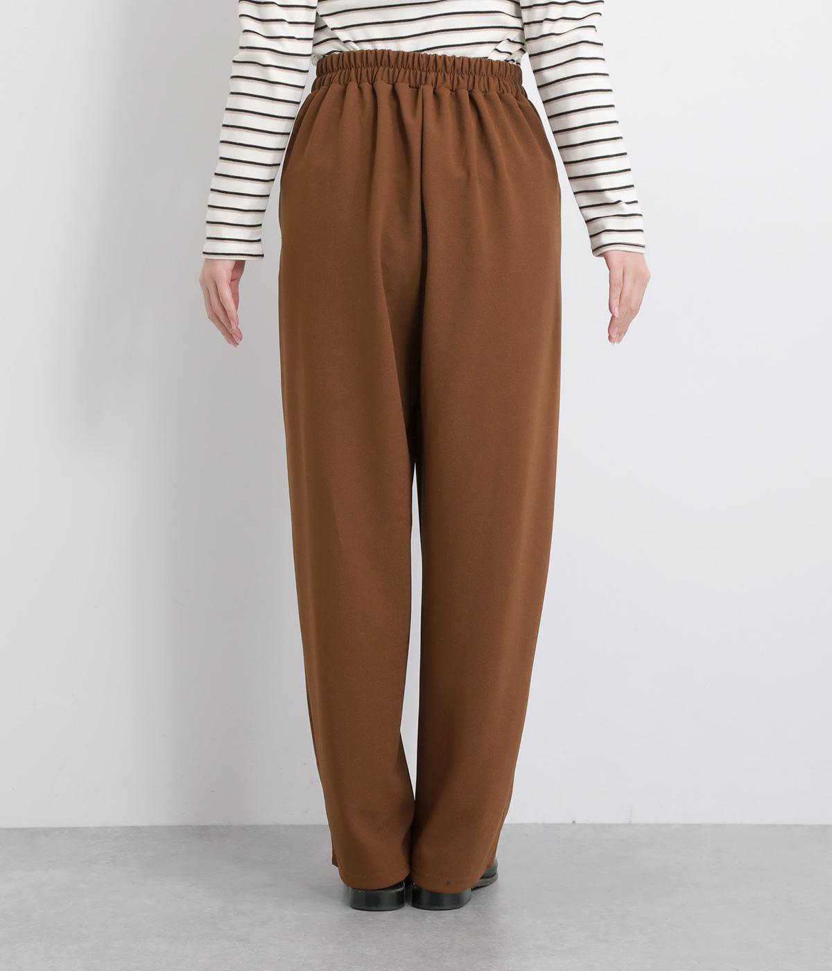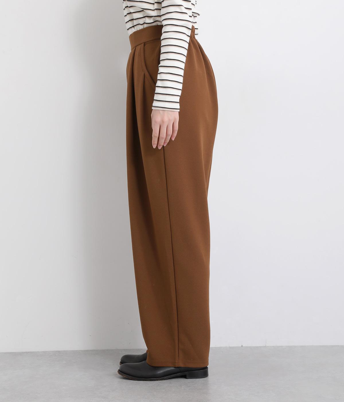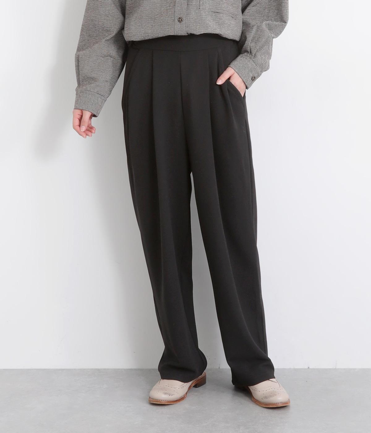 腰まわりにタックをほどこして、立体的な丸みを描くコクーンシルエットに仕上げたパンツです。ヒップや太ももまわりをカバーしつつ、裾にかけて細くなるラインで自然なメリハリを演出。ウエストは楽なゴム仕様ですが前はフラットに見えるため、トップスインも◎。