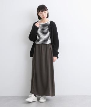 縦の切り替えと、タイトめなナローシルエットがすっきりと見せてくれるスカートです。後ろ裾のスリットがさりげなく抜け感を演出。ウエストは着脱が楽なオールゴム仕様で、内側に通した紐で調節もできます。
