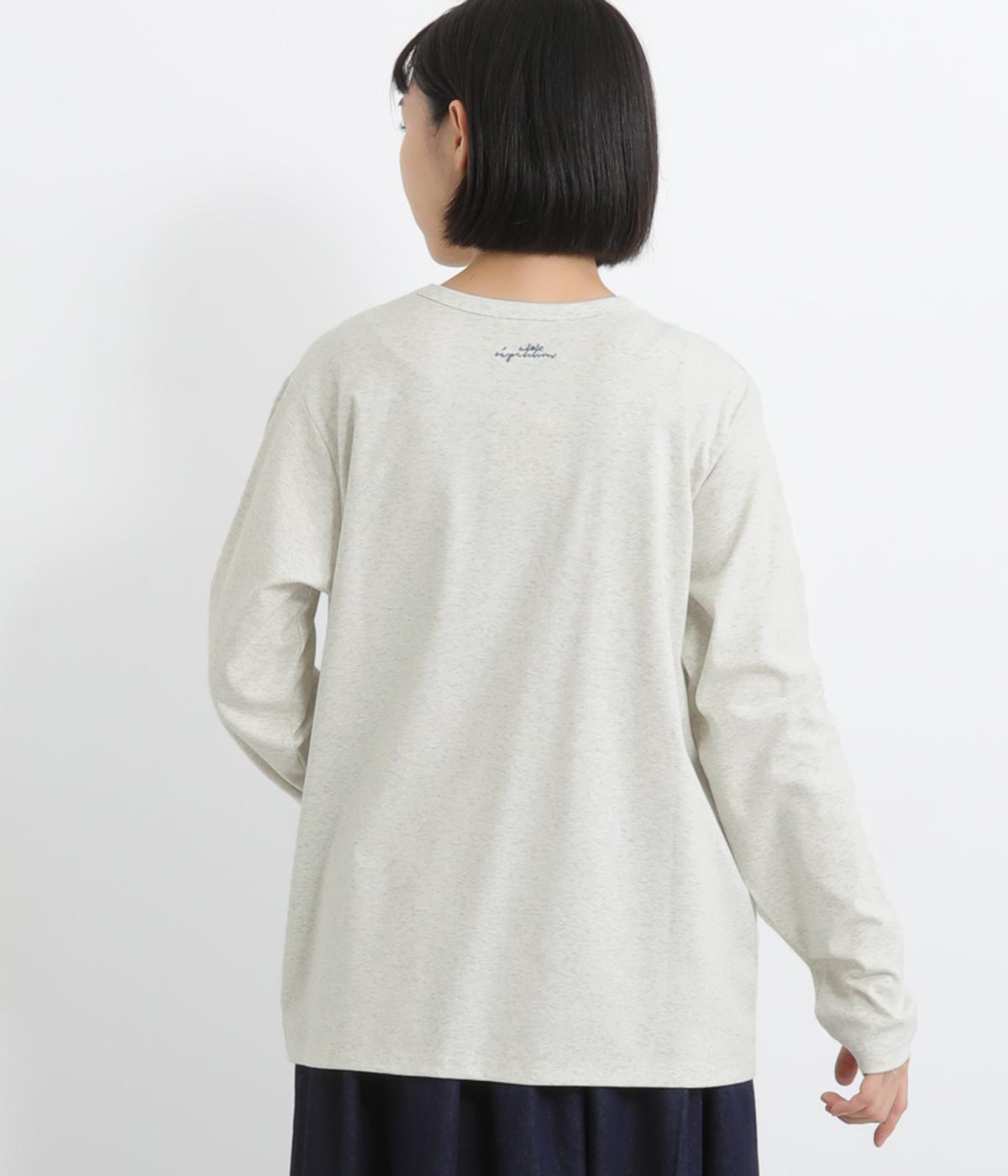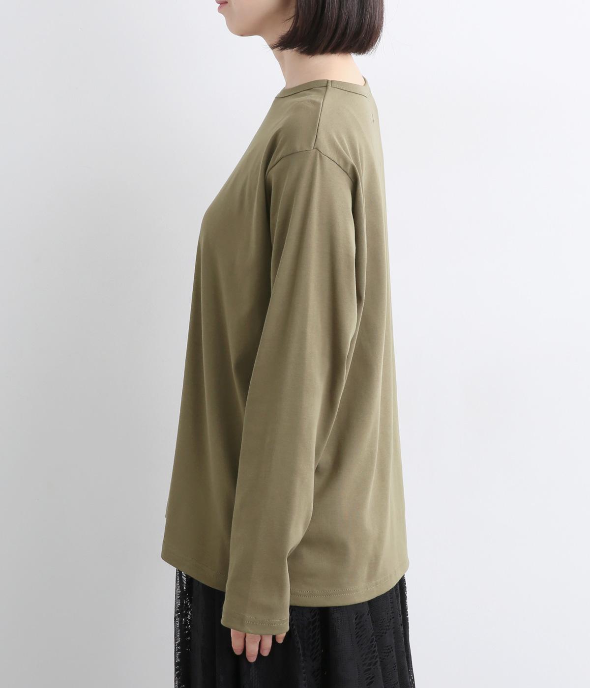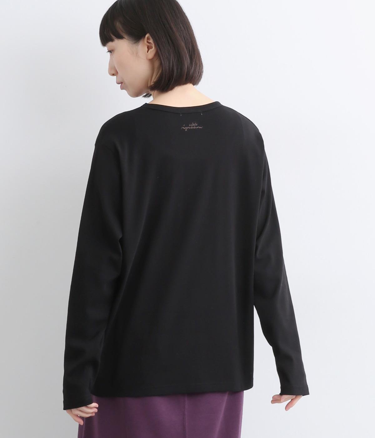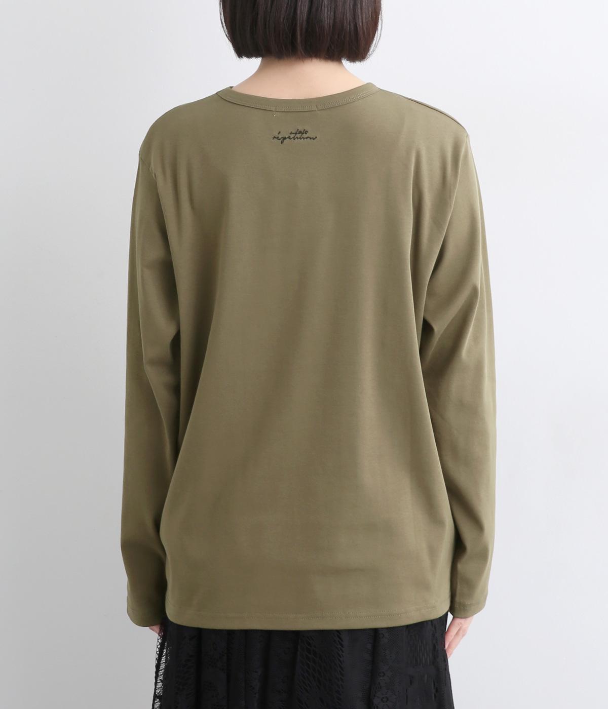 バックネックにあしらった配色のロゴ刺しゅうが、シンプルな中にさりげなくアクセントを加えるロングTシャツです。大きすぎないサイズは一枚着としても、ニットやワンピースのインナーとしても活躍します。