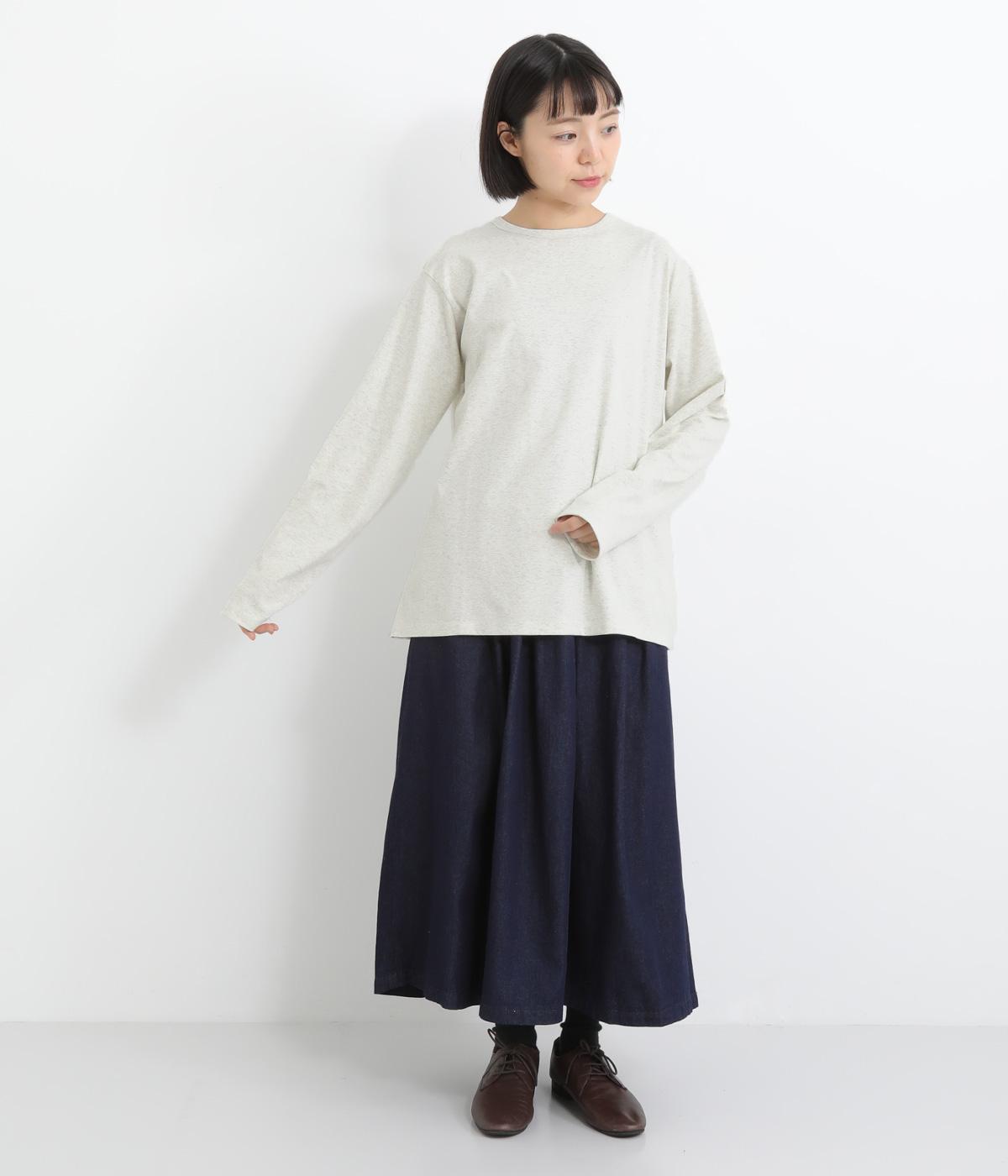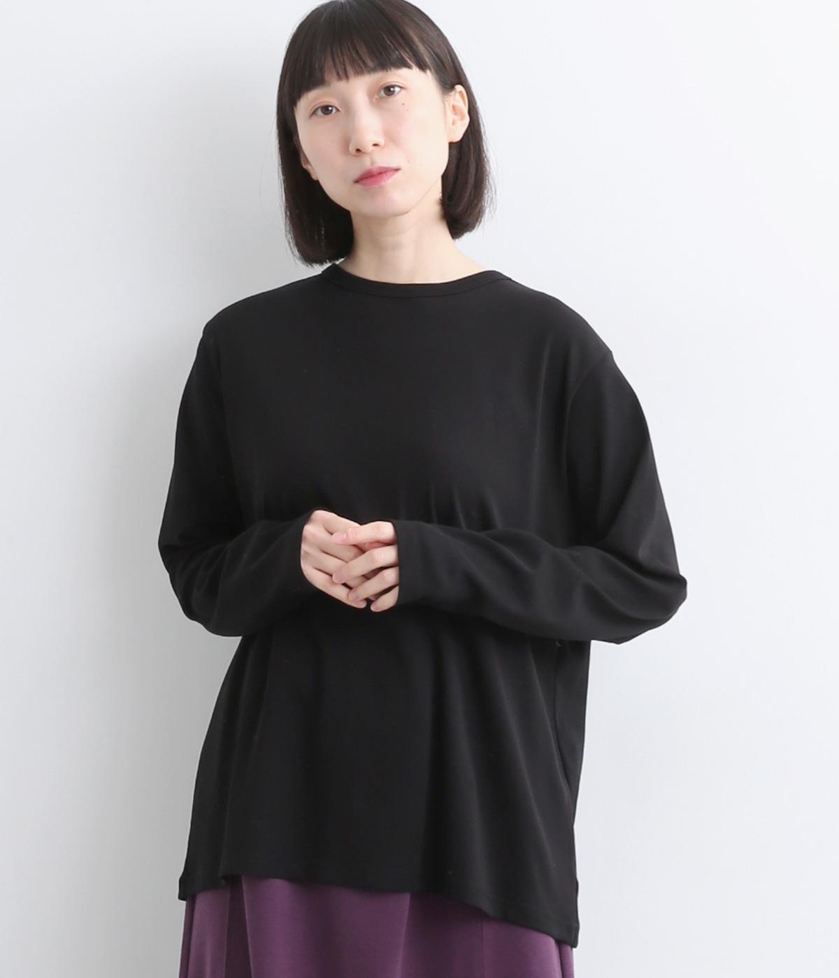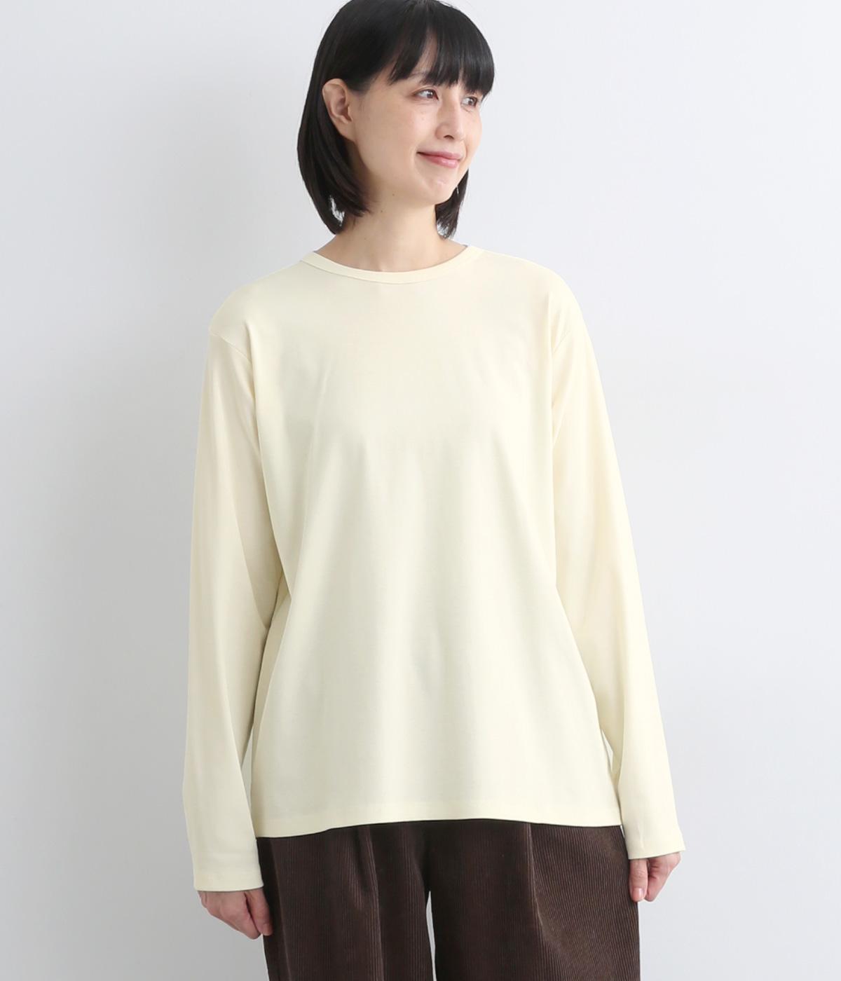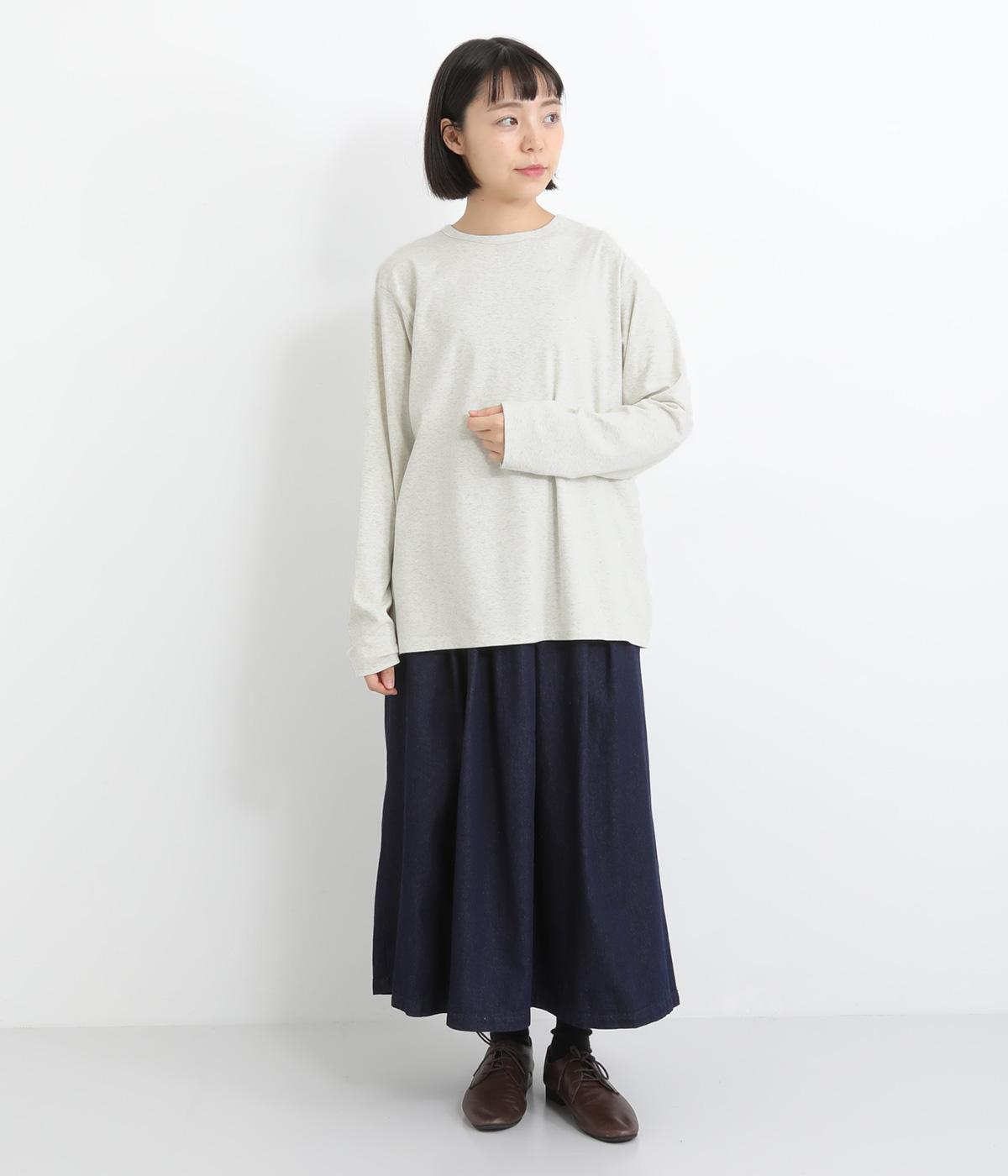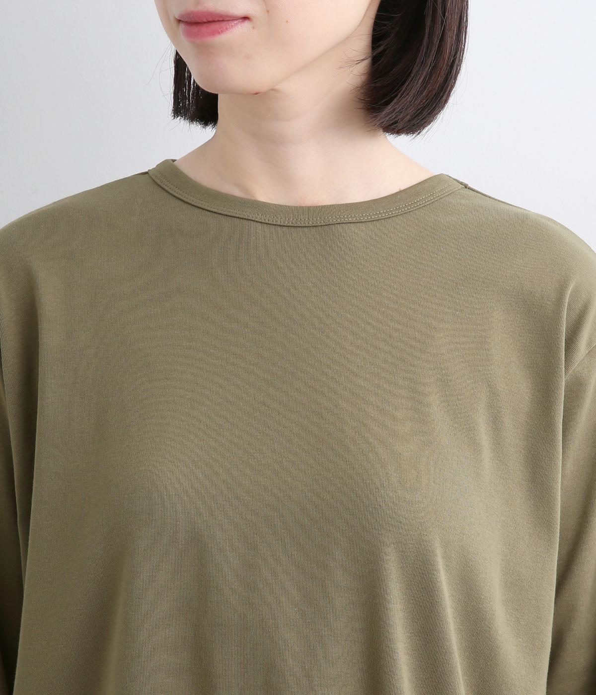 バックネックにあしらった配色のロゴ刺しゅうが、シンプルな中にさりげなくアクセントを加えるロングTシャツです。大きすぎないサイズは一枚着としても、ニットやワンピースのインナーとしても活躍します。