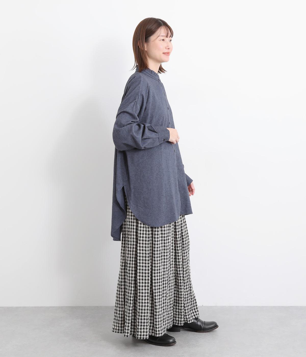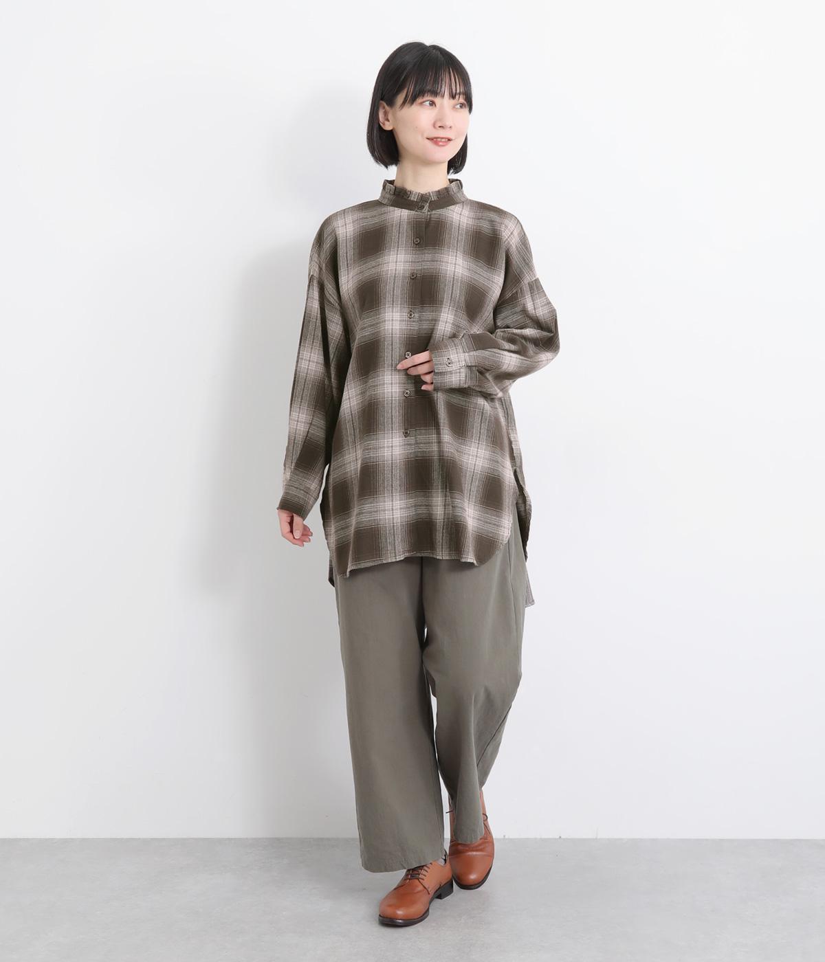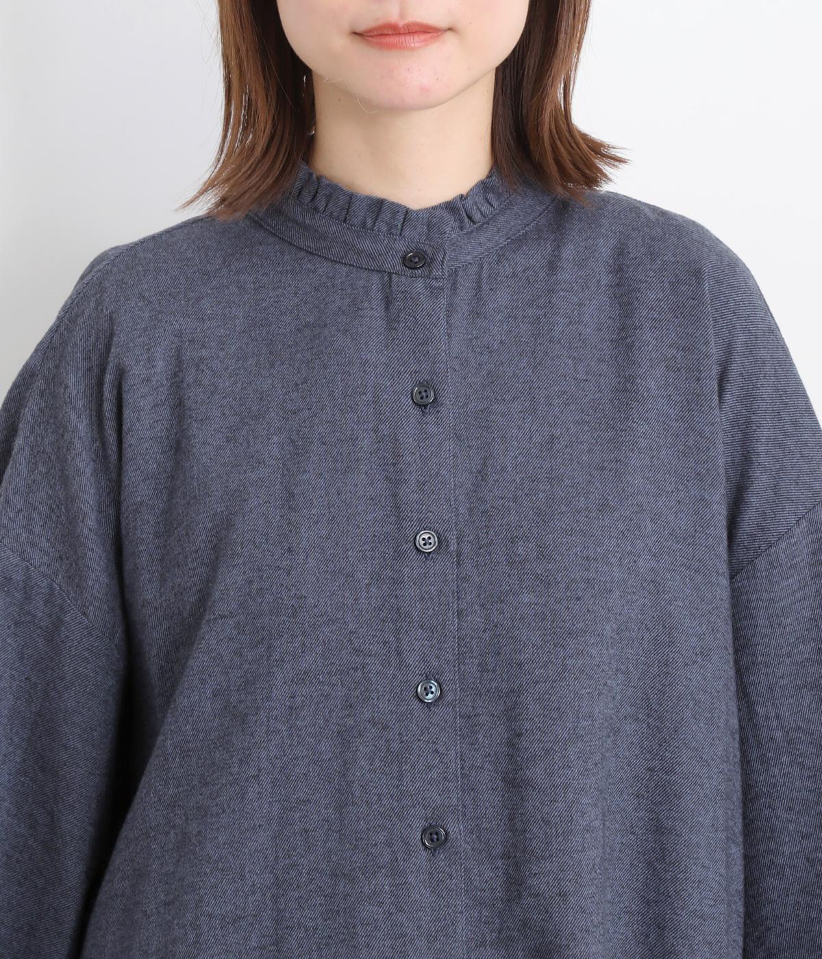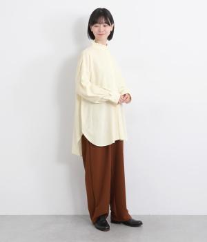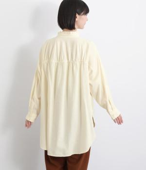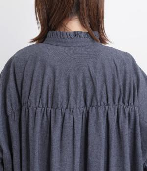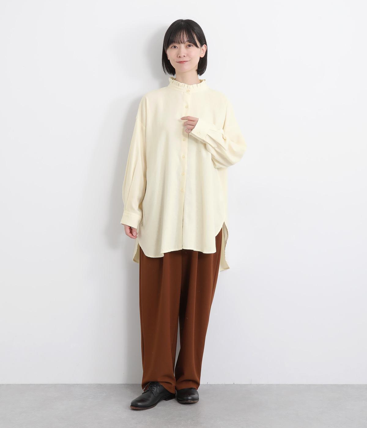 甘さを控えた襟元のフリルが、顔まわりにやわらかなニュアンスを加えるブラウスです。バックスタイルのギャザーはふんわりとした立体感を生み出し、後ろ姿にまで気を抜かない印象に仕上げています。