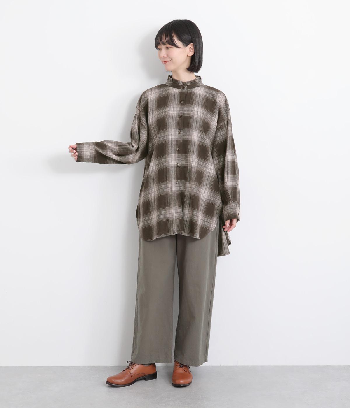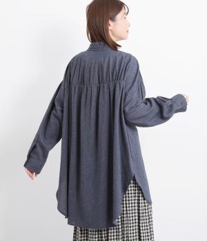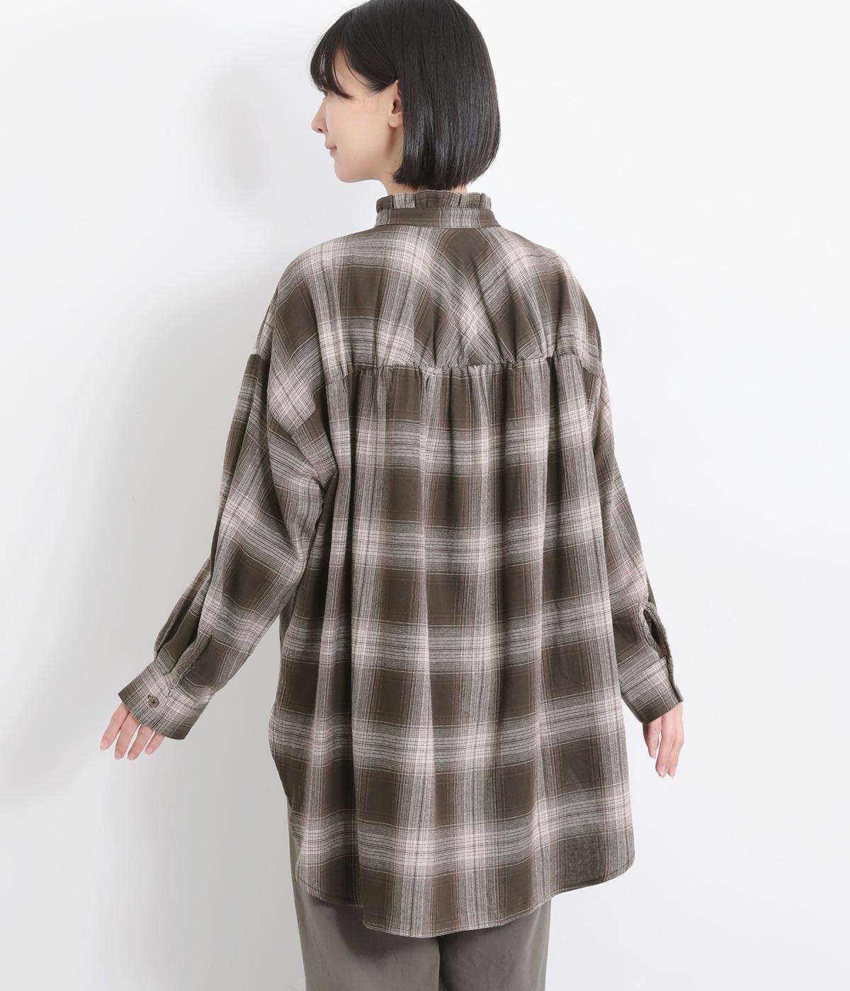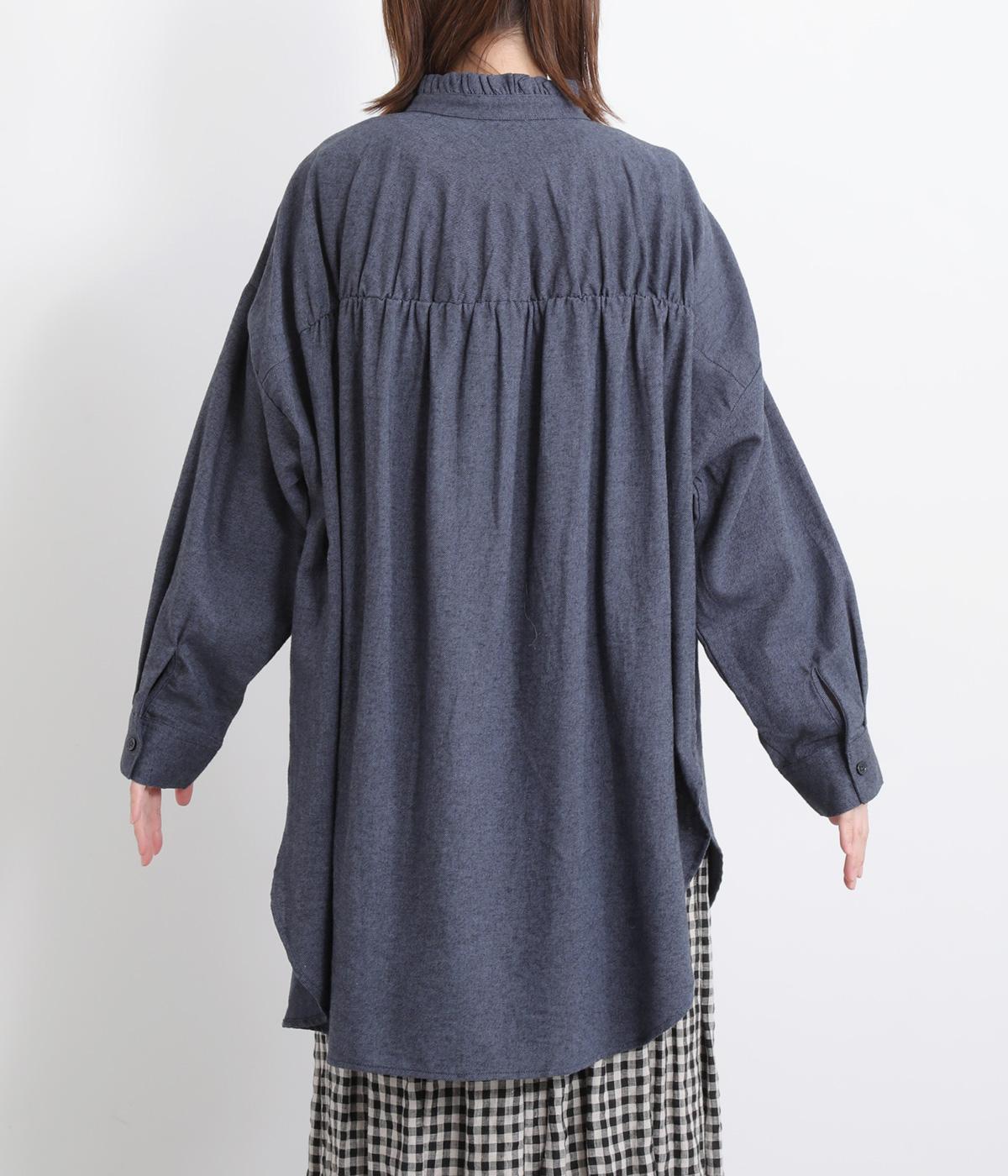甘さを控えた襟元のフリルが、顔まわりにやわらかなニュアンスを加えるブラウスです。バックスタイルのギャザーはふんわりとした立体感を生み出し、後ろ姿にまで気を抜かない印象に仕上げています。