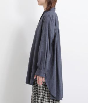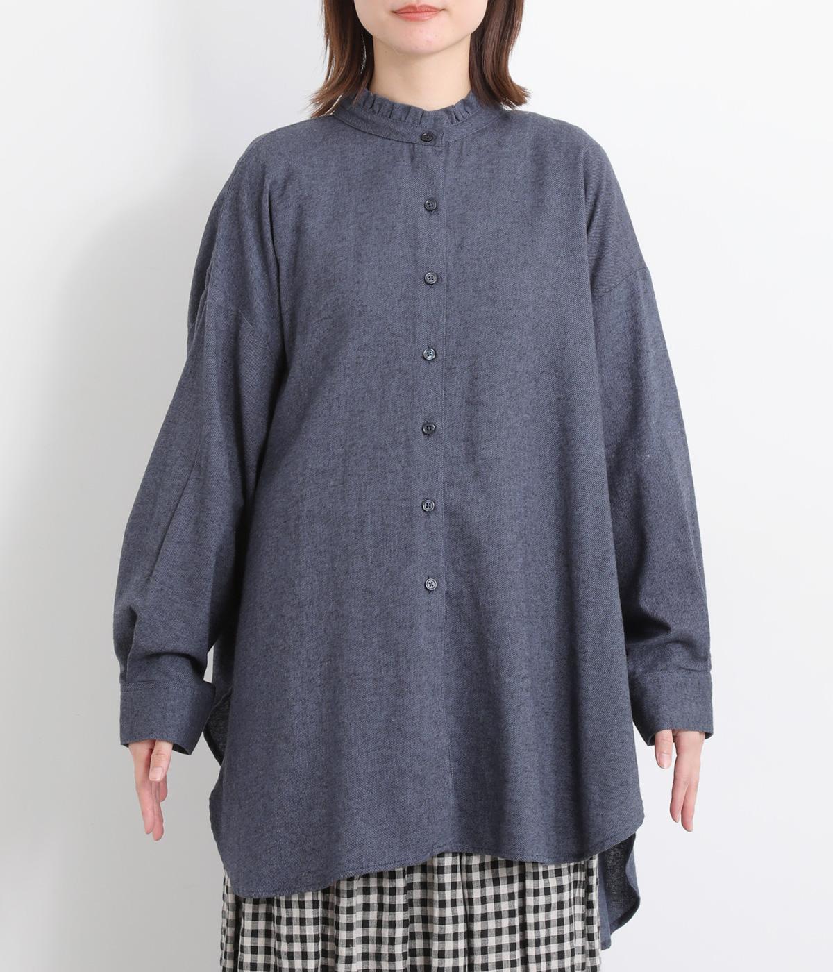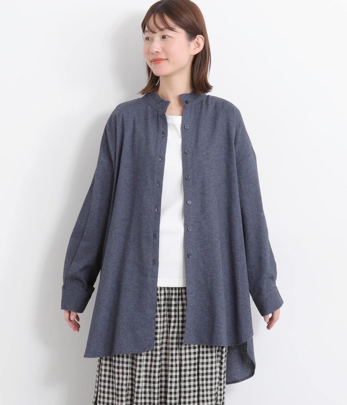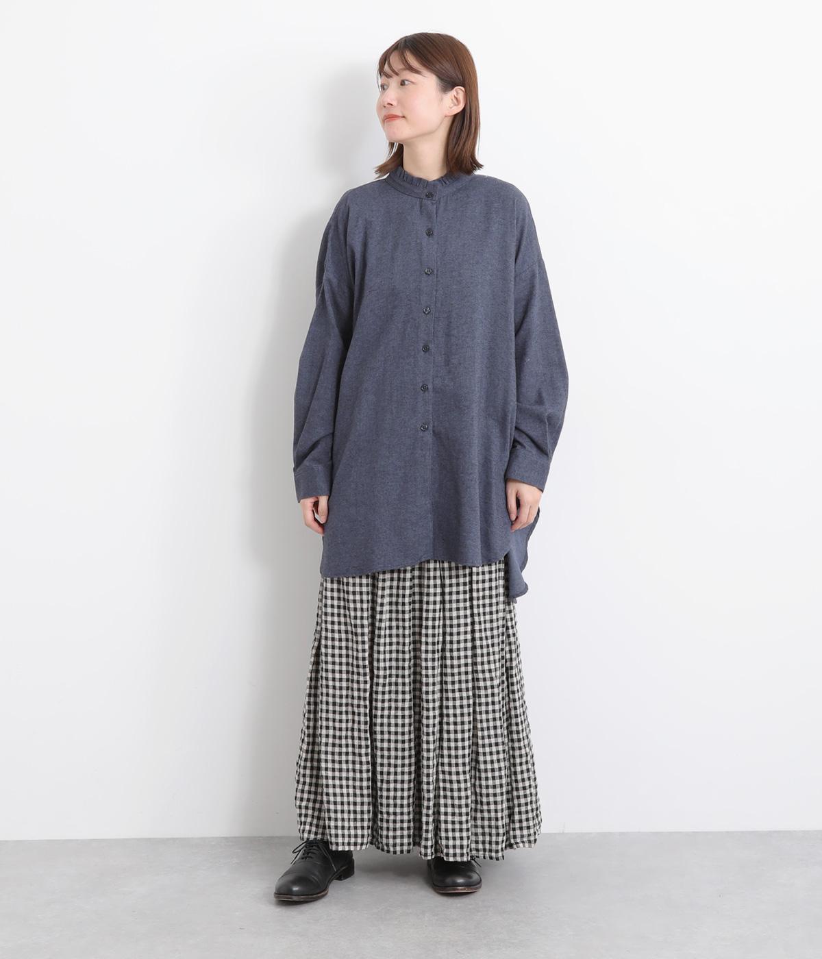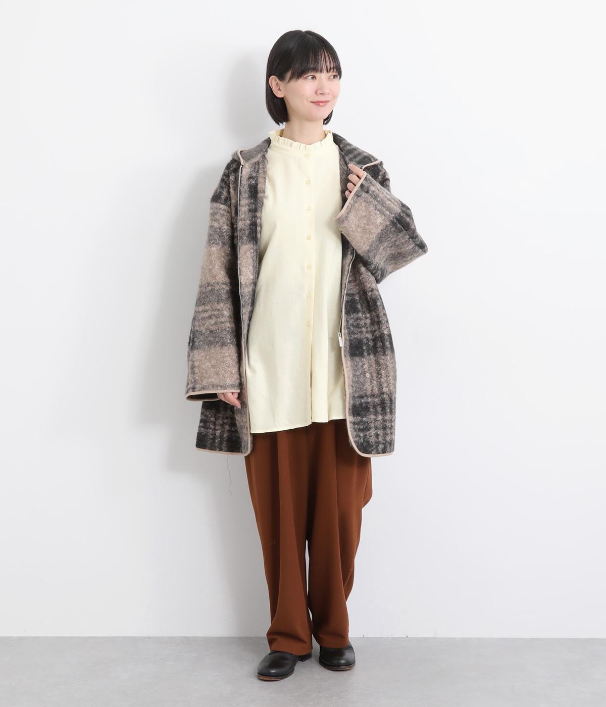 甘さを控えた襟元のフリルが、顔まわりにやわらかなニュアンスを加えるブラウスです。バックスタイルのギャザーはふんわりとした立体感を生み出し、後ろ姿にまで気を抜かない印象に仕上げています。