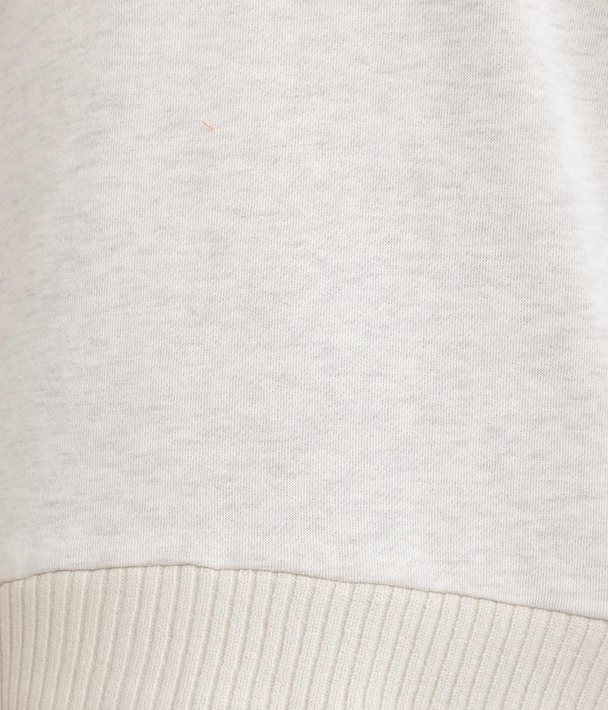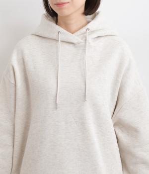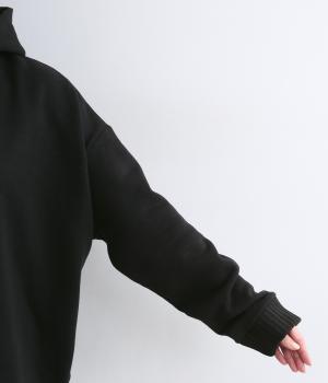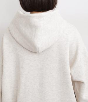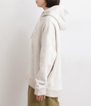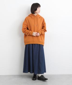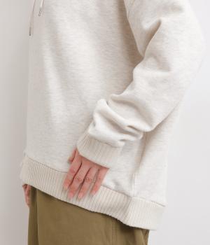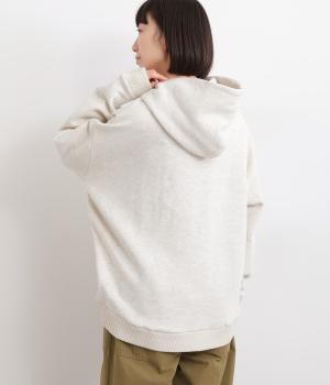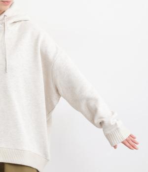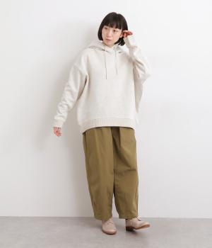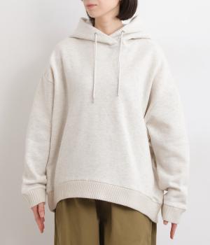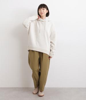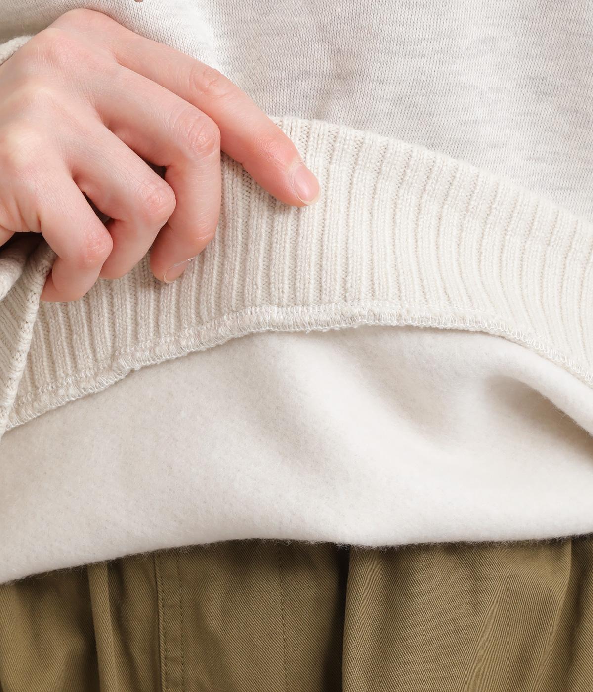くたっとやわらかなコットン混素材に、ほどよいハリを添えた心地よい生地です。肌あたりはなめらかで、裏起毛ならではのふんわりとしたぬくもりが広がります。軽やかなのにしっかりと頼れる着心地です。