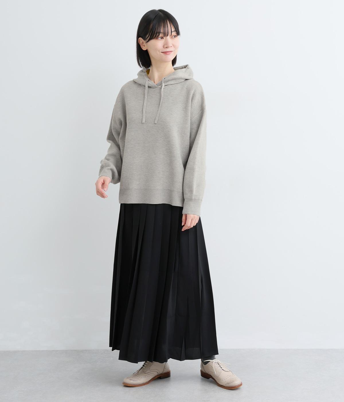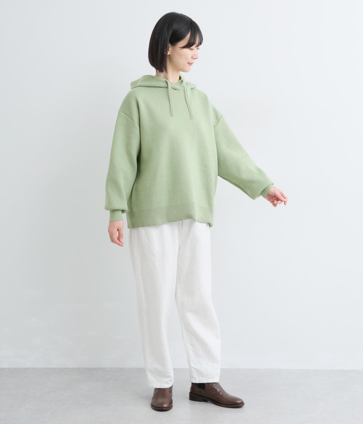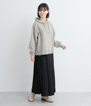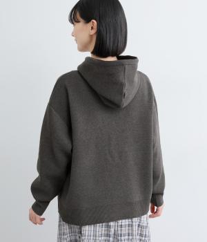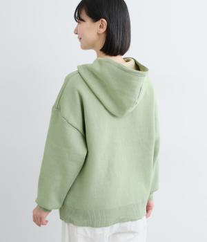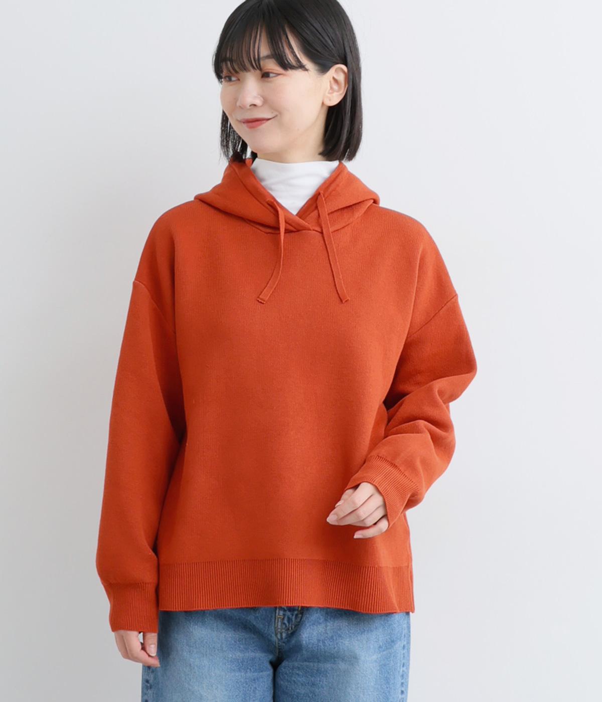 シンプルな形のフード付きプルオーバー。ちらりとのぞくフード内側の配色がほどよいアクセントに。袖と裾にはリブを施し、着まわしやすい一着です。