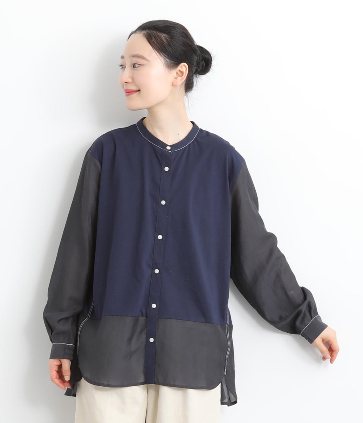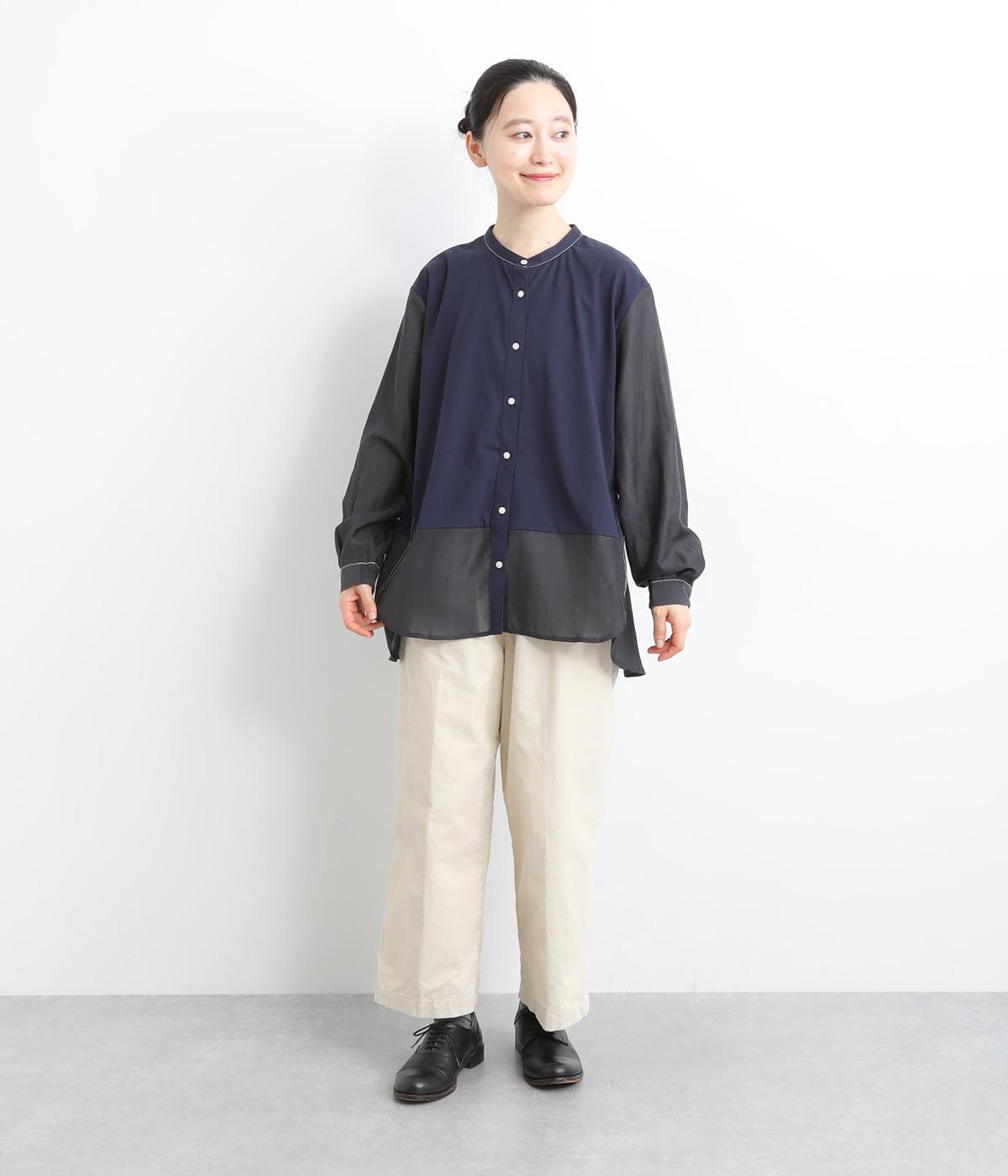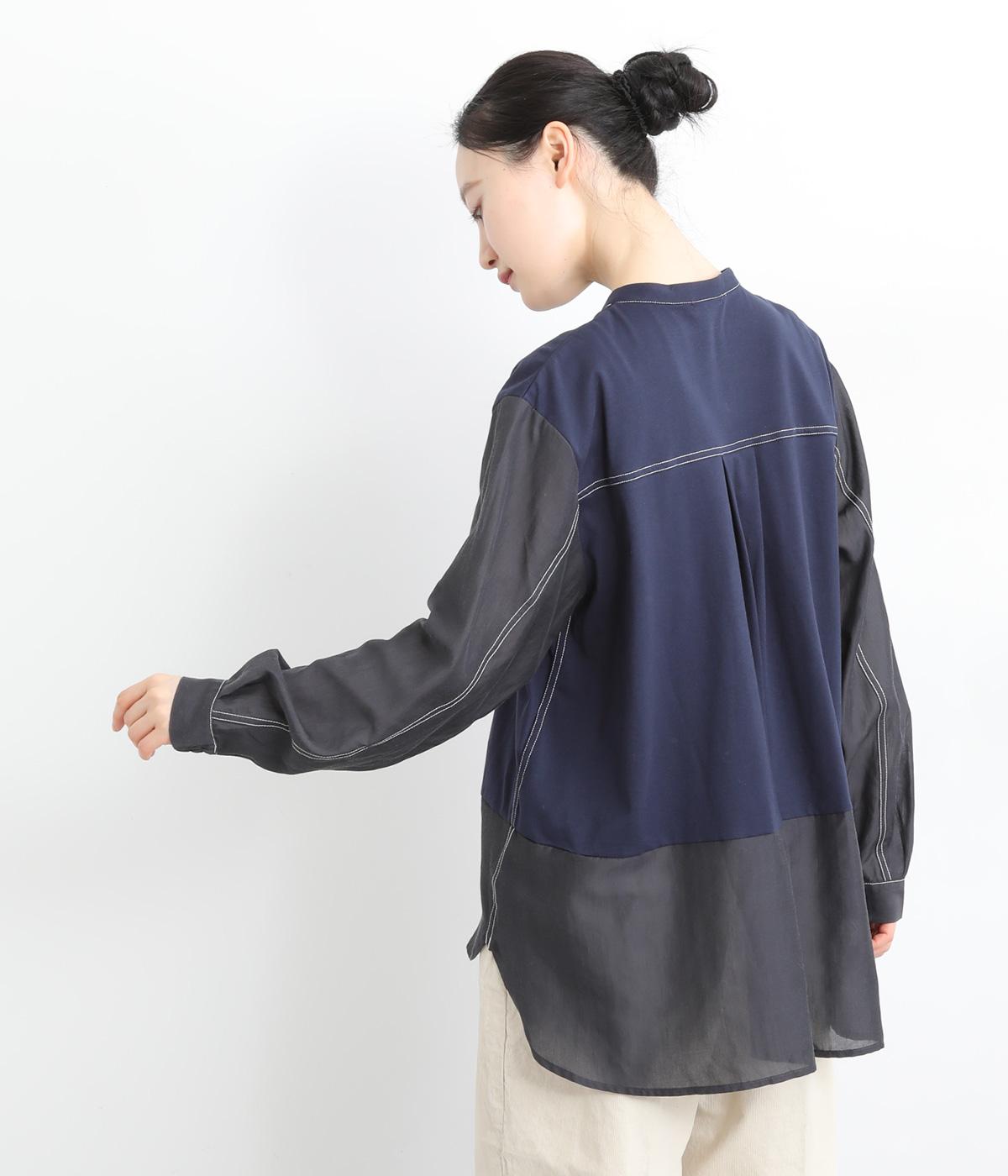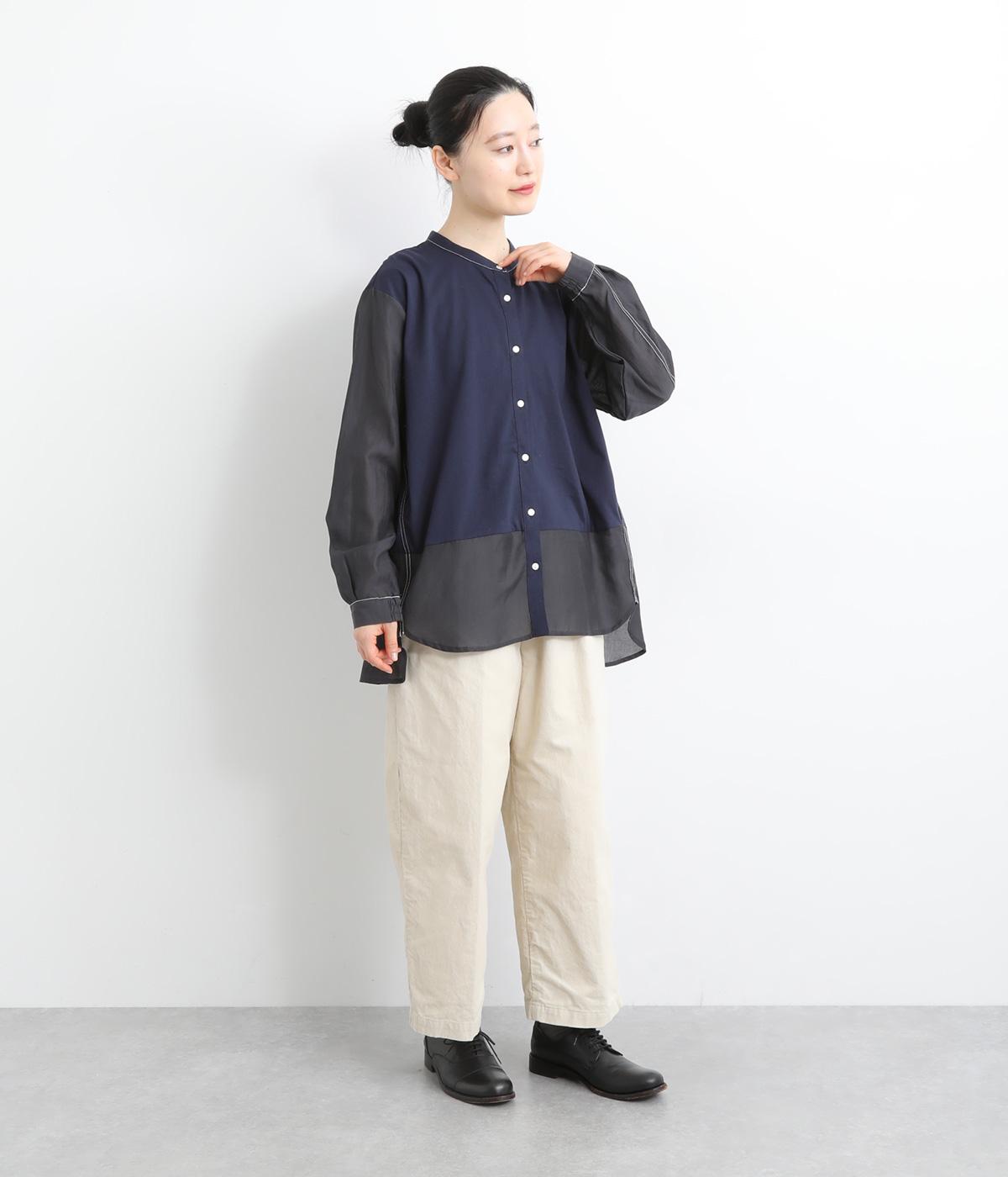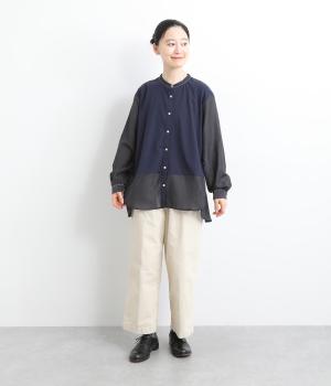 異素材を配色ステッチでバランスよくまとめた一枚。ノーカラーで顔まわりはすっきりと仕上げ、前後差のある裾がほどよい抜け感を演出します。シンプルながら、どこかこなれた印象を与えるシャツです。