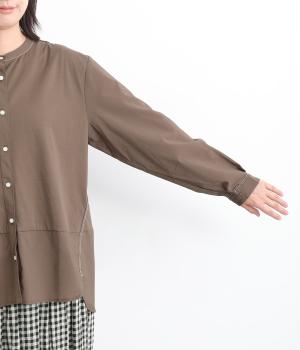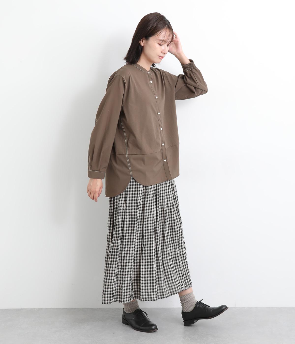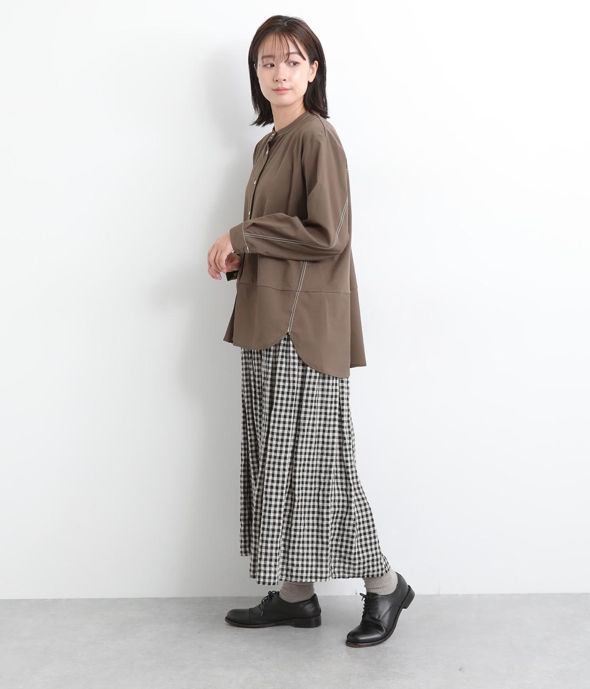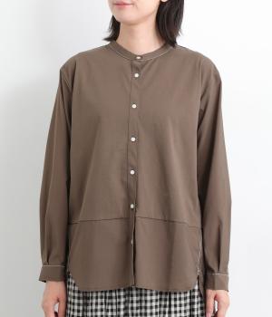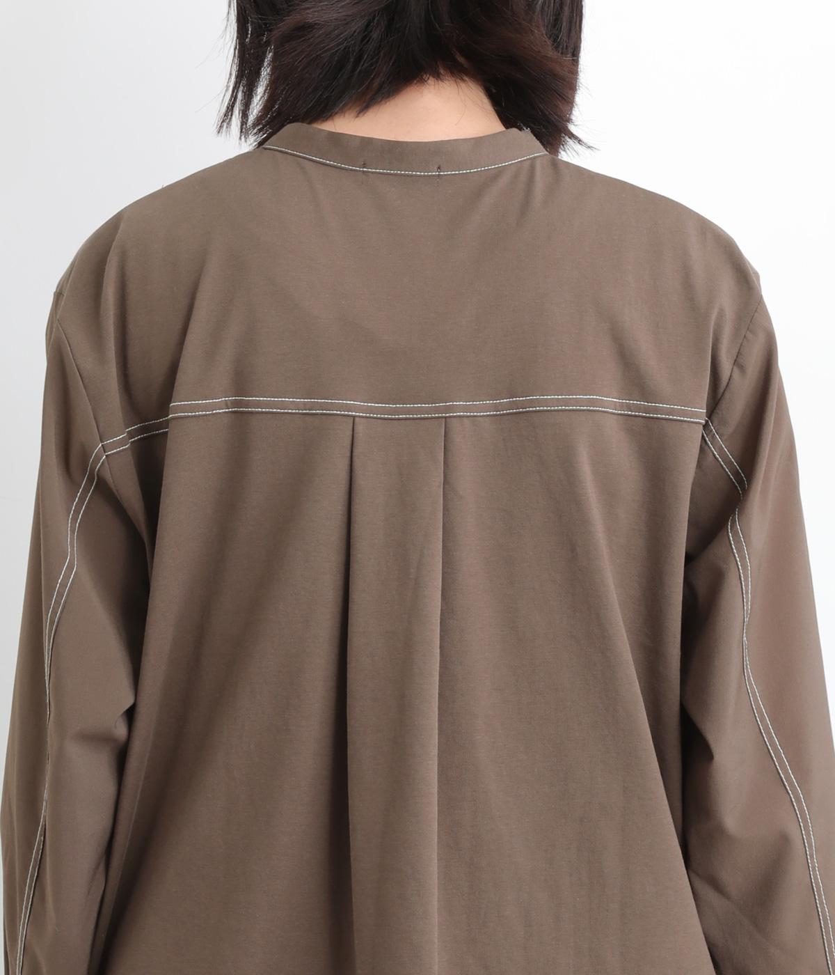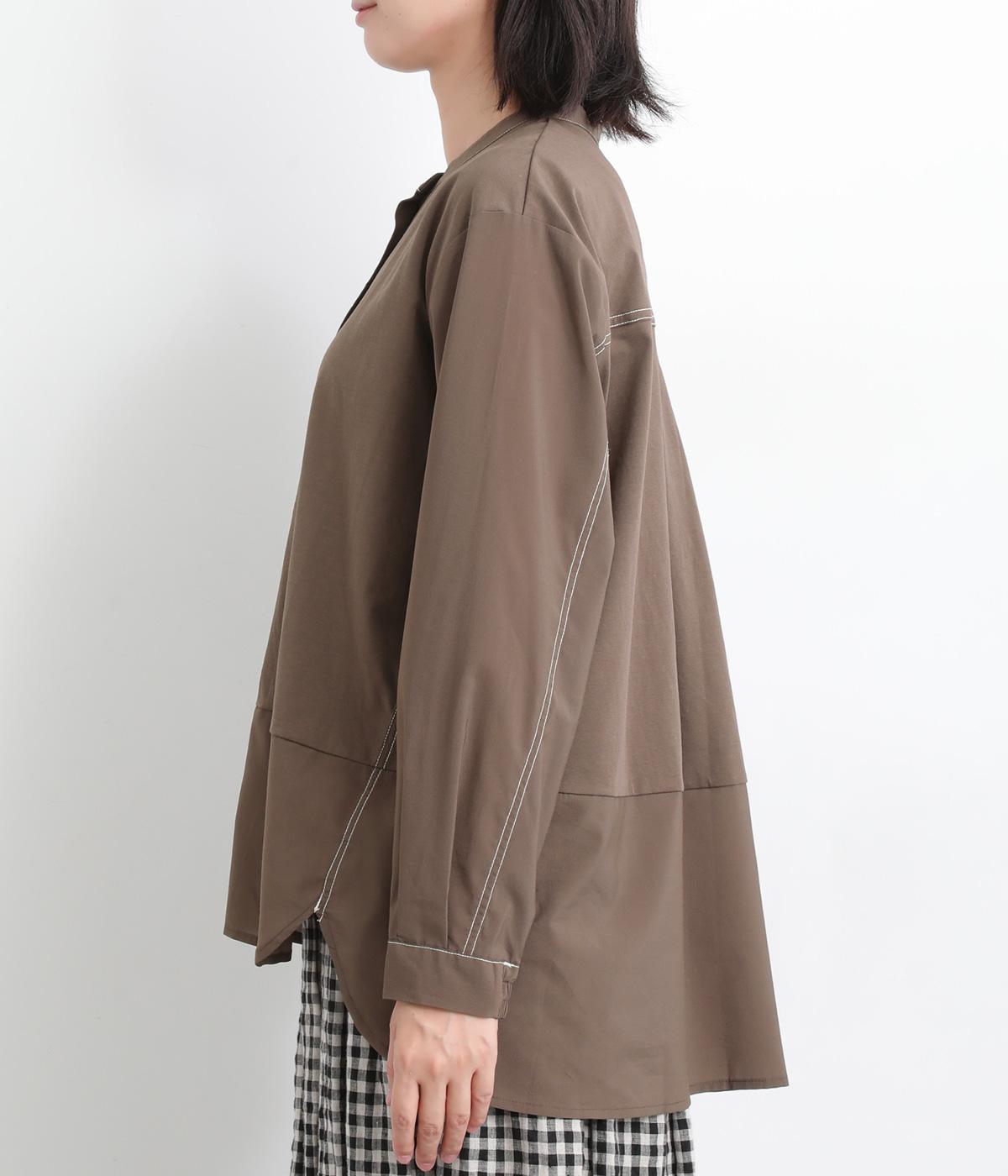 異素材を配色ステッチでバランスよくまとめた一枚。ノーカラーで顔まわりはすっきりと仕上げ、前後差のある裾がほどよい抜け感を演出します。シンプルながら、どこかこなれた印象を与えるシャツです。
