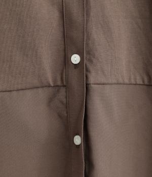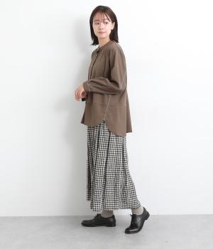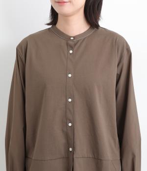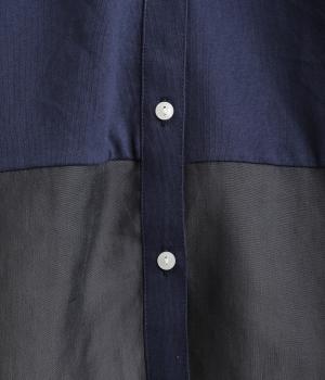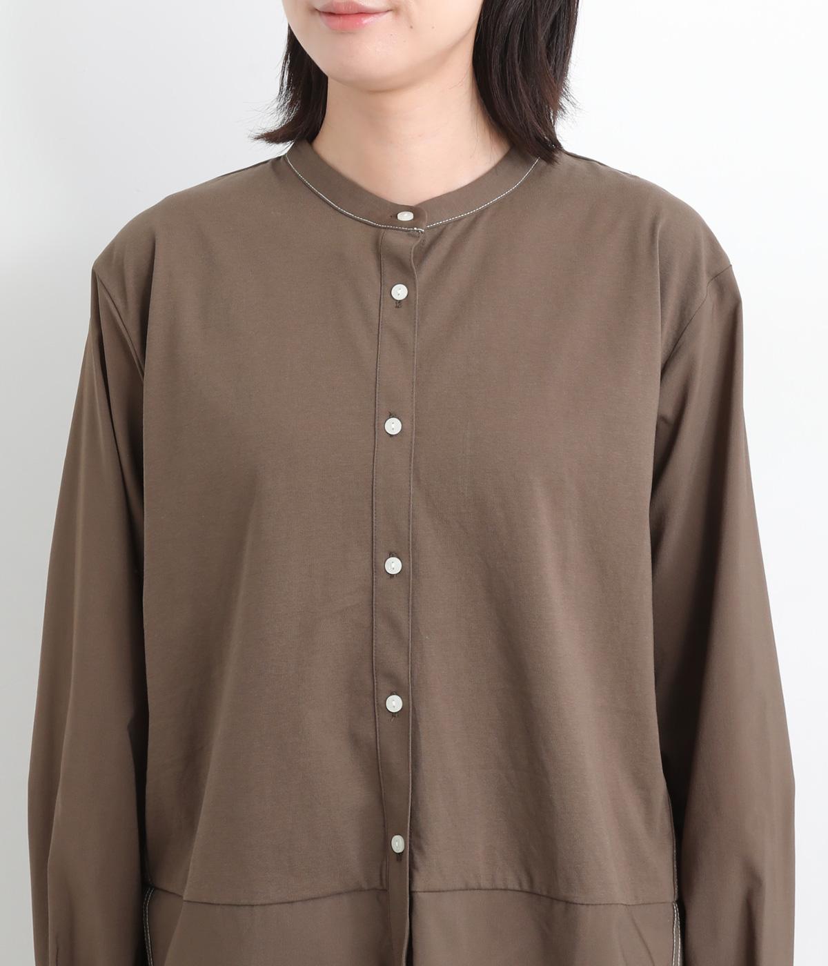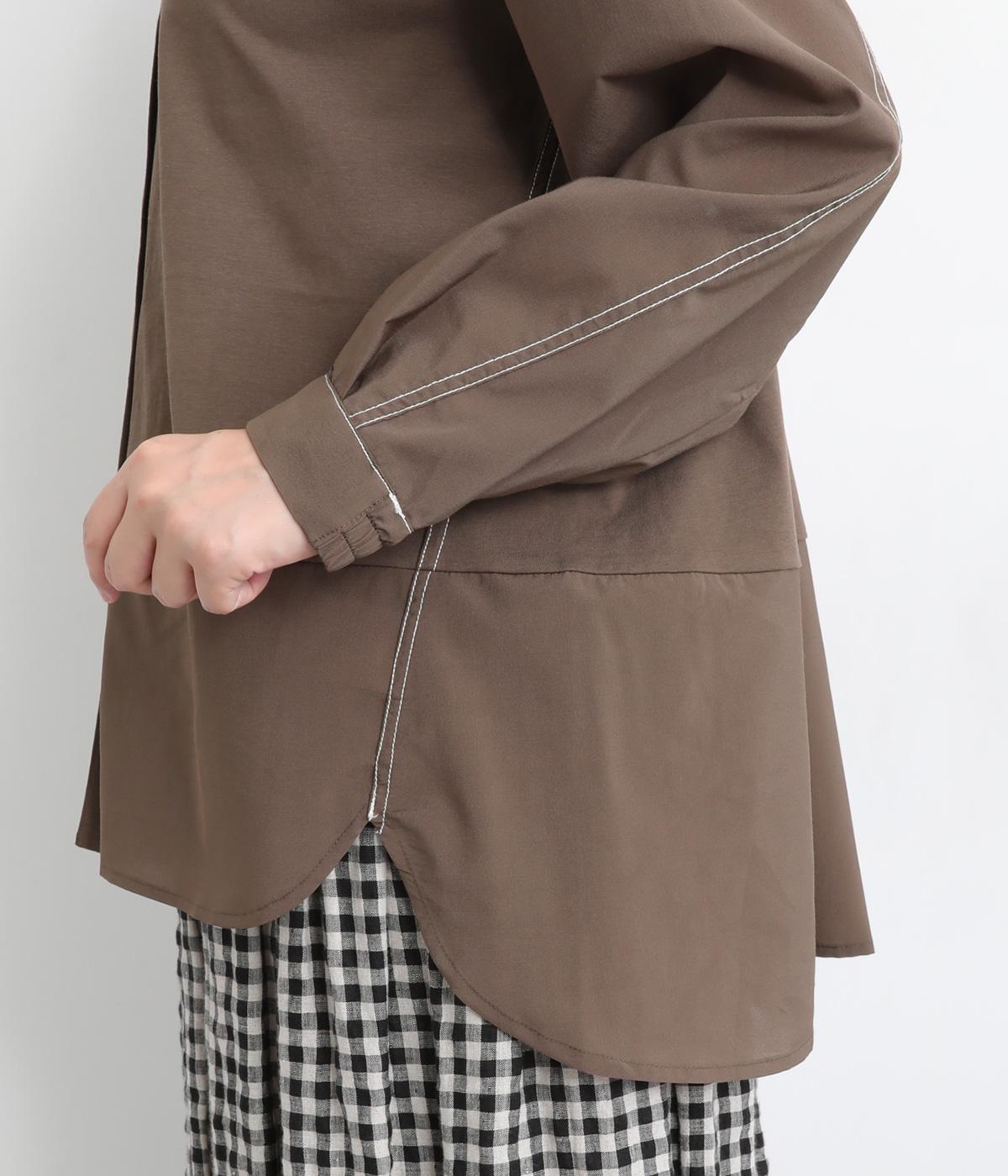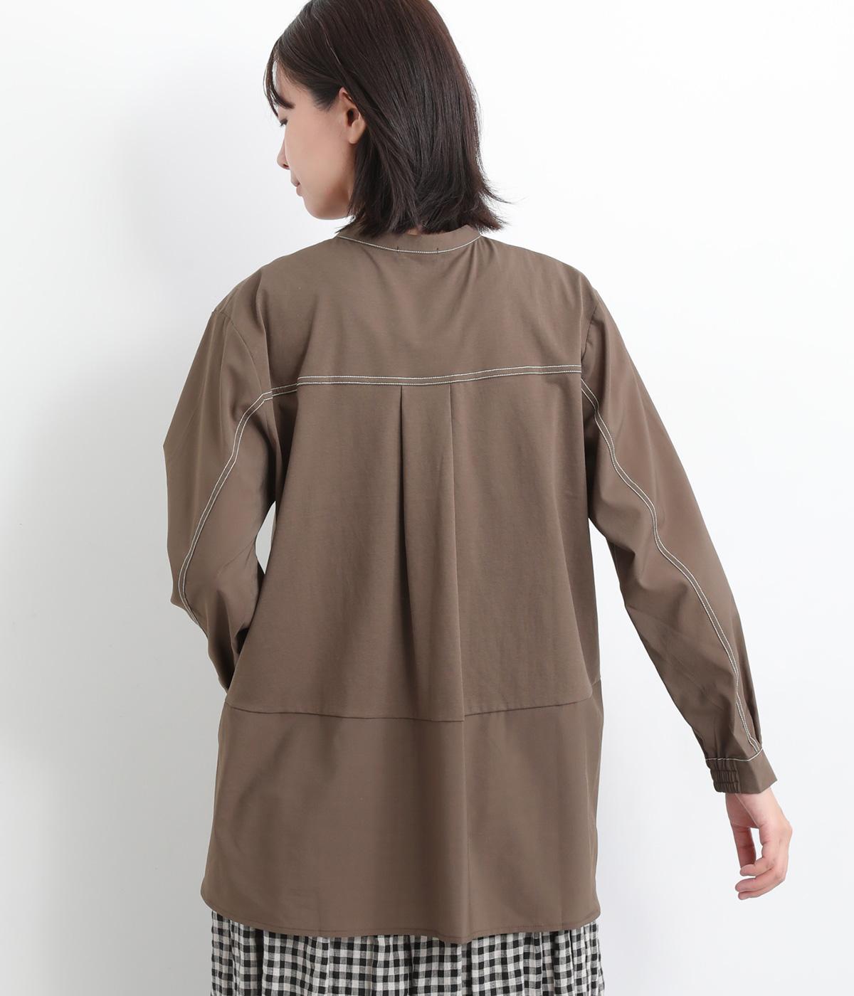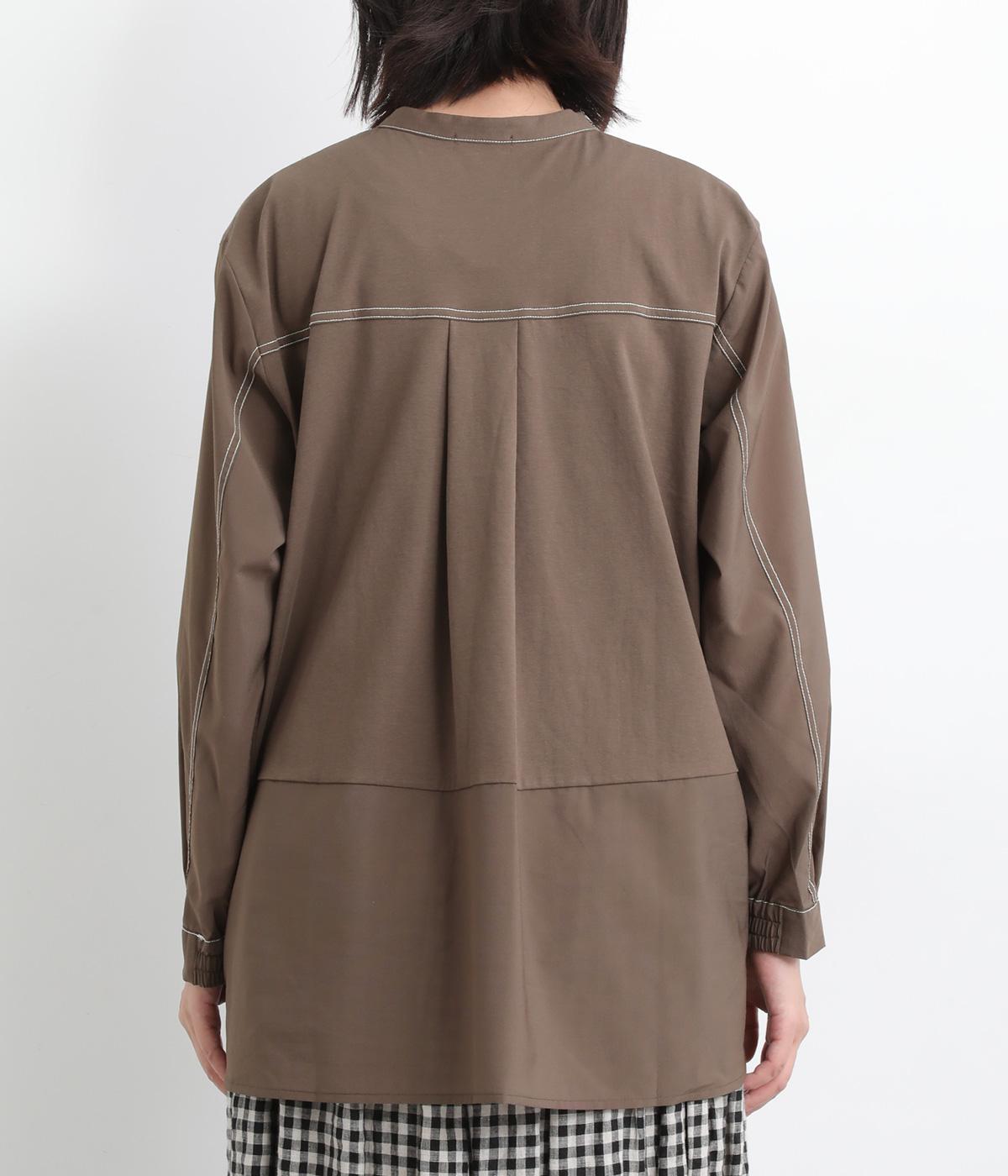 異素材を配色ステッチでバランスよくまとめた一枚。ノーカラーで顔まわりはすっきりと仕上げ、前後差のある裾がほどよい抜け感を演出します。シンプルながら、どこかこなれた印象を与えるシャツです。