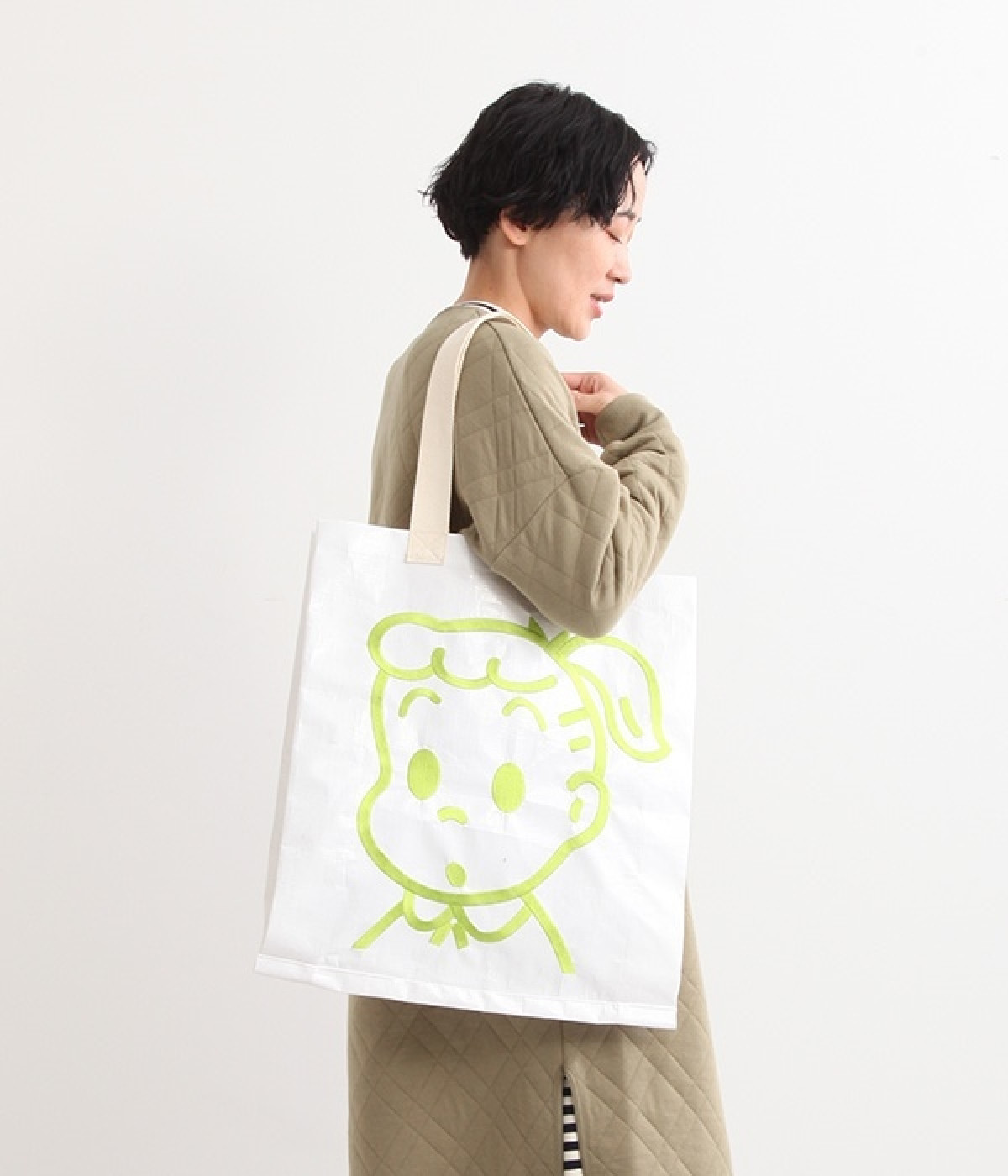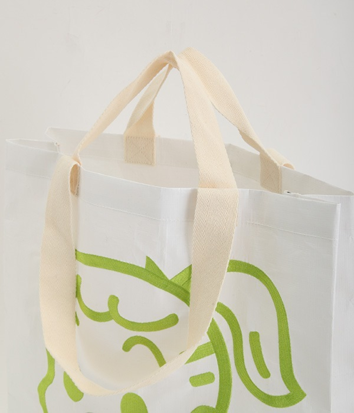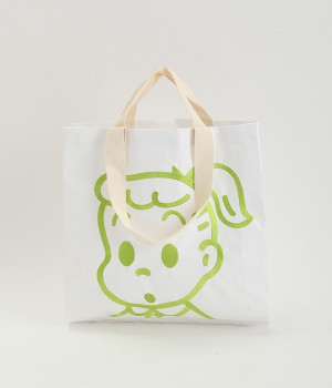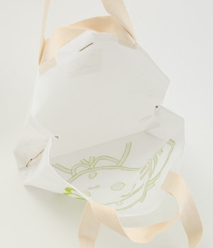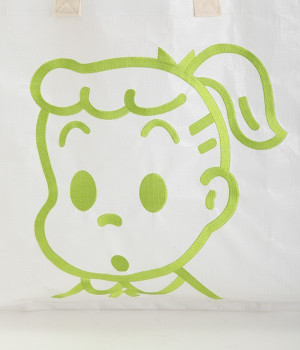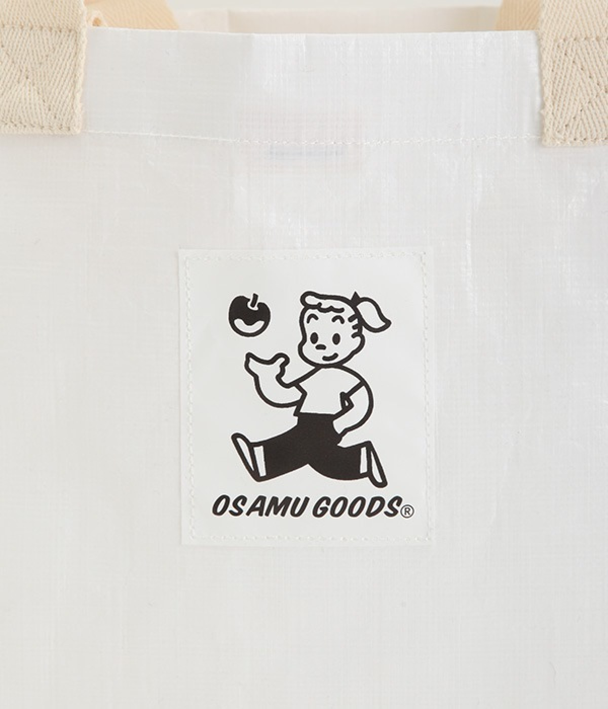 レジャーシートのような丈夫なポリエチレン素材をベースにしたOSAMUGOODSのバッグです。大きく刺しゅうされたワントーンカラーのイラストがポイント。大容量サイズのトートバッグなので、ジムバッグにしたり、マルシェバッグにしたりと、大活躍。持ち手は肩掛けにちょうど良い長さと手持ち用の短い持ち手をつけ、機能性にもこだわりました。