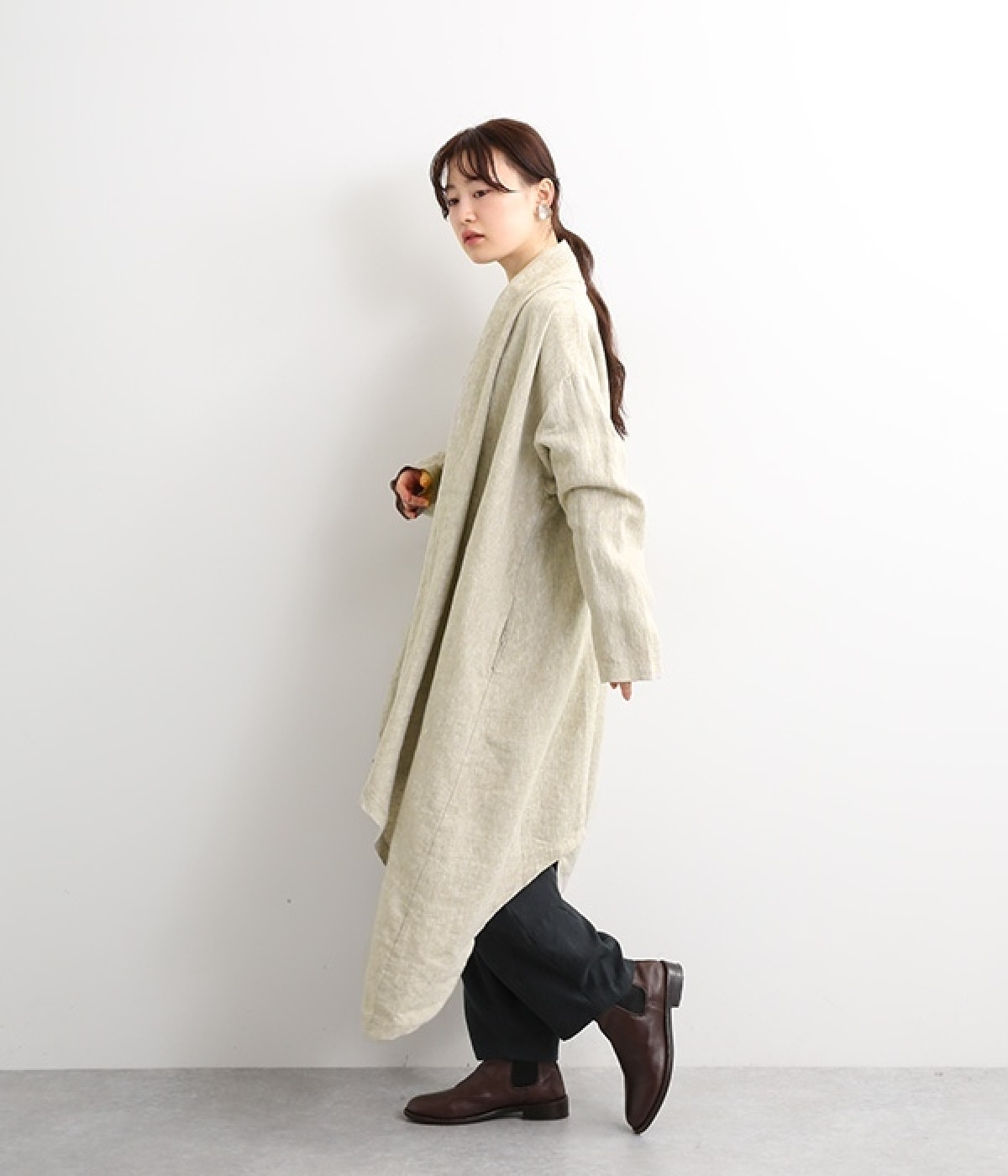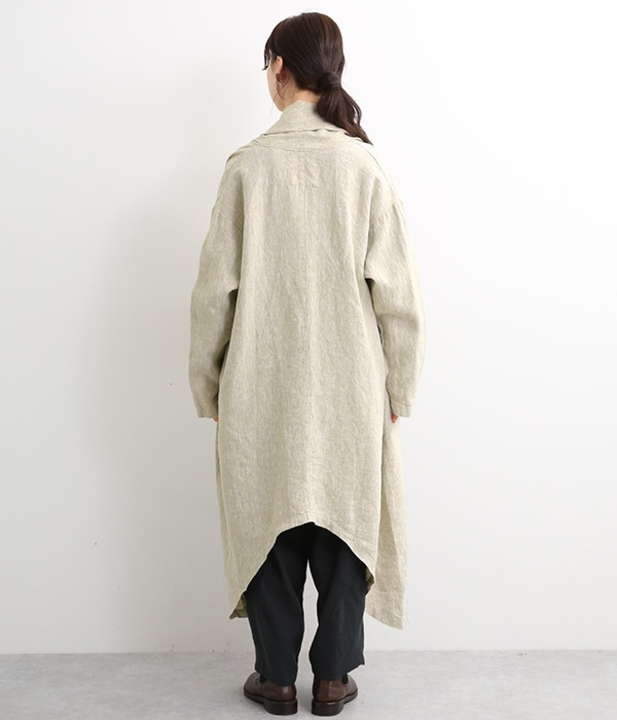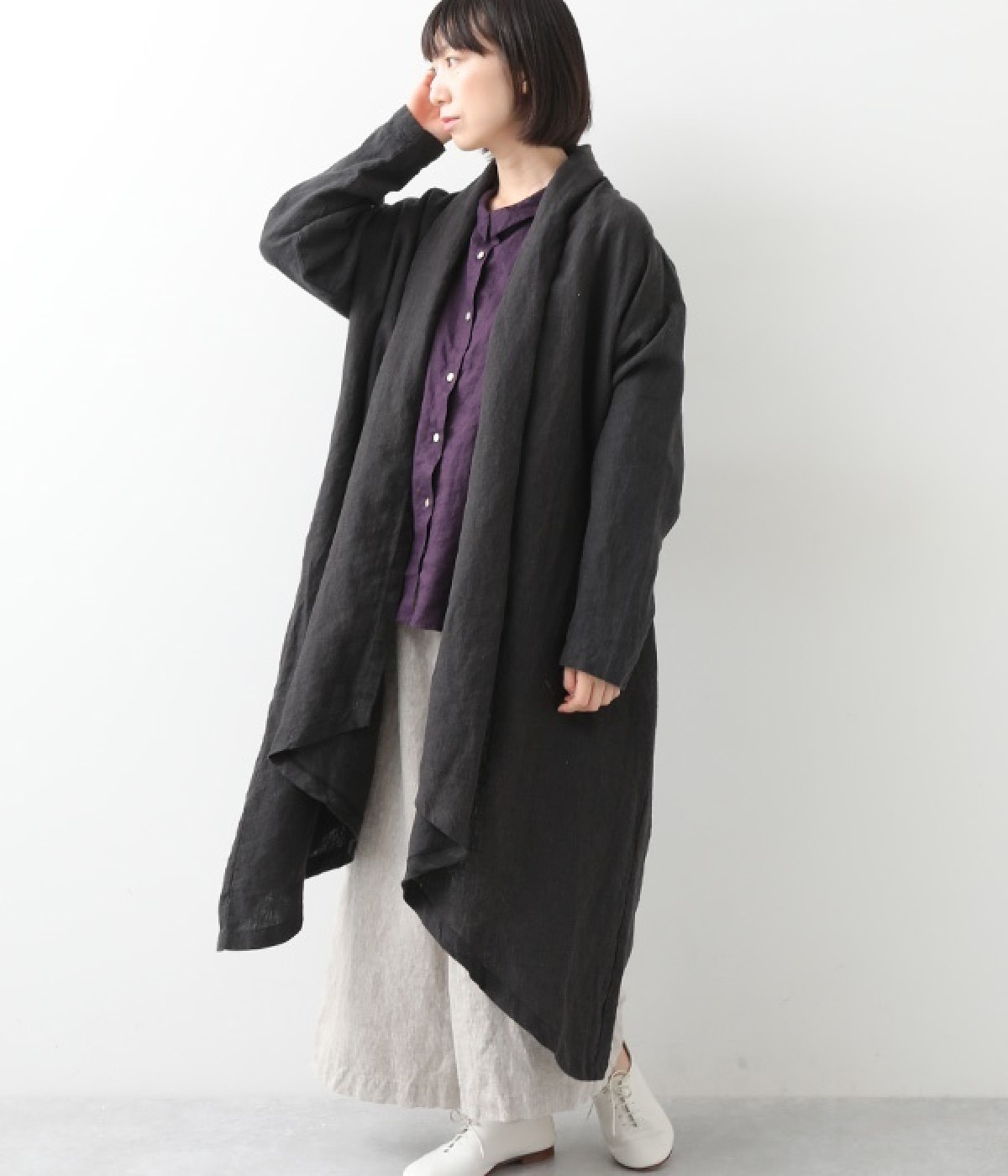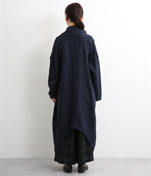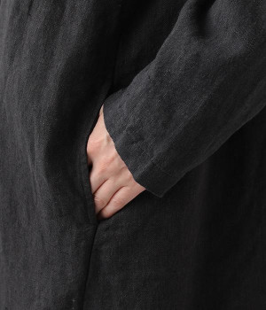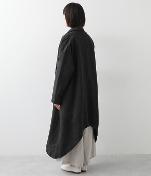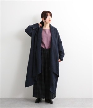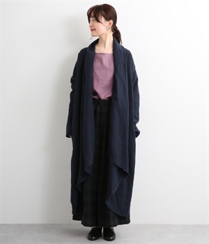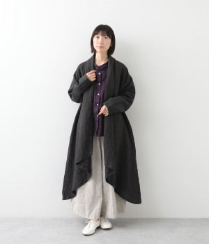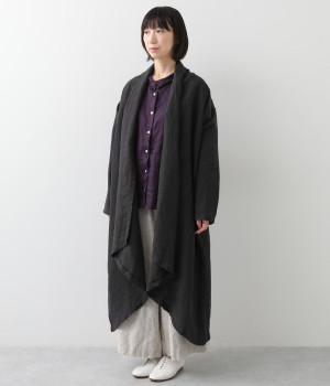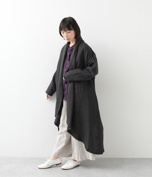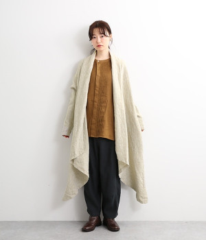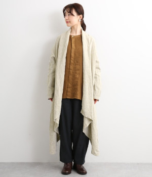 首まわりに布がたまるように設計された、こなれたニュアンスあふれるガウンコートです。ボタンレスの着流しタイプで、裾へ向かうにつれて表情を増すドレープがとてもリラクシーで上品。ふっくらと編み立てたリネンの風合いも大人の余裕を演出してくれます。レイヤードのプラスワンとしても、サイドポケット付きなので外出用のライトアウターとしてもぴったり。気軽に重ねられて着こなしの幅が広がる一着です。