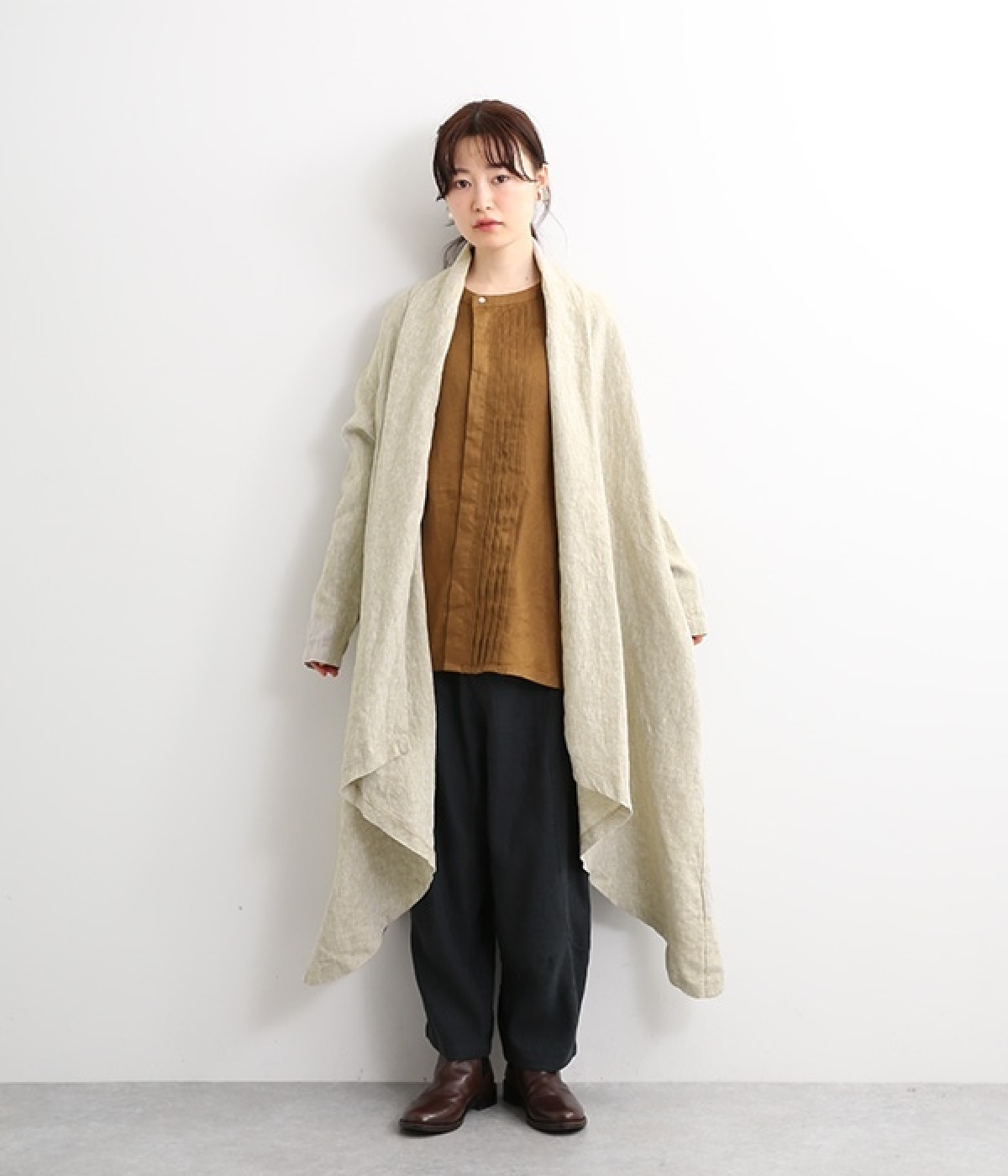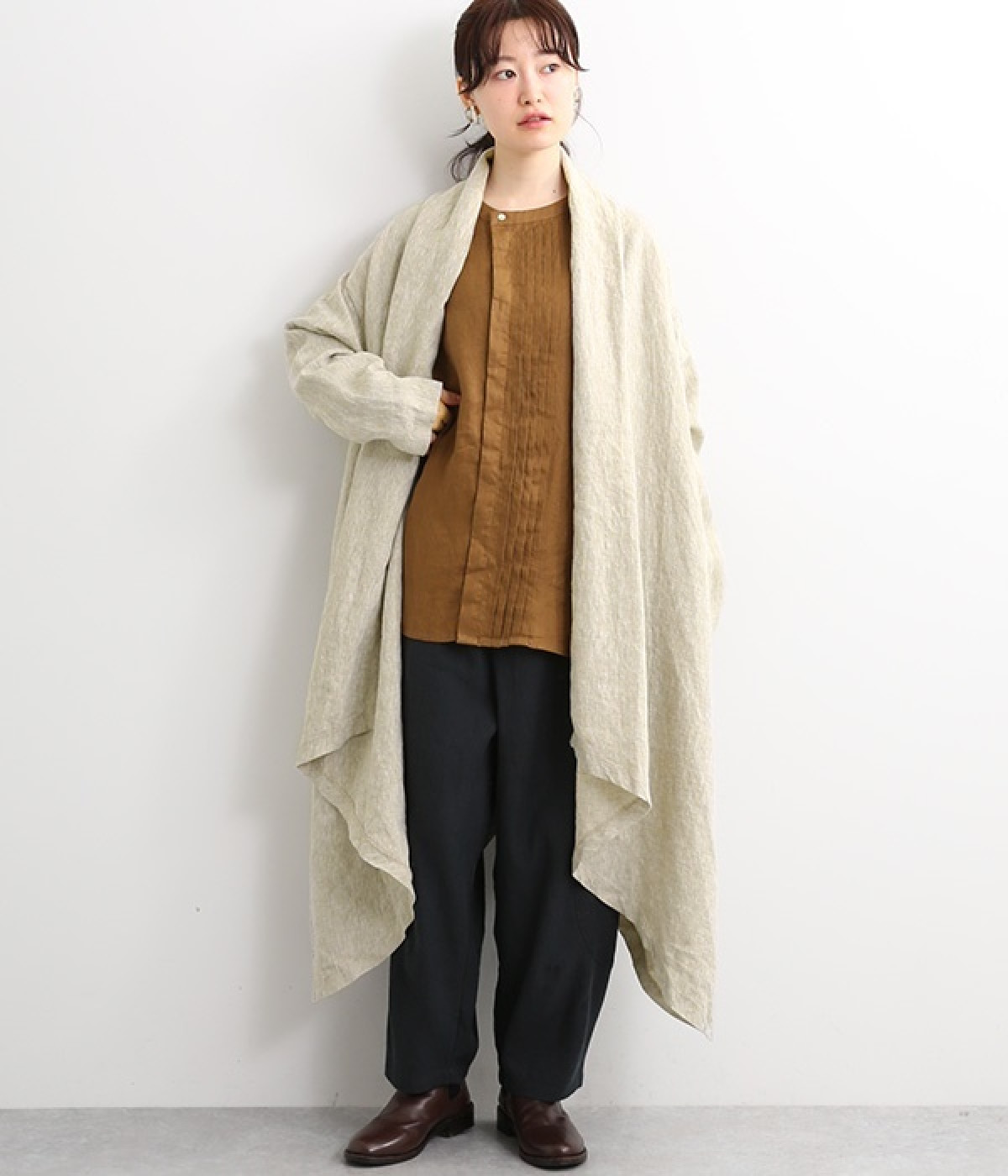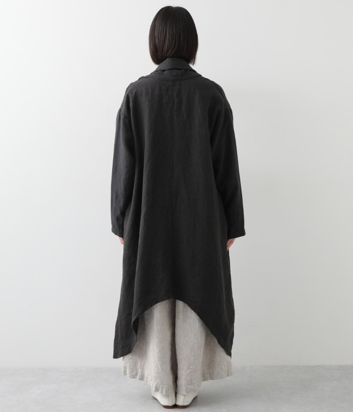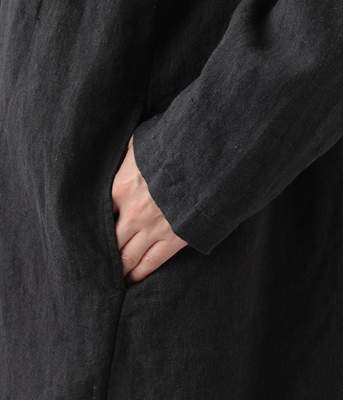 首まわりに布がたまるように設計された、こなれたニュアンスあふれるガウンコートです。ボタンレスの着流しタイプで、裾へ向かうにつれて表情を増すドレープがとてもリラクシーで上品。ふっくらと編み立てたリネンの風合いも大人の余裕を演出してくれます。レイヤードのプラスワンとしても、サイドポケット付きなので外出用のライトアウターとしてもぴったり。気軽に重ねられて着こなしの幅が広がる一着です。