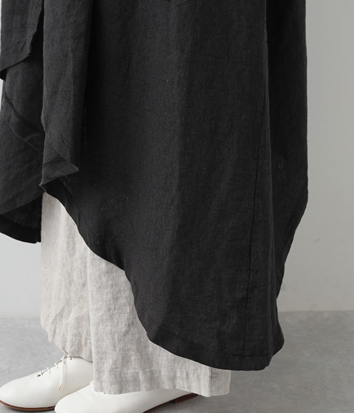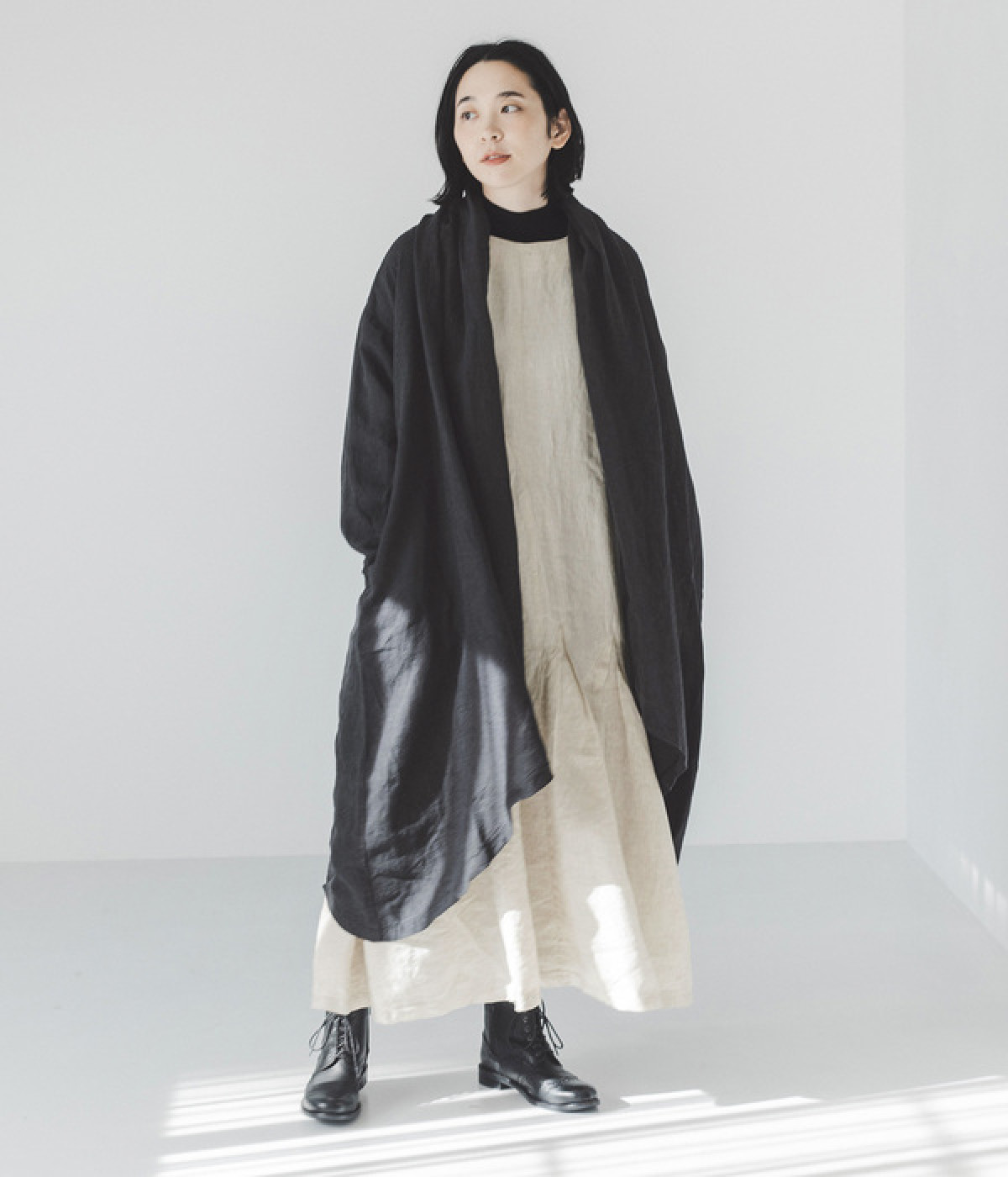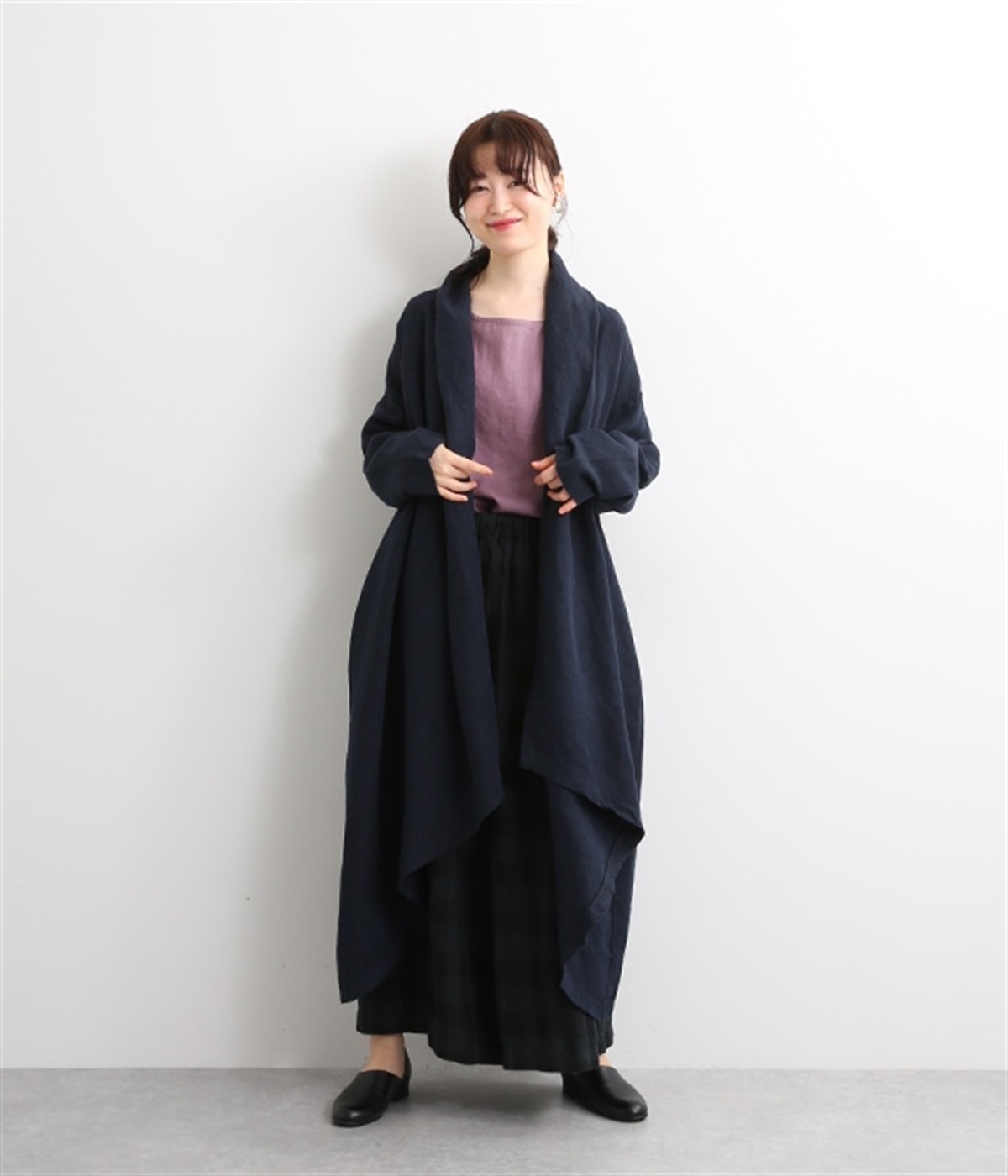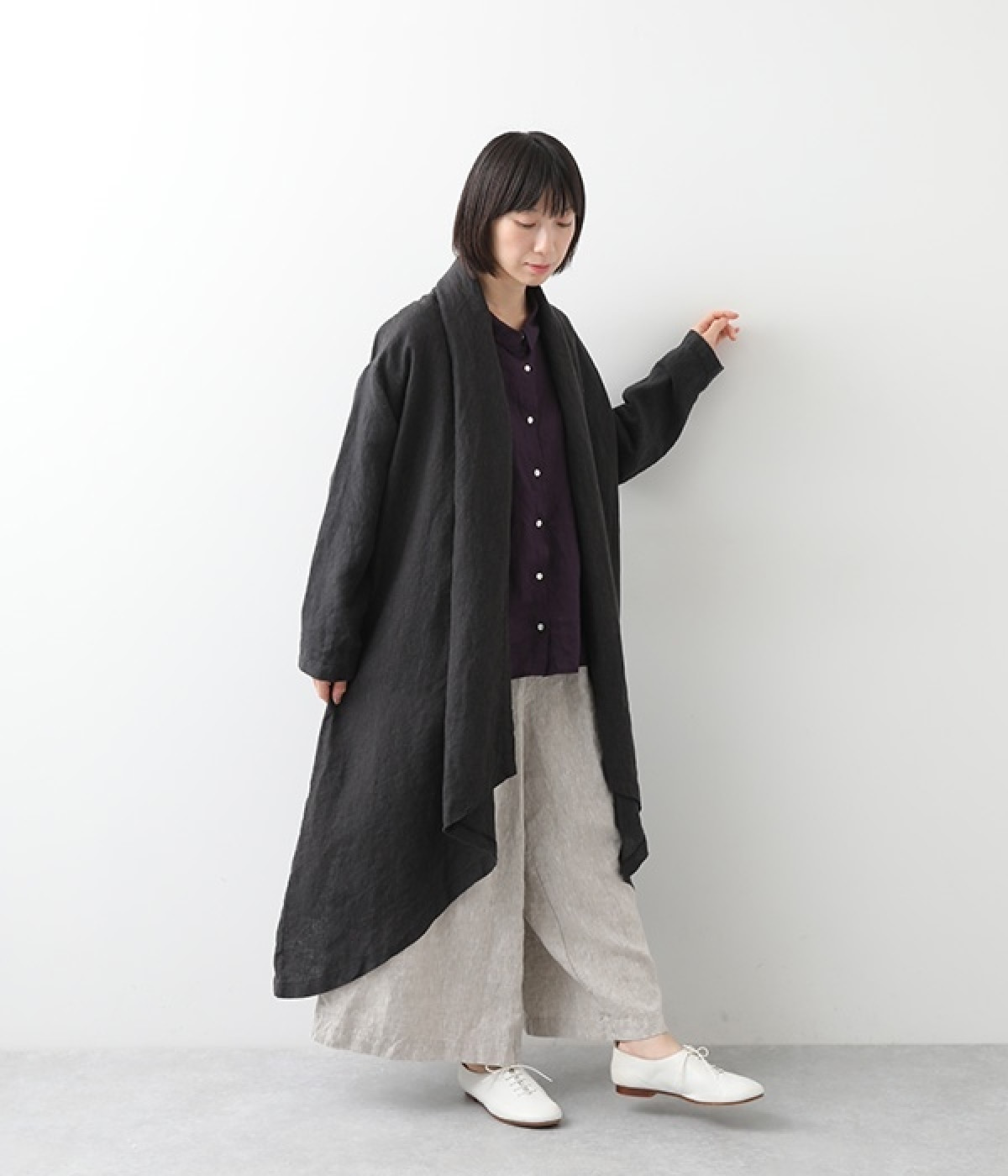 首まわりに布がたまるように設計された、こなれたニュアンスあふれるガウンコートです。ボタンレスの着流しタイプで、裾へ向かうにつれて表情を増すドレープがとてもリラクシーで上品。ふっくらと編み立てたリネンの風合いも大人の余裕を演出してくれます。レイヤードのプラスワンとしても、サイドポケット付きなので外出用のライトアウターとしてもぴったり。気軽に重ねられて着こなしの幅が広がる一着です。