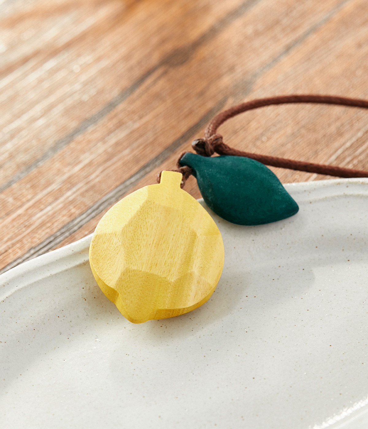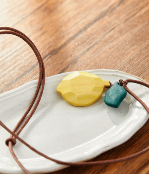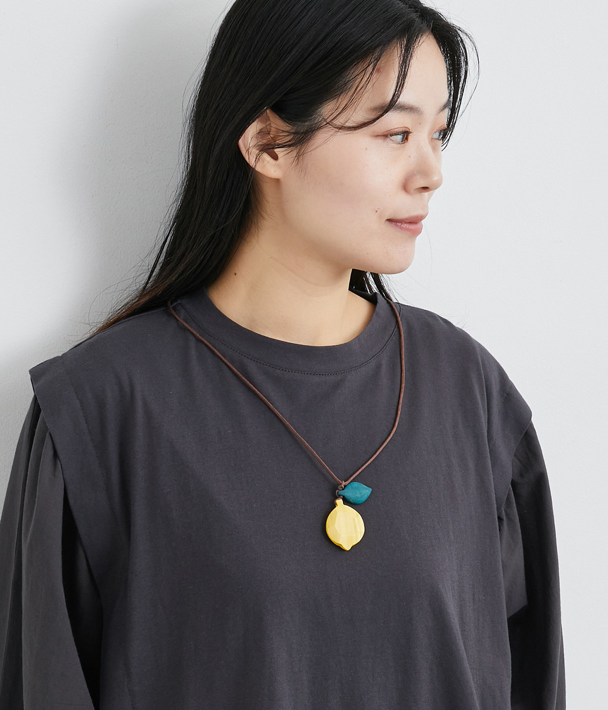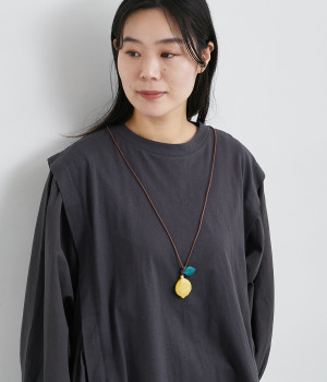 レモンのモチーフに多角カットで立体感をつけた、こだわりの光るデザイン。ひもの結び目部分を動かすことで長さの調節ができるので、自在にアレンジしていただけます。シンプルな装いに大人の遊び心を添えるアイテム。